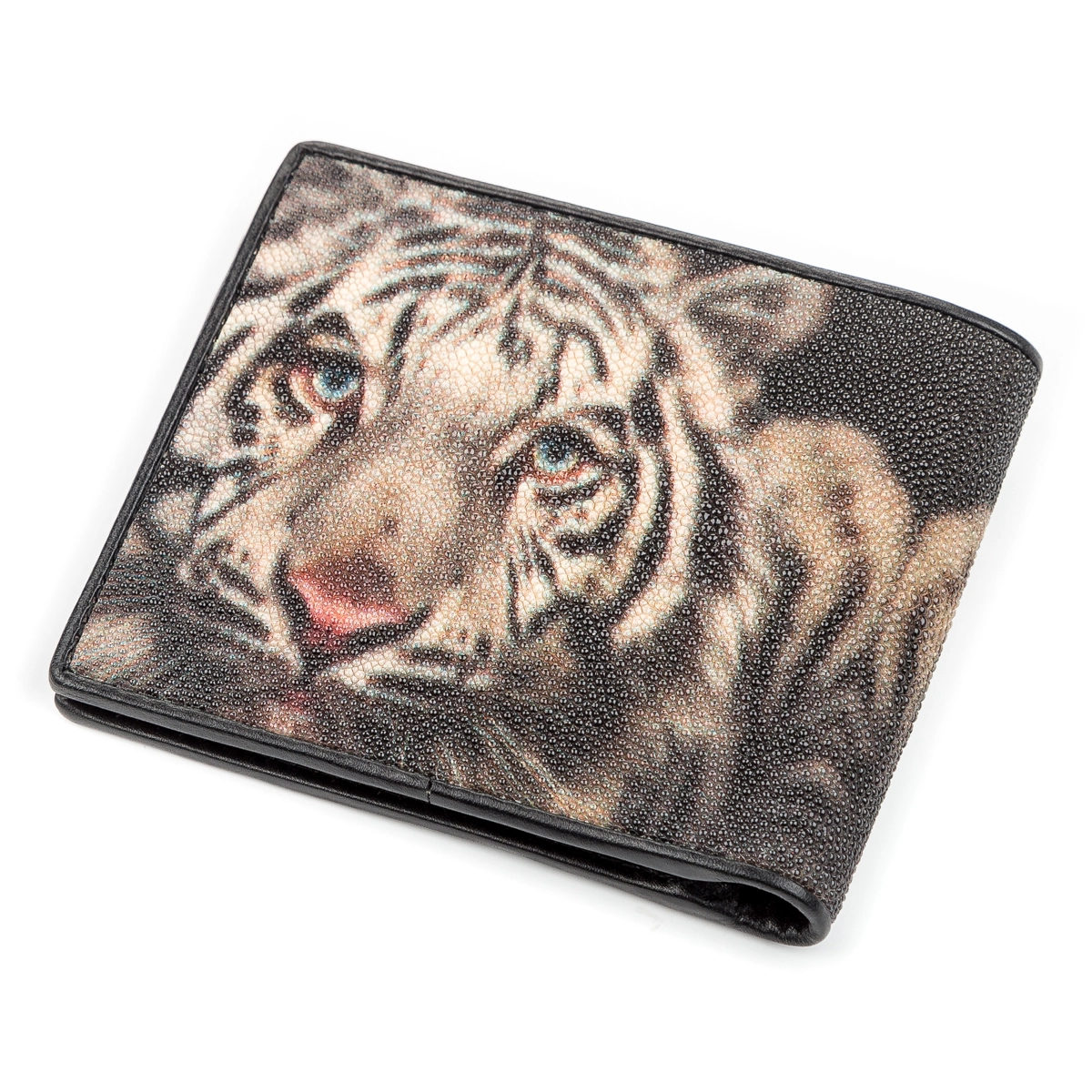 Превосходный кошелек из натуральной кожи морского ската, очень стойкой к износу, проколам, порезам, к разрывам и даже к огню. Аксессуар обшит черной гладкой натуральной кожей. Все пространство кожи покрыто сотнями мелких бугорков, разного размера, которые играют на свету, как небольшие бусинки. Внешний вид аксессуара, декорированный красивым рисунком тигра, с двух сторон. Благодаря кошельку из кожи морского ската Вы всегда будете в центре внимания, он отлично подчеркнет стиль и статус своего владельца.