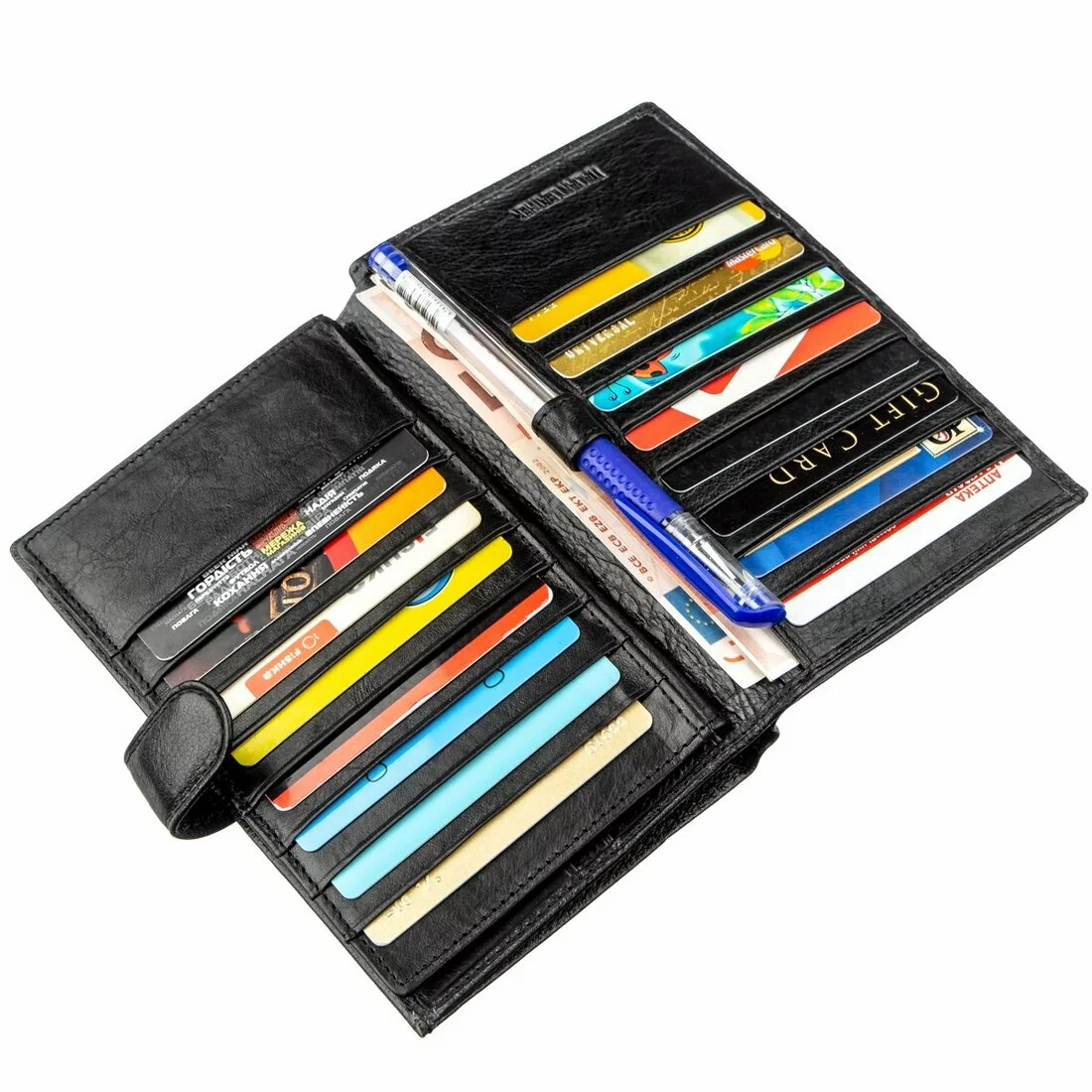 Современный и универсальный кошелек-визитница для делового человека, которому необходимо носить с собой много визиток или пластиковых карт. Выполнена визитница из натуральной высококачественной кожи черного цвета. Имеет кроме двадцати карманов для визиток, еще и большое отделение для документов, отделение для купюр и монетницу на молнии. Данный аксессуар очень удобен в эксплуатации и легко влезет в любую сумку или портфель. Вы можете приобрести данное изделие для себя или на подарок дорогому человеку, в любом случаи хозяин визитницы останется довольным. Упакован аксессуар в фирменную коробку.