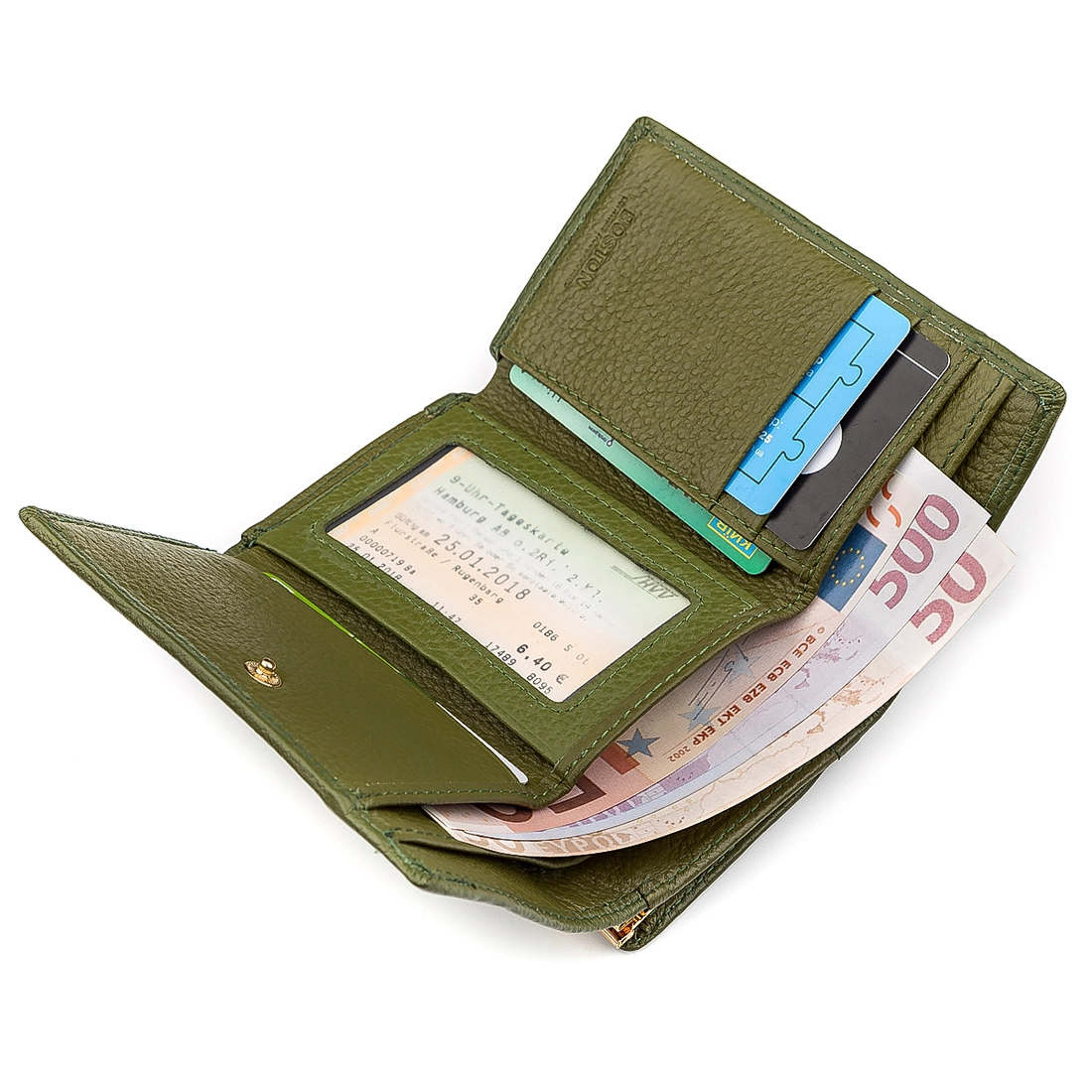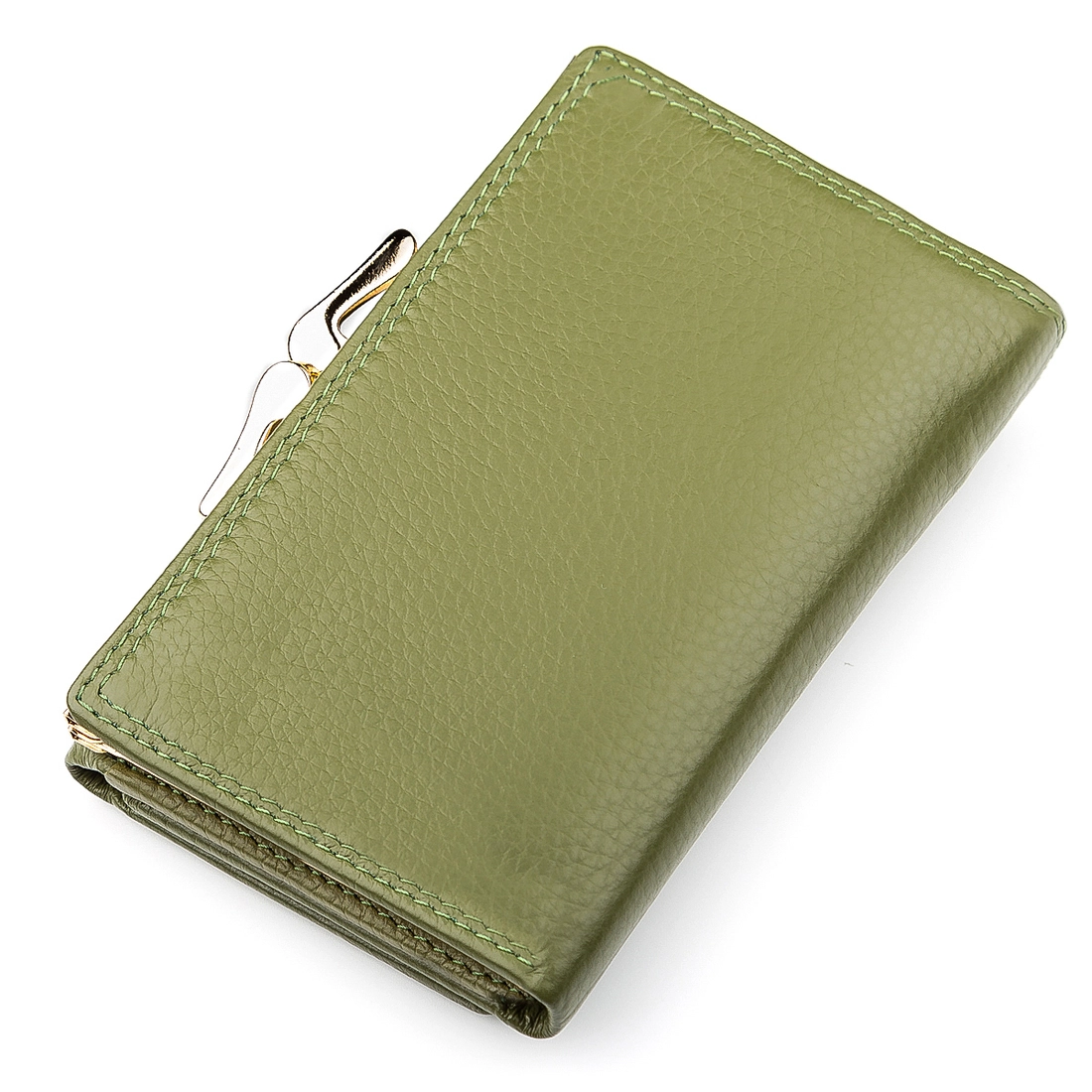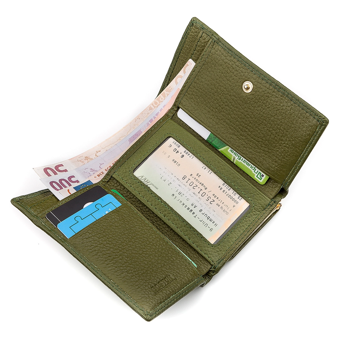 Приятный внешне и функциональный внутри, данный кошелек имеет небольшие размеры и привлекательный дизайн, выполненный в оливковом цветовом решении. Аксессуар приятно ложится в руку и не занимает много места в кармане и сумочке. Снаружи кошелек отделан натуральной кожей, а внутренние просторные отделения пошиты с текстиля. Также имеется и большая монетница, закрываемая на надежную защелку. Фурнитура крепкая и стильная, с оформлением под золото. Благодаря натуральным материалам, аксессуар приятен и долговечен в использовании.