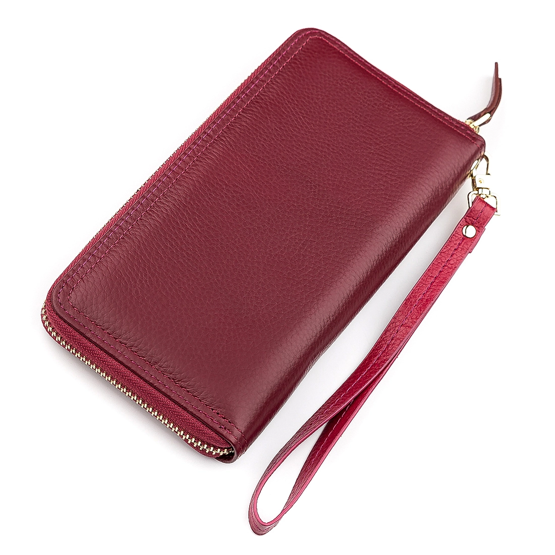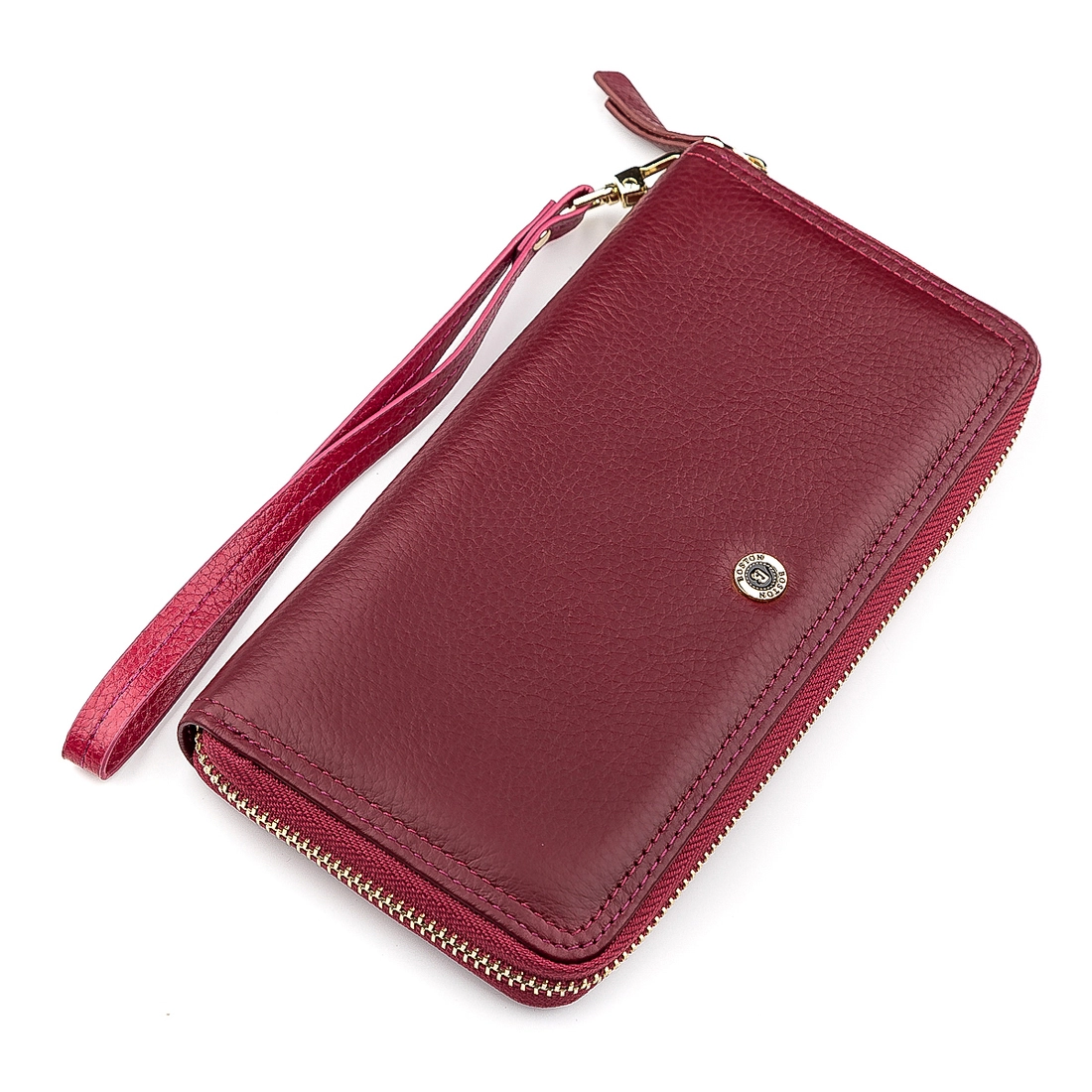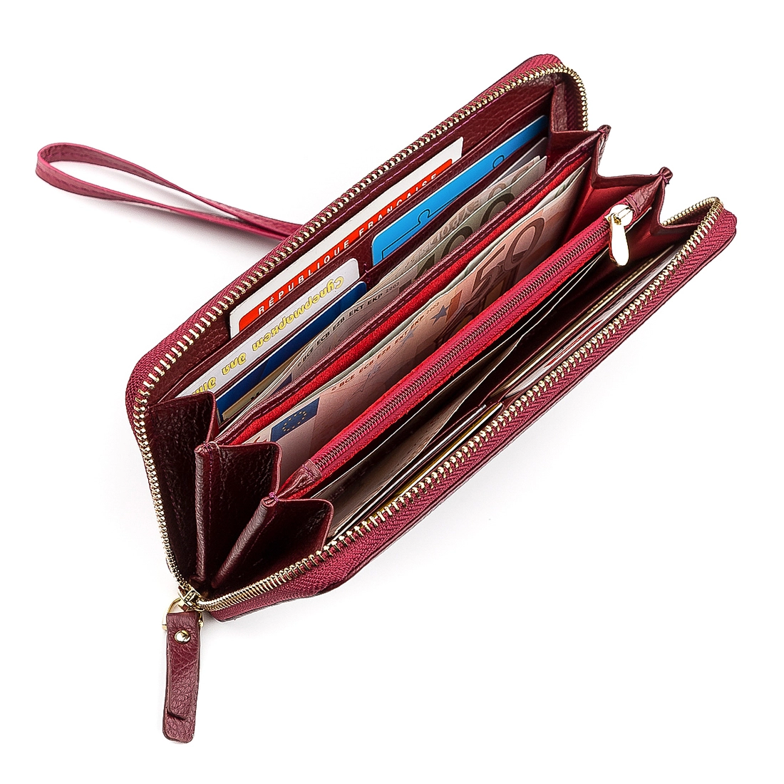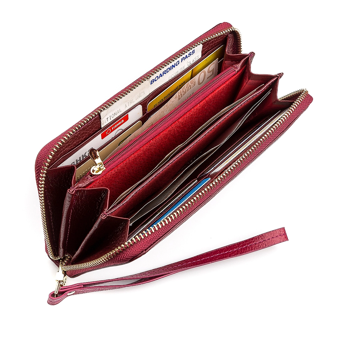Бордовый женский кошелек выполнен в очень красивом стиле с качественной, износостойкой кожи, которую дополняет текстильная подкладка. В комплектацию входит ремешок для руки, который очень красиво и стильно смотрится, не доставляя дискомфорта и раздражений на коже. Закрывается кошелек на молнию, которая надежно сохраняет содержимое, размещаемое в больших отделениях, кармане для монет и секциях для банковских карт. Дополняет прекрасные характеристики и привлекательная фирменная коробка.