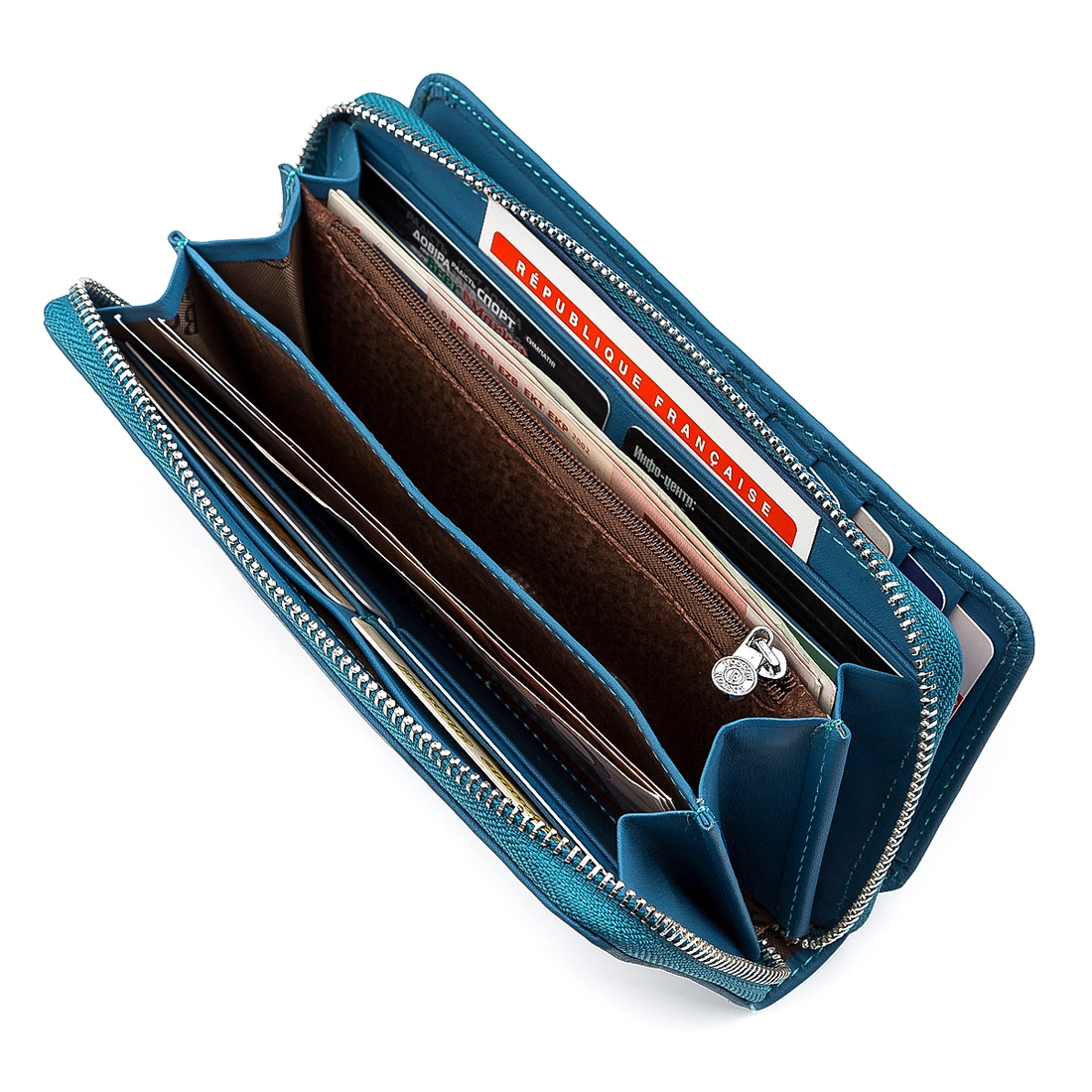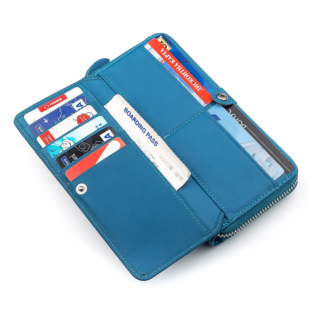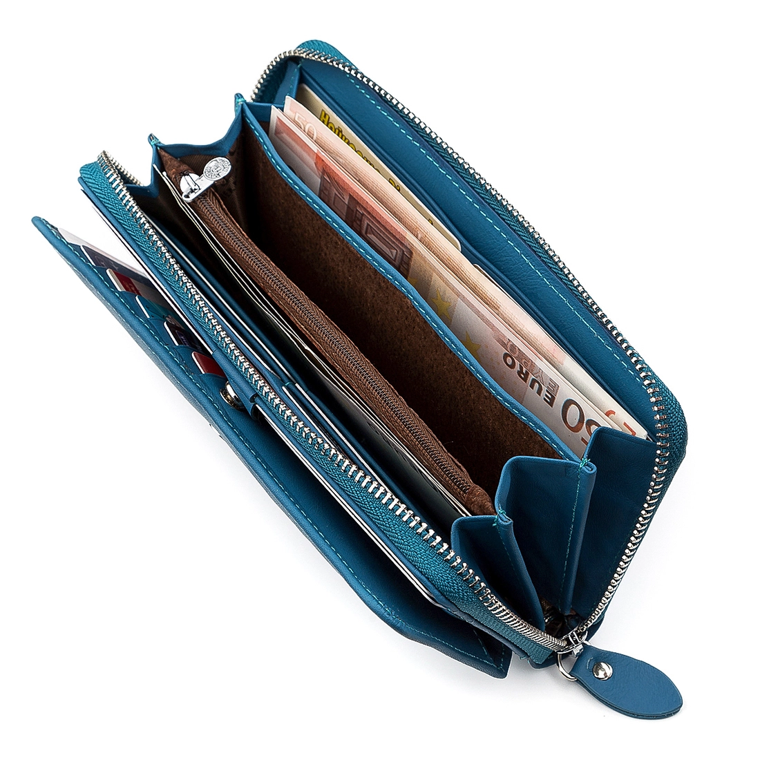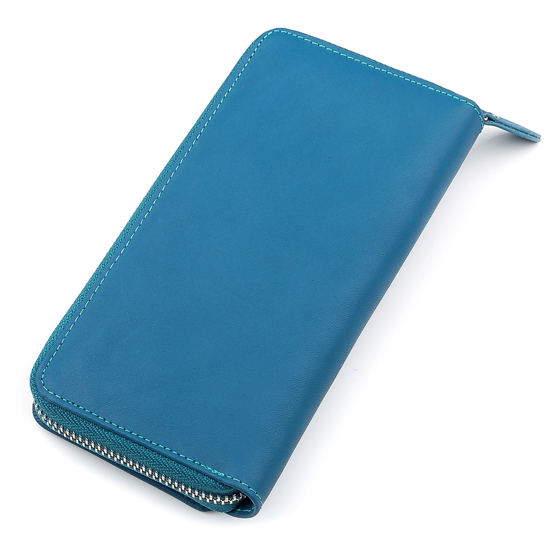 Представленная модель выполнена в красивом бирюзовом оттенке, с качественной, натуральной кожи. Закрывается аксессуар на молнию, чем позволяет на высшем уровне обеспечить сохранность содержимого, которого может быть очень много, ведь благодаря неплохим размерам доступна отличная вместительность. Снаружи есть также дополнительный блок для платежных карт, которых можно размещать 18 штук, вместе с внутренними ячейками. Порадует многих и привлекательная упаковка, оформленная в фирменном стиле с логотипом бренда.
