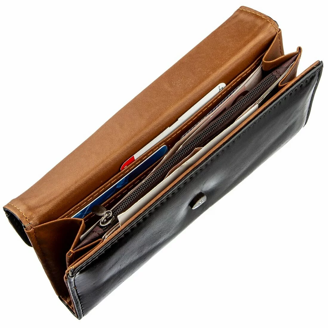 просторные отделения для купюр, ячейки для карточек, отделение на