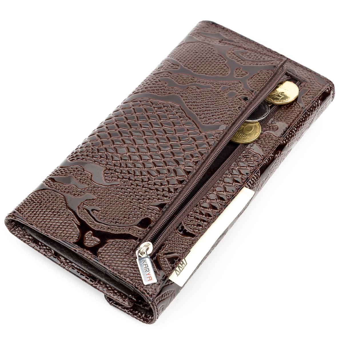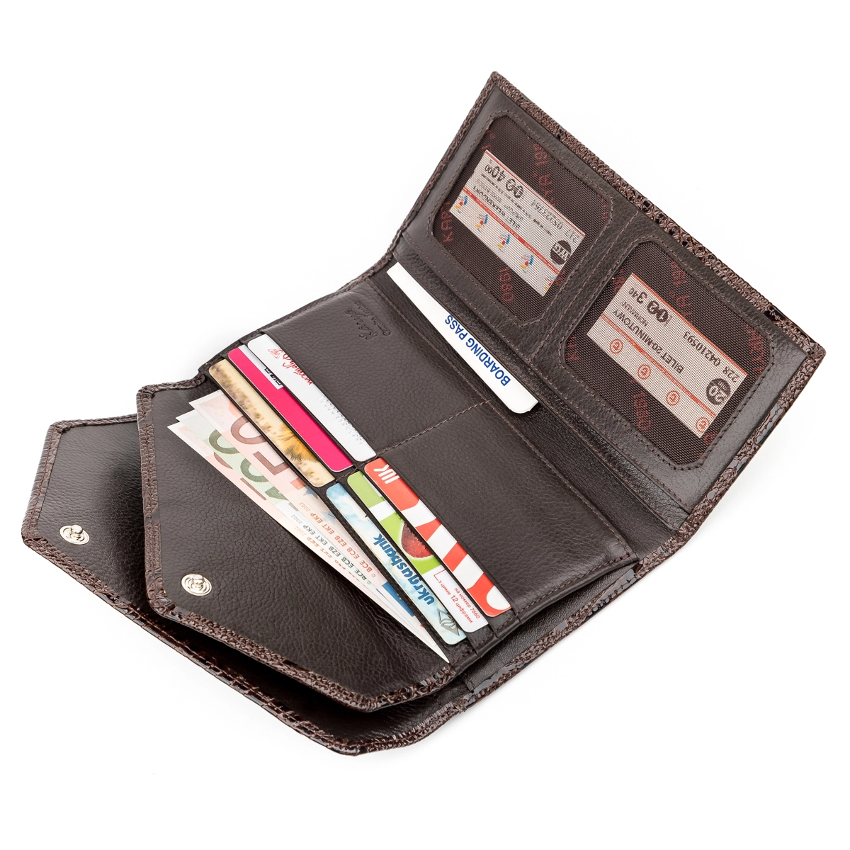 8 ячеек для карт и два скрытых кармана. С внешней стороны кошелька
