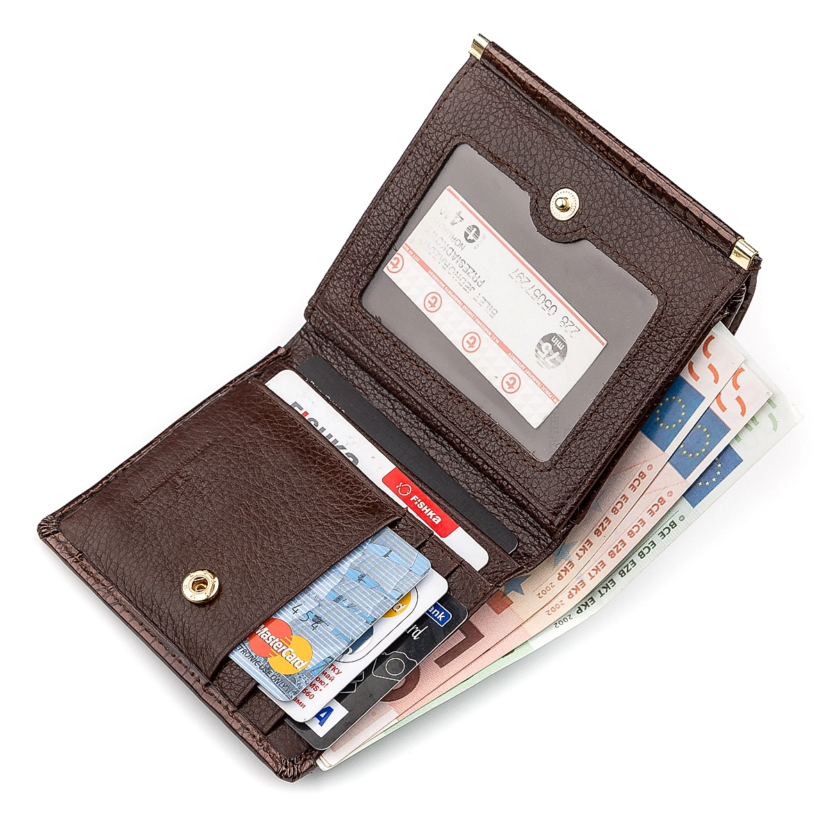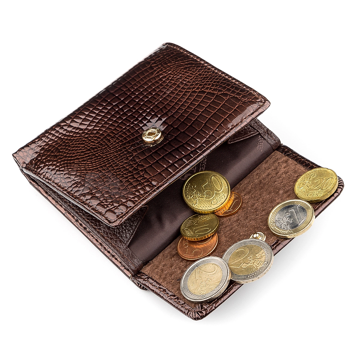 Данный вид кошелька отличается не только небольшими габаритными размерами, но и минимальным набором функционала и фиксацией клапана на кнопке. Кроме того, лицевая отделка декорирована под крокодилью кожу, покрытую лаком, и фурнитурой с золотым напылением. Вместительная монетница расположена снаружи и закрывается на кнопку. Внутренний функционал имеет минимальный набор необходимых отделений: для купюр, документов и кредиток. Продажа данной модели осуществляется в комплекте с фирменной упаковочной коробкой.