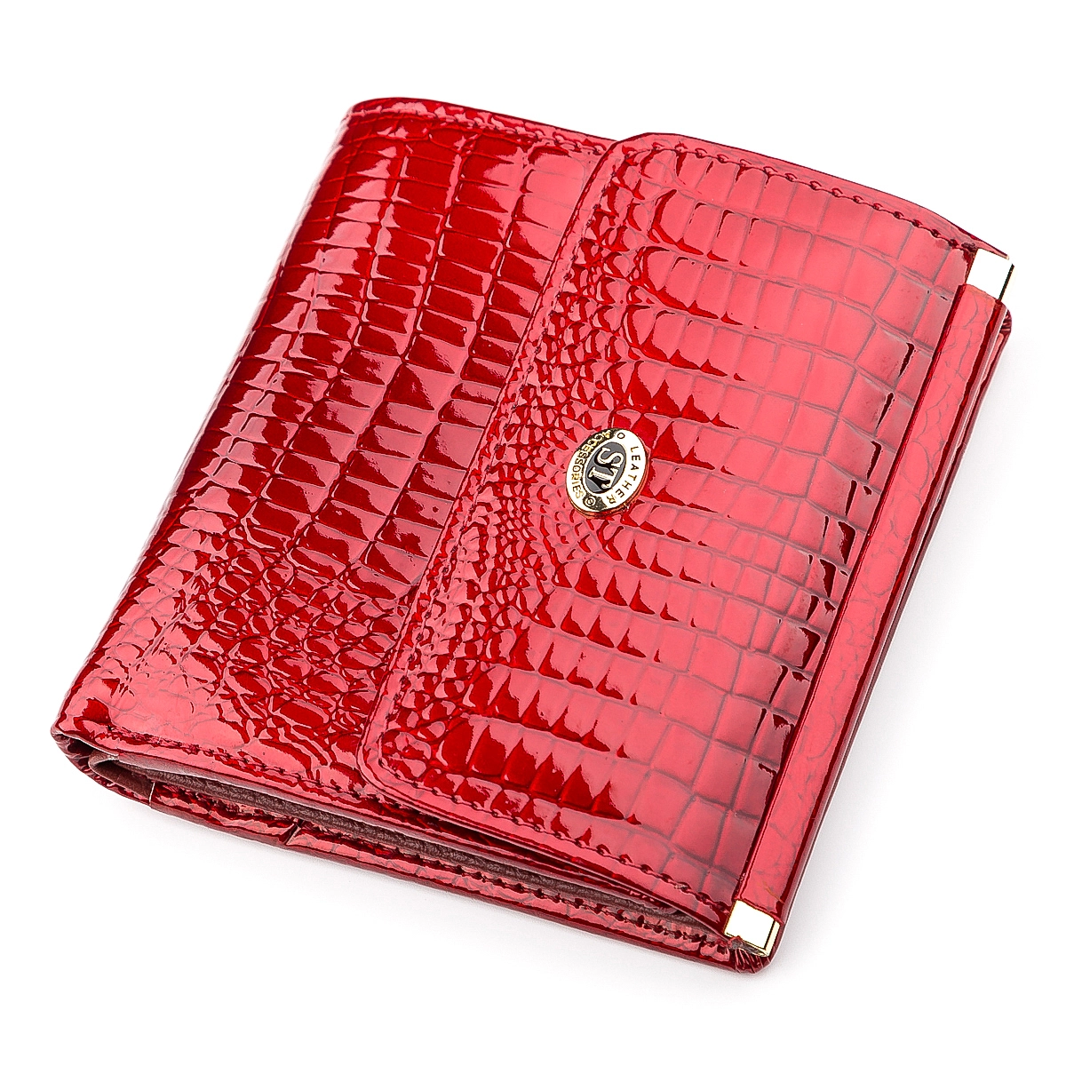 Дизайн данной модели предусматривает использование аксессуара в сложенном в несколько раз виде, что делает кошелек минимальных размеров. С наружной стороны есть внушительный отсек для ранения монет. Во внутреннем функционале имеется все самое необходимое: отделения для купюр, слоты для кредиток и специальный кармашек с окошком для хранения документов. Данная модель изготовлена из натуральной красной кожи, с лицевой стороны которая декорирована под крокодилью кожу вскрытую лаком.