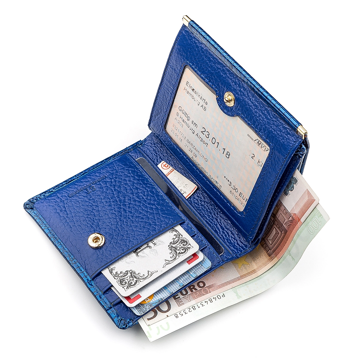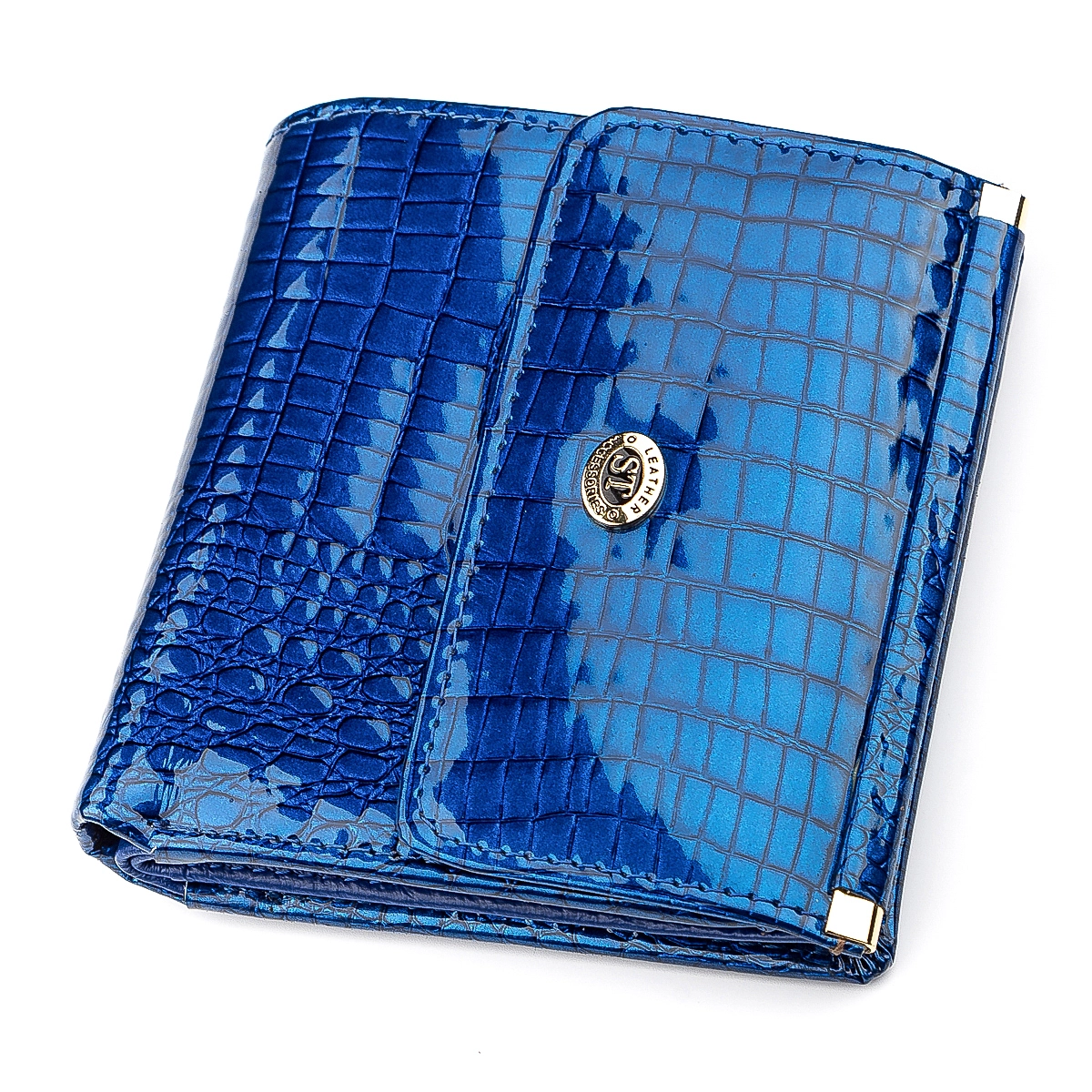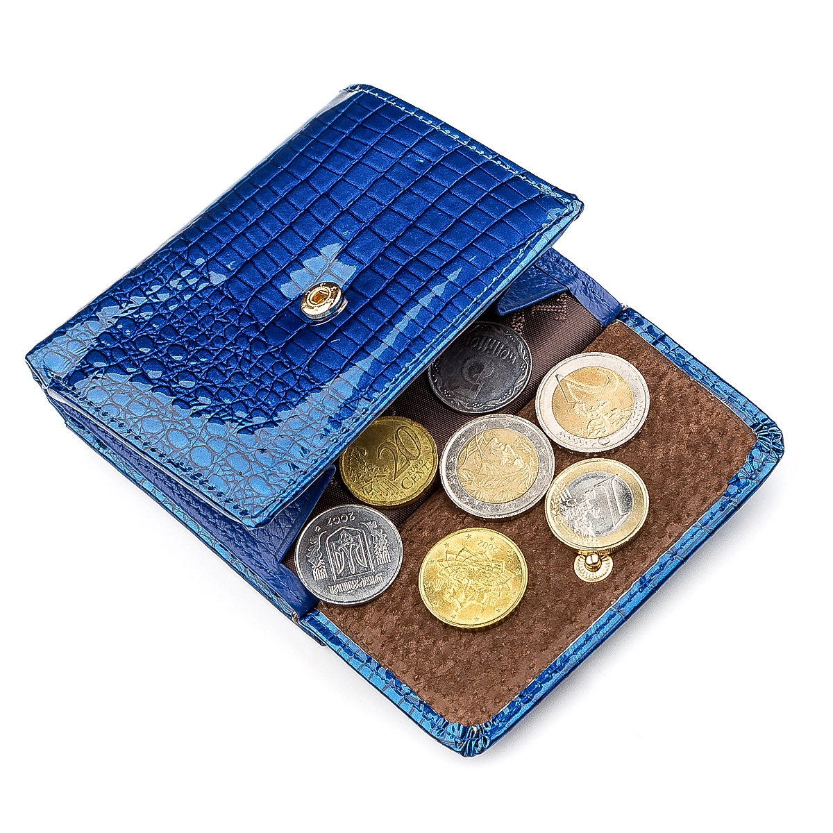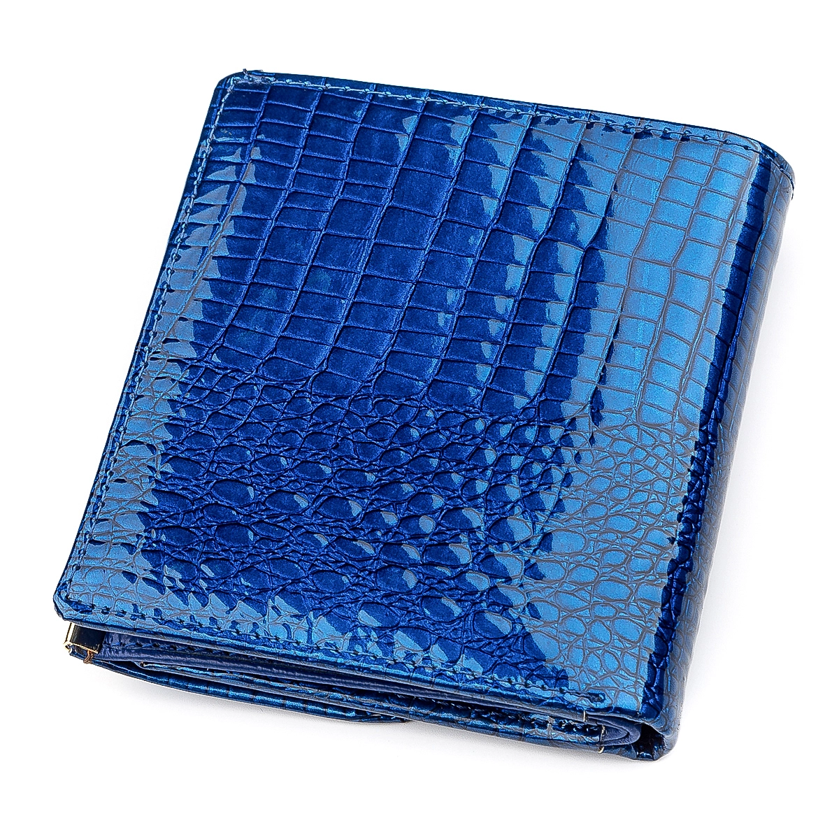В модели можно разместить все самое необходимое и даже больше: документы, деньги, мелочь и кредитки. Также, данная модель отличается своими небольшими размерами, благодаря тому, что изделие складывается в несколько раз и надежно закрывается на кнопку. Это дает возможность носить кошелек не только в сумке, но и в кармане. Лицевая сторона изготовлена из лаковой с имитацией крокодильей кожи. Данная модель может стать отличной идеей для подарка.