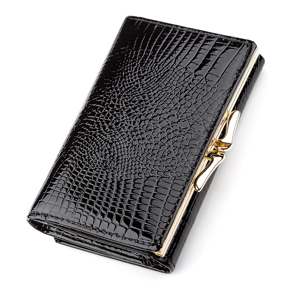 Модель лакового аксессуара для хранения денег отличается качеством и удобством эксплуатации. Данный кошелек складывается в три раза и фиксируется на кнопке. Внутри изделия расположено несколько карманов для купюр и слотов для банковских карт или визиток. Монетница расположена на внутренней стороне аксессуара. Дизайн кошелька отличается уникальным тиснением внутренней поверхности под кожу крокодила и дополнен фирменным логотипом и фурнитурой под золото.