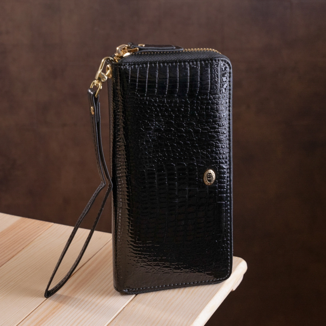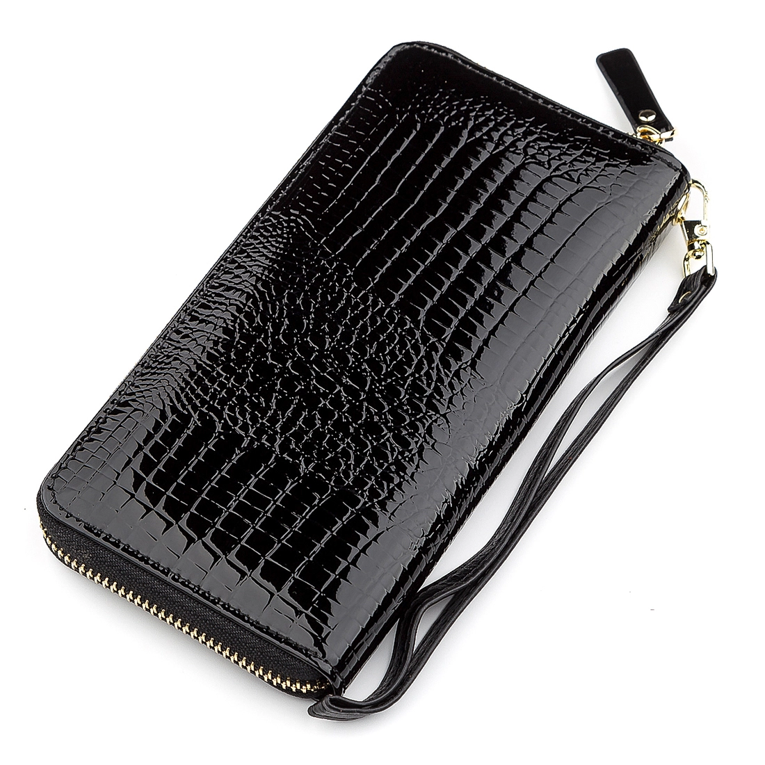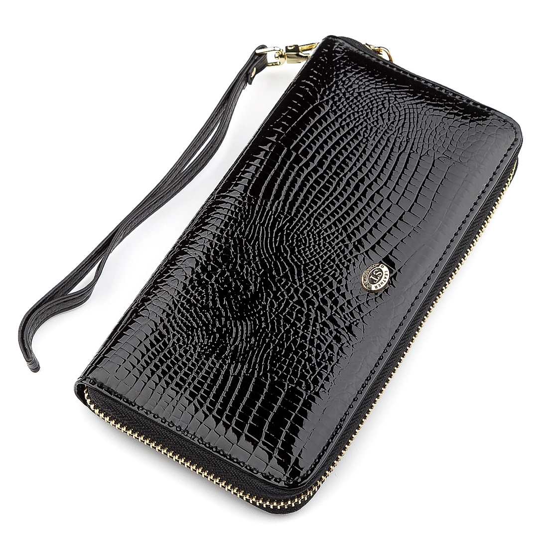 Данная модель кошелька имеет небольшие габариты, выполнена из натуральной, крепкой, износостойкой и качественной кожи в черном цвете. Комплектация отделений стандартная и достаточно функциональная: отсеки для бумажных купюр, прилегающие карманы и вырезы под платежные карточки с монетницей. Спереди нанесен фирменный логотип и красивый узор под крокодилью кожу. Дополнительно порадует также ремешок на запястье и надежная металлическая молния, которая отлично закрывает кошелек, а благодаря фирменной коробки, аксессуар прекрасно подойдет в роли подарка.