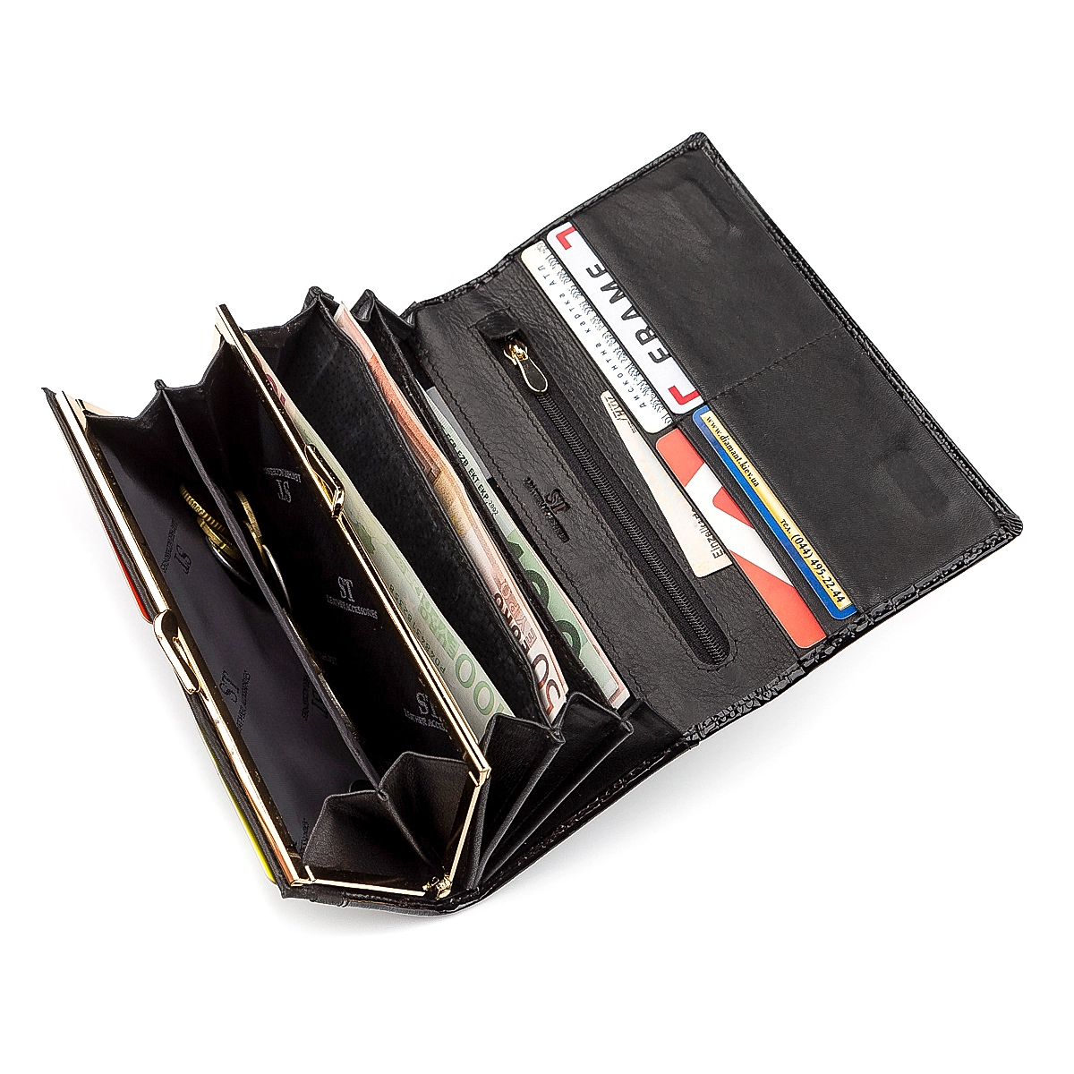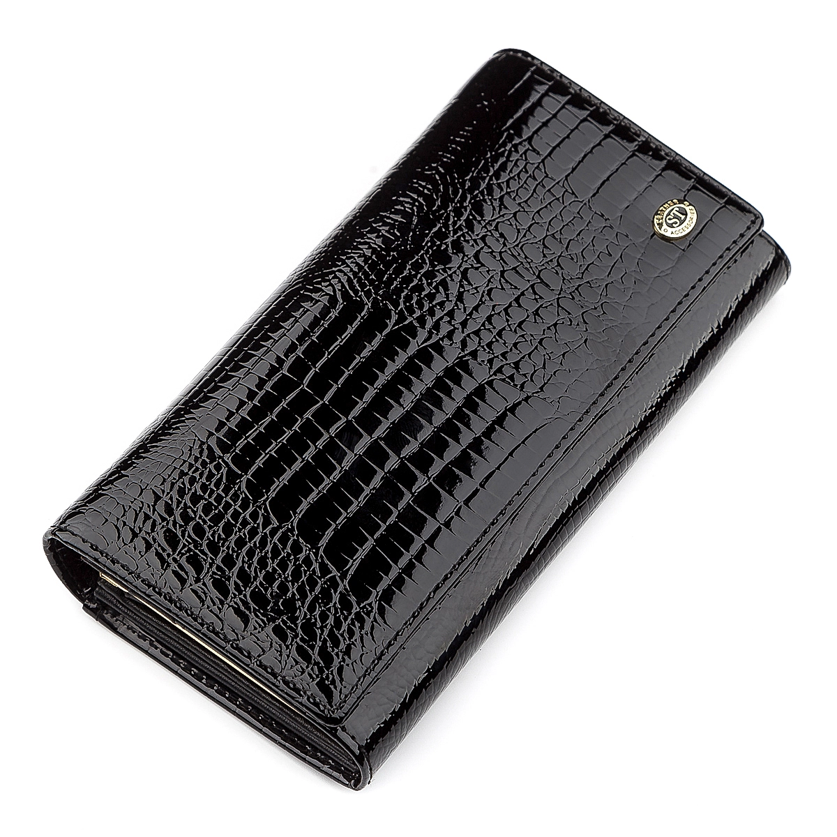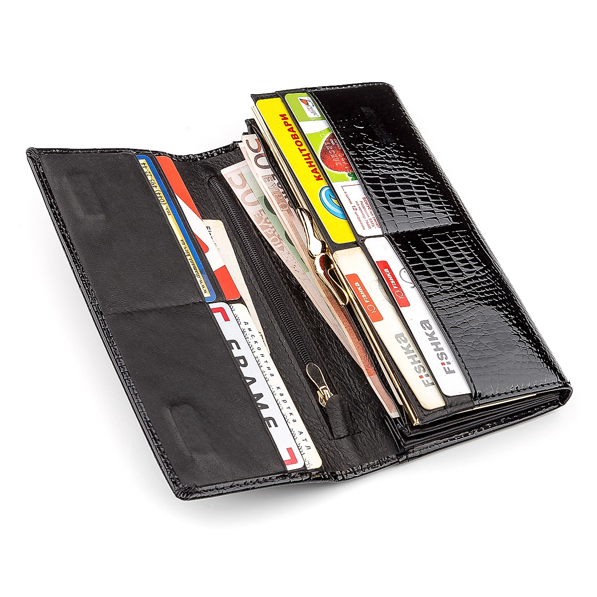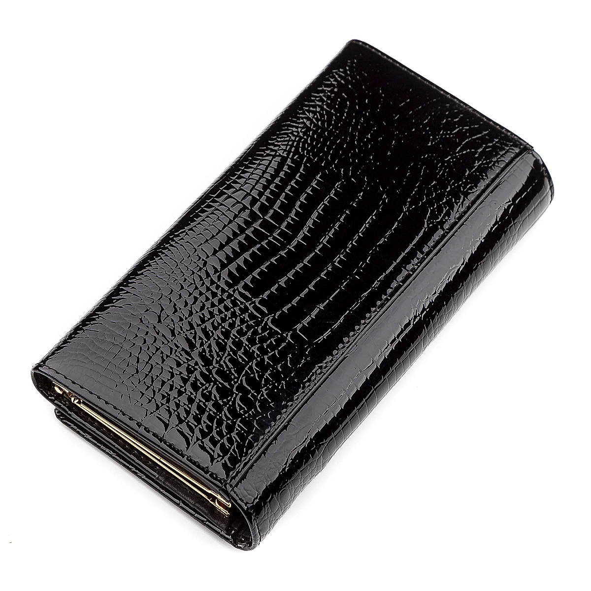 Оригинальный лаковый кошелек выполнен в черном цвете с натуральной и качественной кожи. Закрывается бумажник надежно с помощью кнопки, а шарма прибавляет тиснение с рисунком крокодиловой кожи. Внутри есть вместительные карманы для платежных карт и банкнот, а сзади расположен отсек для монет на защелке. Если есть желание приобрести качественный и привлекательный аксессуар, стоит обратить внимание на эту модель, которая подойдет и в качестве подарка.