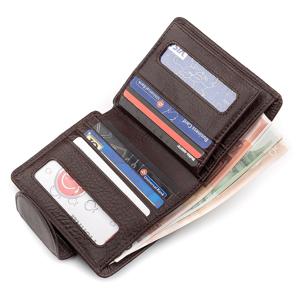 3 отделения для банкнот любого размера (одно на молнии);