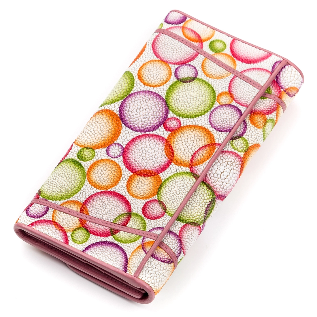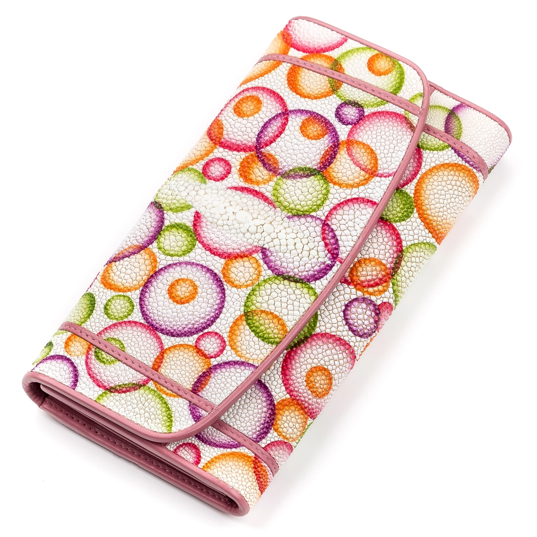 Кошелек с необычным принтом из натуральной кожи морского ската, которая обладает фантастической фактурой и красотой. Ее изящество подчеркивает костяной остаток от спинного плавника, похожий на блок “жемчужин”. Самая крупная “жемчужина” находится по центру, и по ней определяют возраст ската. Все пространство кожи покрыто сотнями мелких бугорков, разного размера, которые играют на свету, как небольшие бусинки. Аксессуар обшит гладкой черной кожей. Очень компактный и износоустойчивый аксессуар, который подойдет всем ценителям удобства и качества.