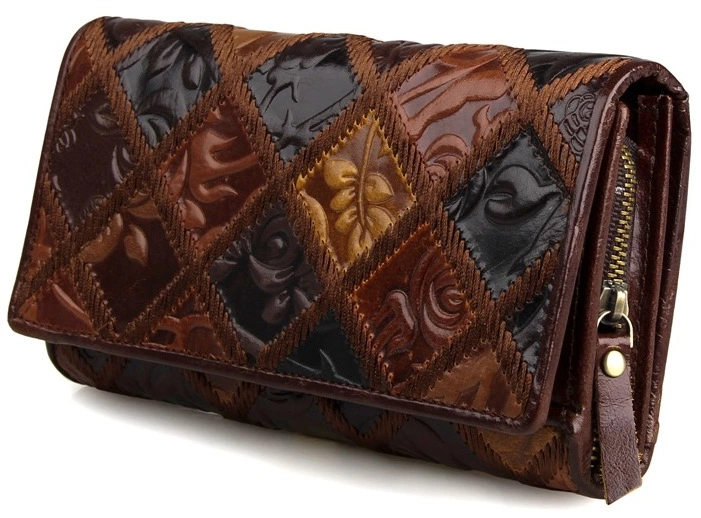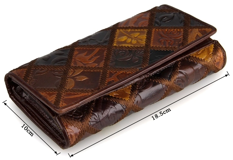 Добротный женский кожаный кошелек с множеством удобных кармашков и отделений. Внешняя сторона изделия украшена теснением на коже в виде декоративных рисунков. Цвет фурнитуры: латунь. Аксессуар закрывается клапаном на кнопке. Кошелек упакован в текстильный пылезащитный чехол белого цвета.