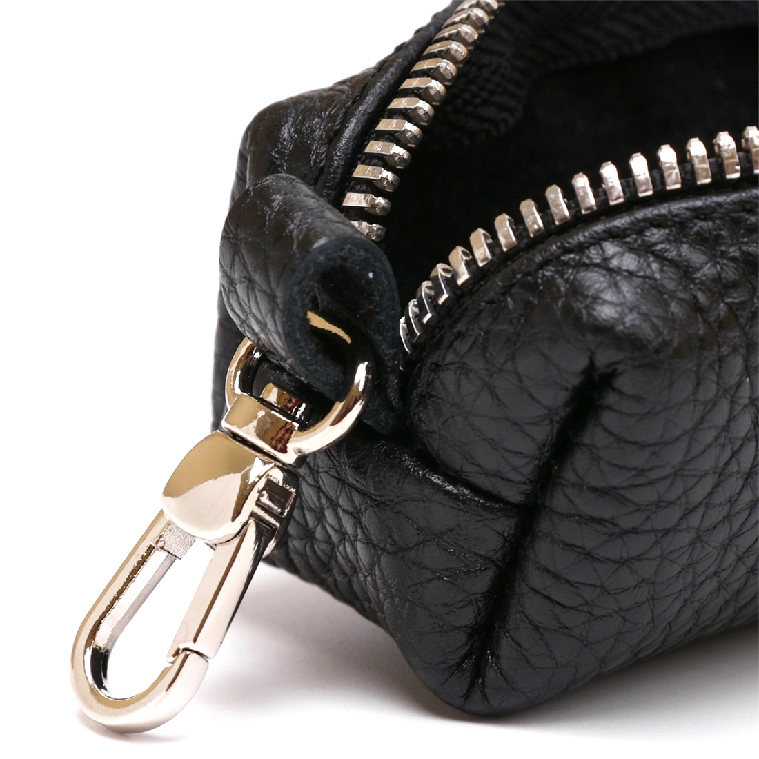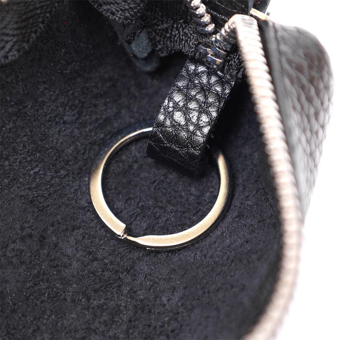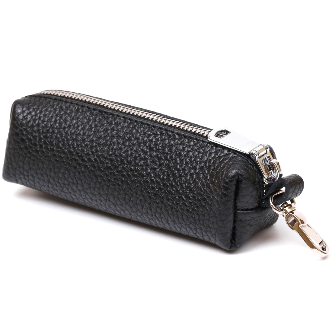 Отличная ключница для безопасного хранения ключей, при этом они точно не поцарапают содержимое сумки или кармана. Выполнено изделие из натуральной кожи высокого класса с улучшенными показателями стойкости к износу. Ключи крепятся на металлическое кольцо внутри изделия, сам аксессуар закрывается на молнию. Цвет – классический черный.