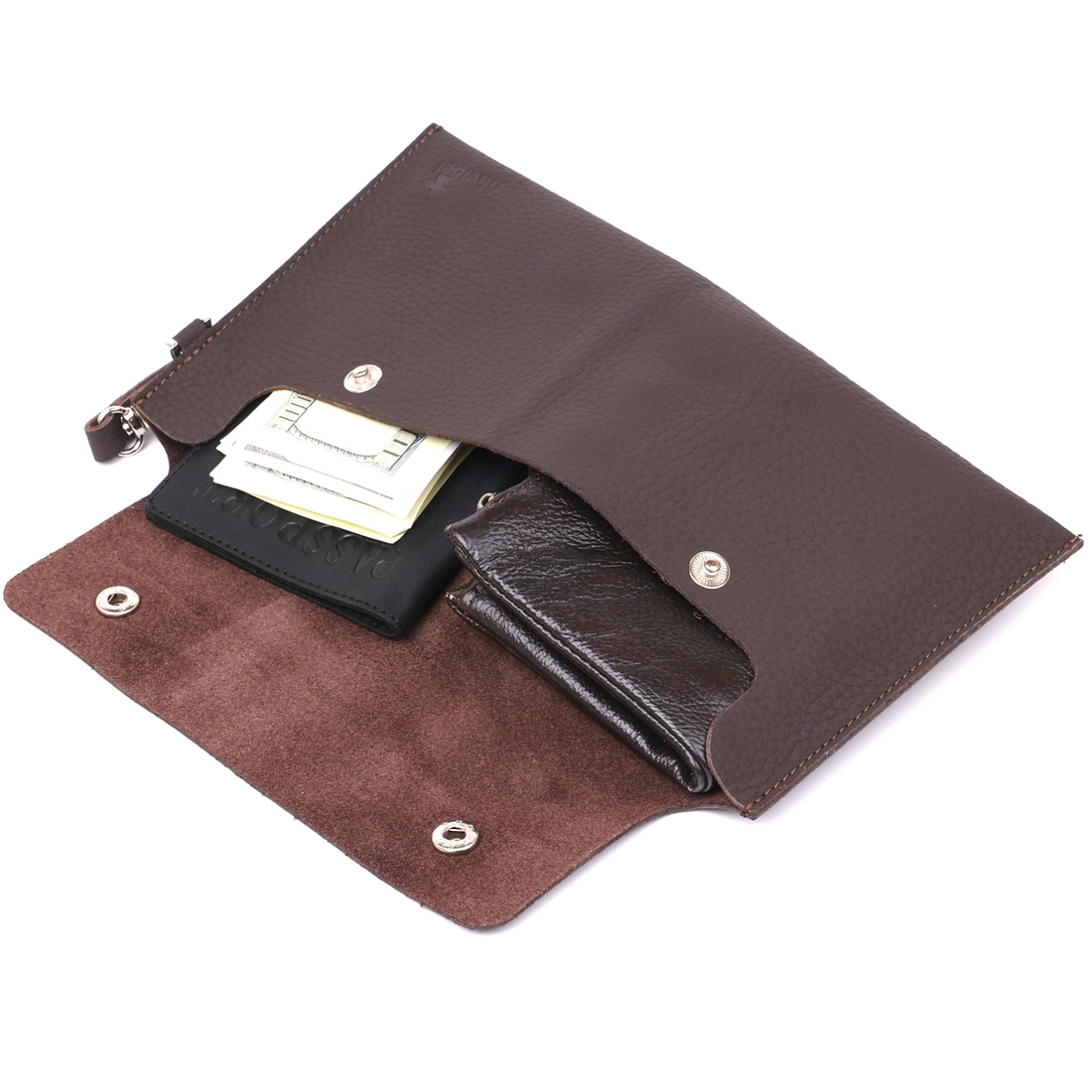 Красивая и практичная тревел-косметичка из натуральной высококачественной кожи с высокими показателями устойчивости к износу. Изделие выполнено в крупнозернистой фактуре, имеет темный коричневый цвет и матовую поверхность, что смотрится очень стильно. Закрывается аксессуар на клапан с двумя кнопками, также есть съёмный кожаный ремешок на запястье.