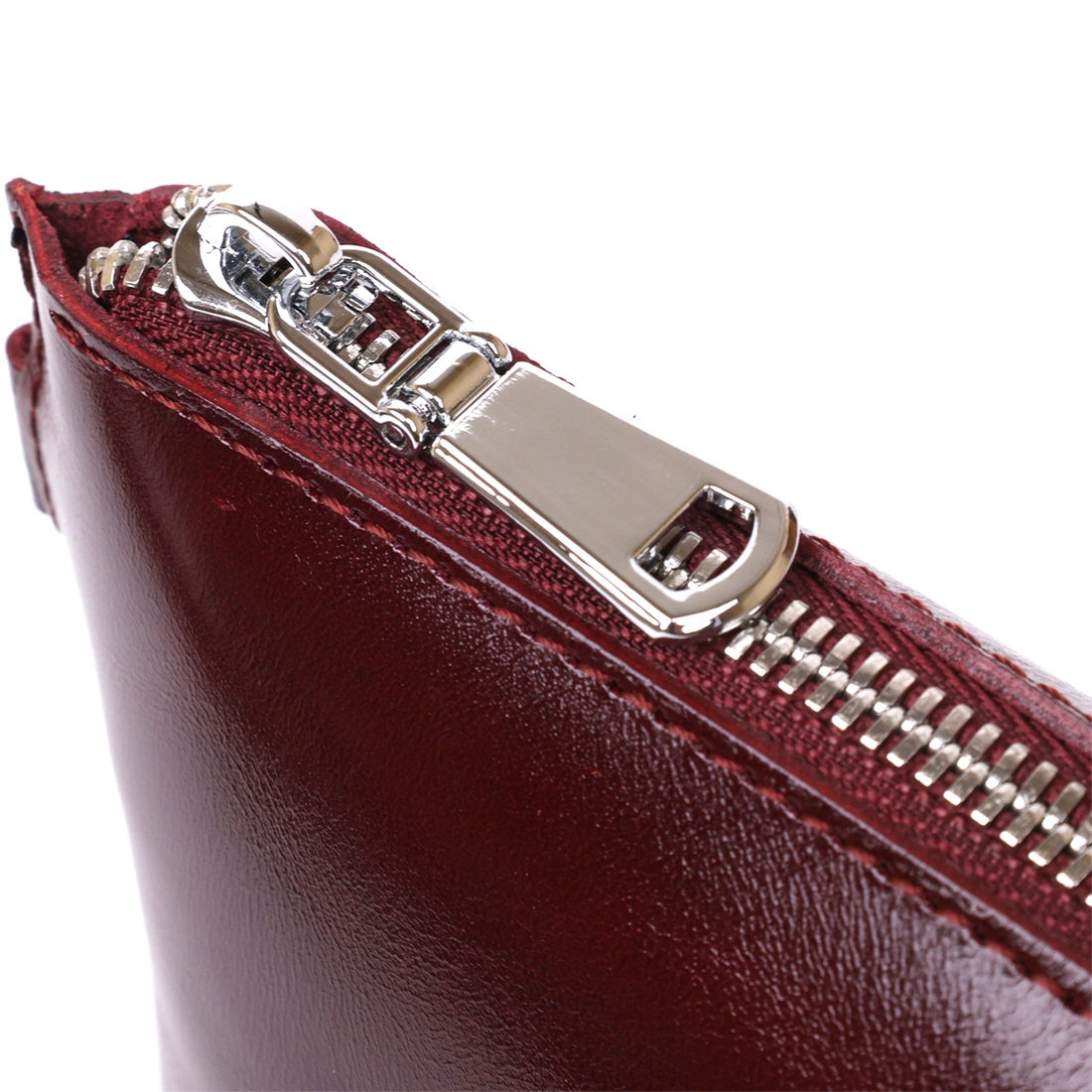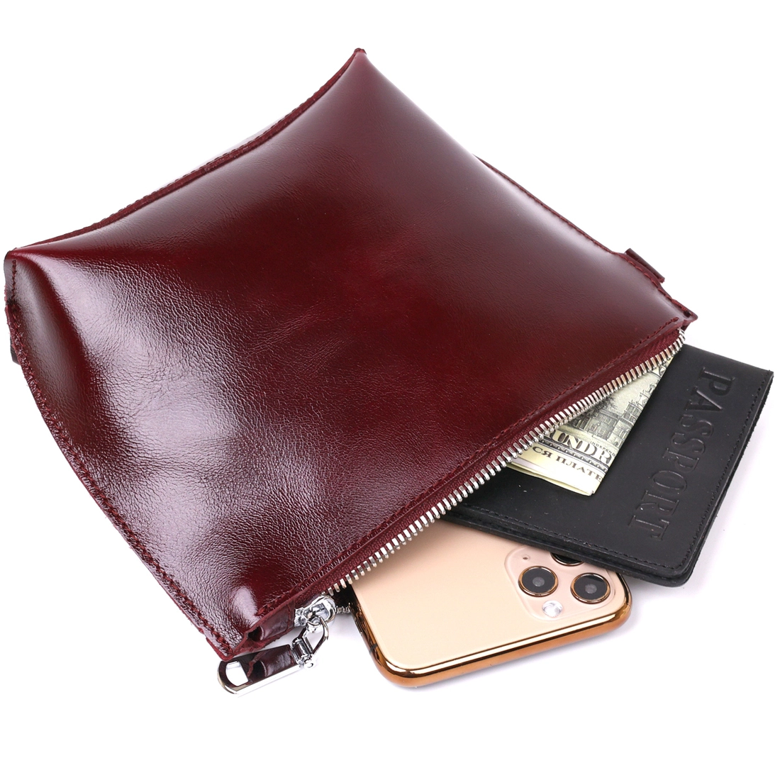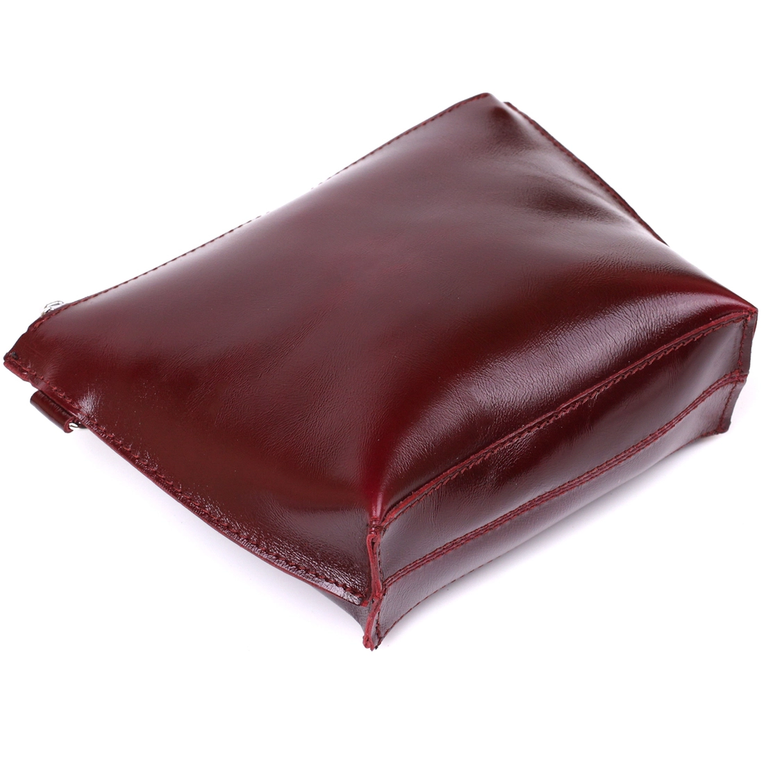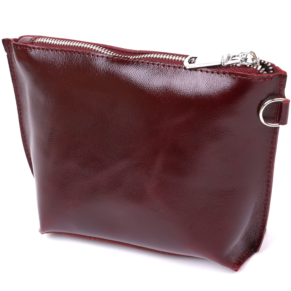 Стильная практичная женская косметичка для хранения ценных мелких вещей, особенно пригодится в дороге. Выполнена в красивом насыщенном бордовом цвете с легким блеском, что смотрится очень модно и богато. Материал – натуральная кожа высокого класса с хорошими показателями износостойкости. Фактура изделия – гладкая. Молния сделана в серебренном цвете.