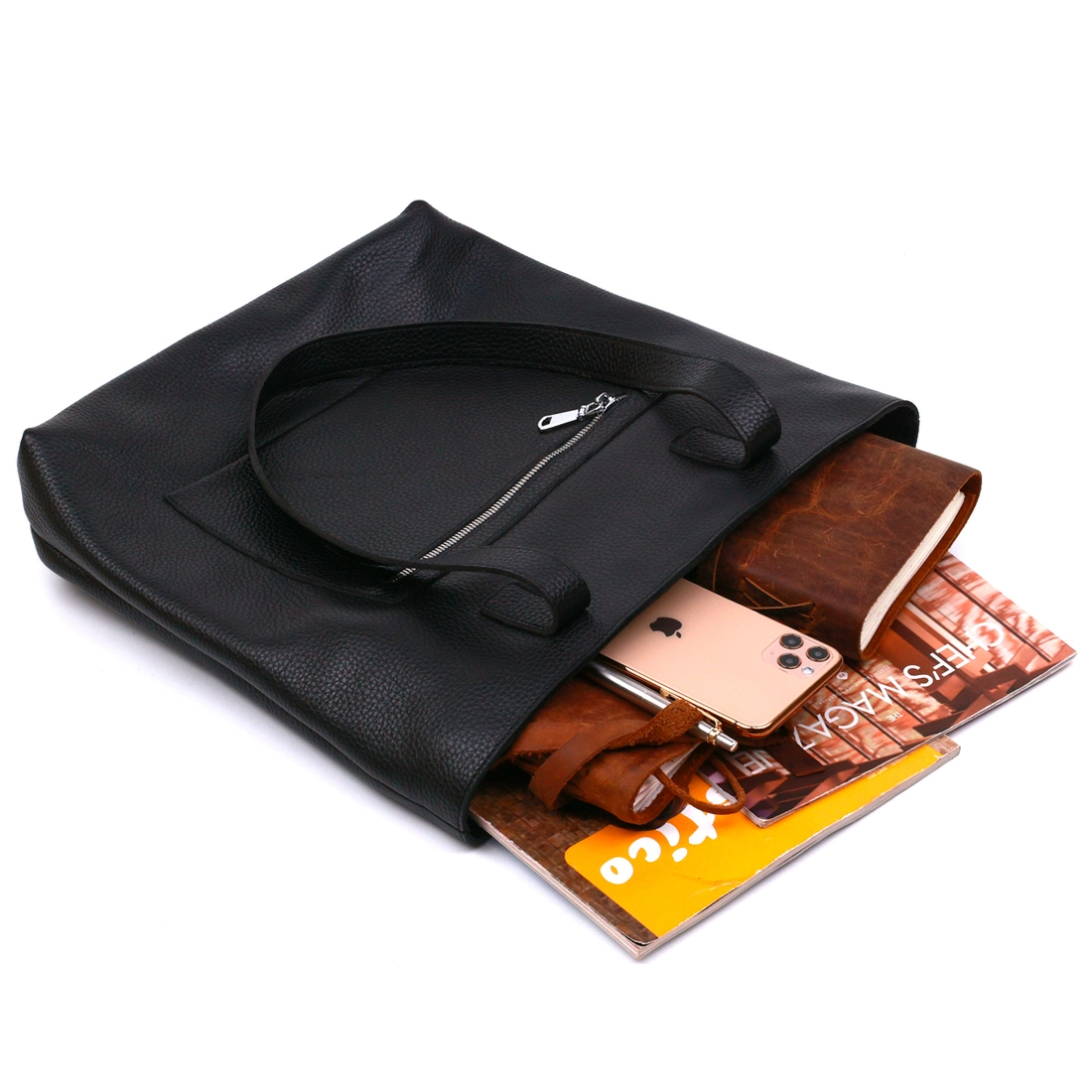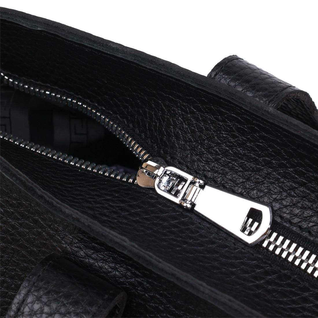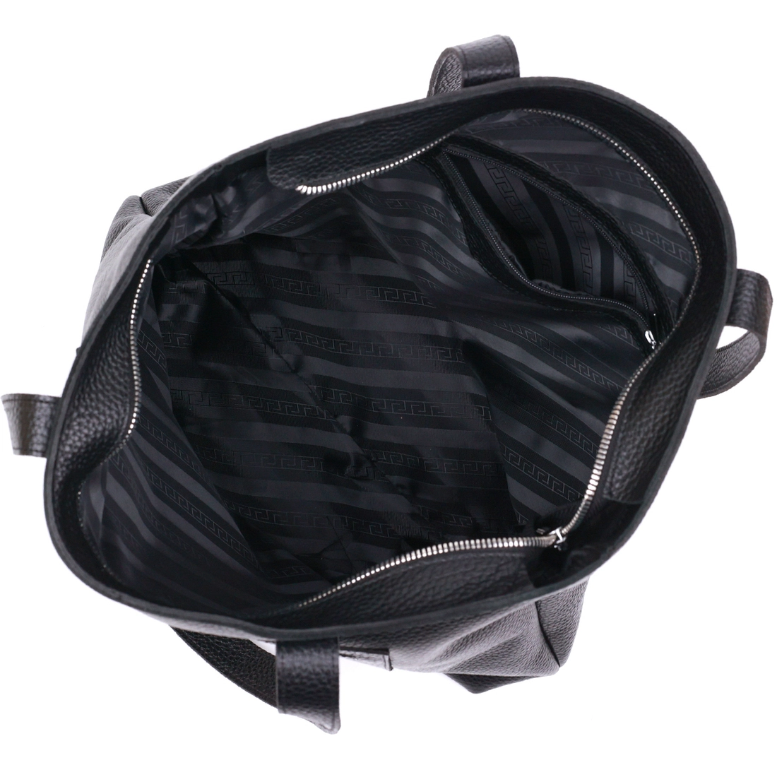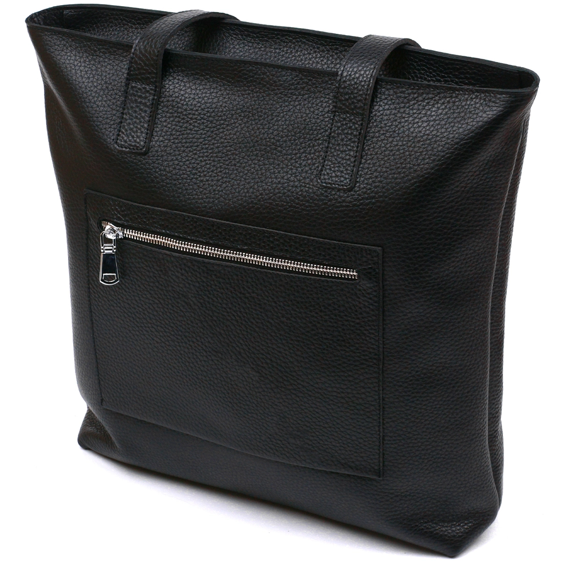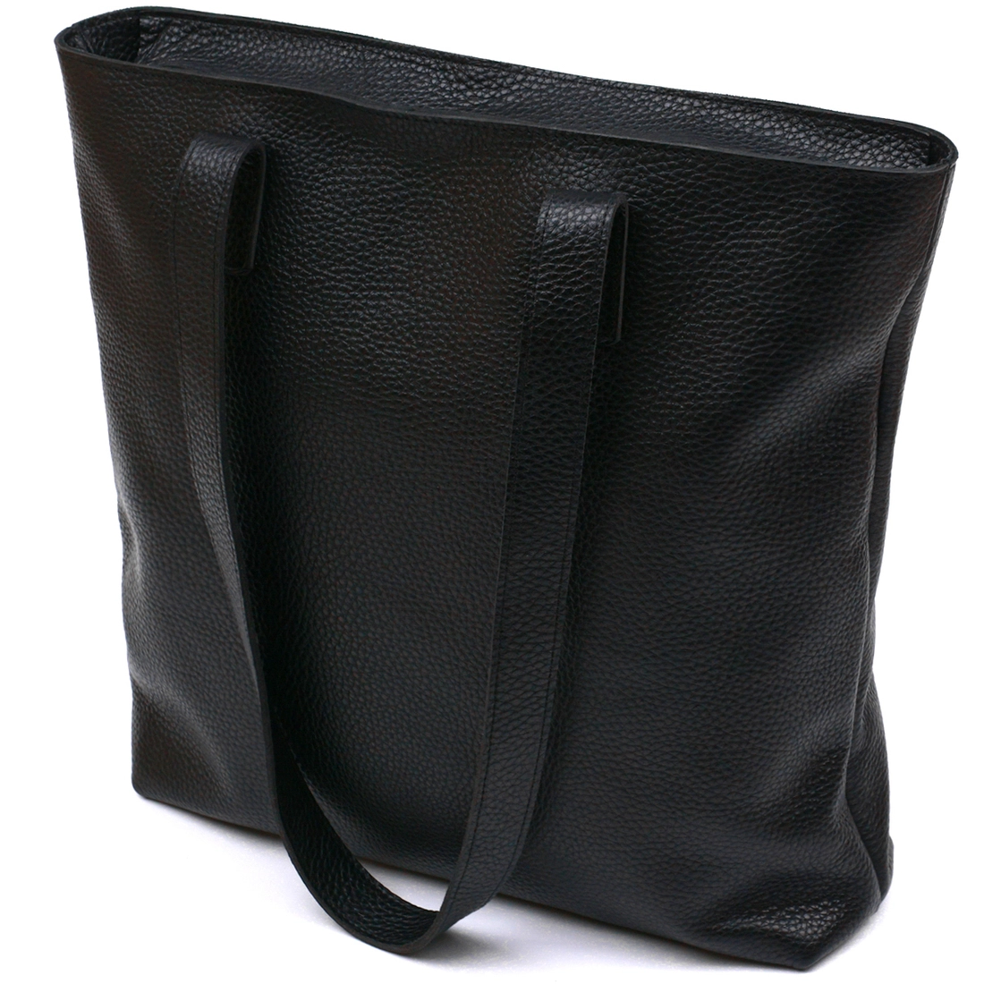 Универсальная женская сумка-шоппер от украинского производителя в практичном черном цвете, поэтому легко подойдет под любой цвет и стиль одежды. Выполнена модель из натуральной кожи высокого качества и отменными характеристиками. Фактура – зернистая и очень приятная на ощупь. Внутри есть одно вместительное отделение на молнии и потайной карман.
