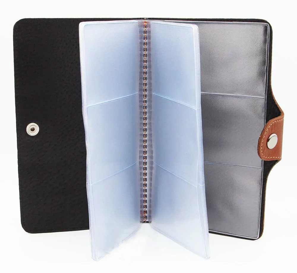 - визитница имеет 20 листов в каждом из которых 3 отделения для пластиковых карточек или визиток.