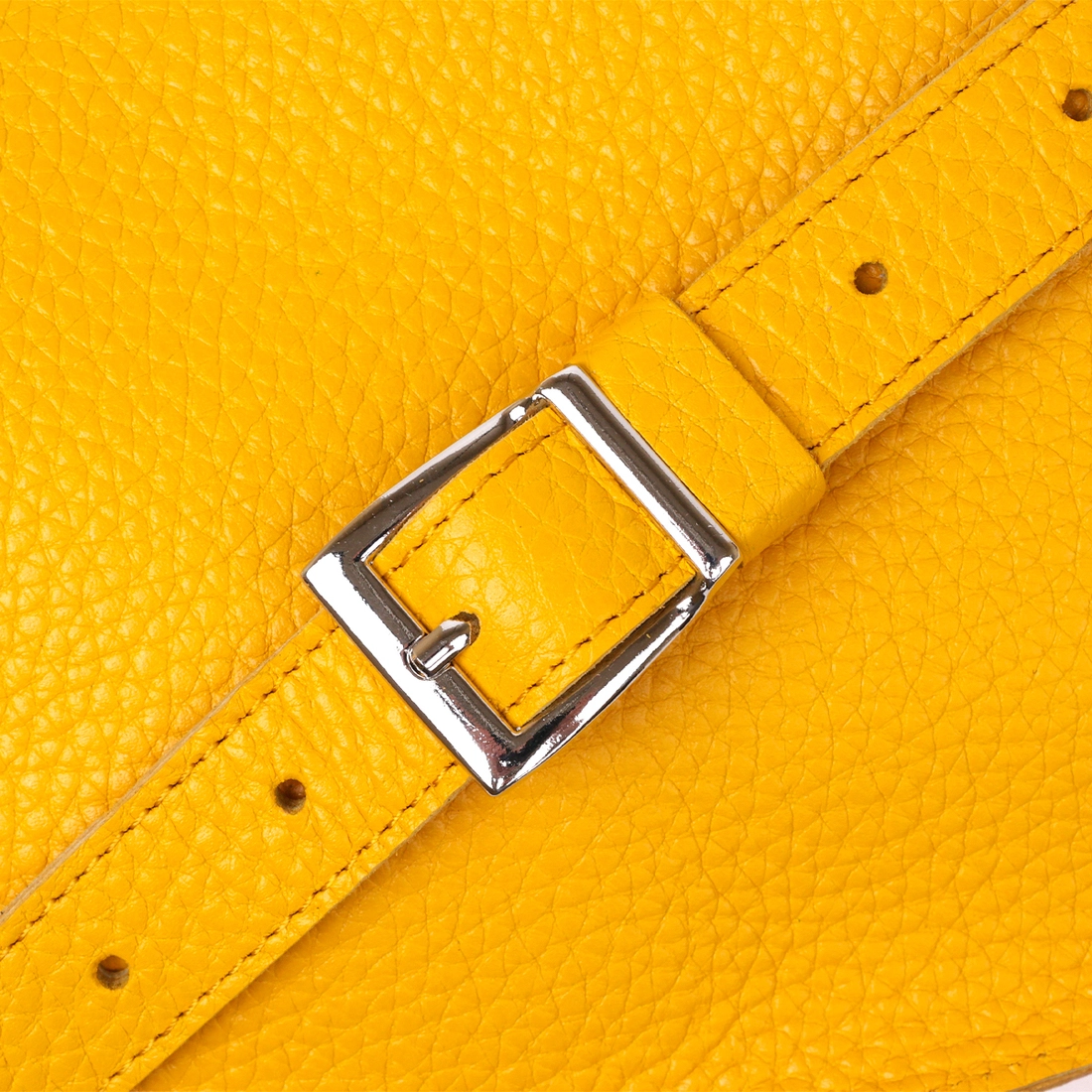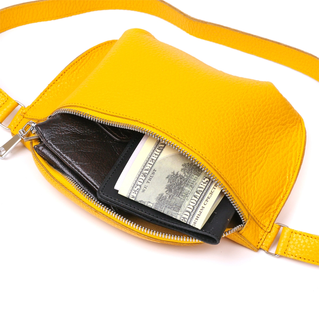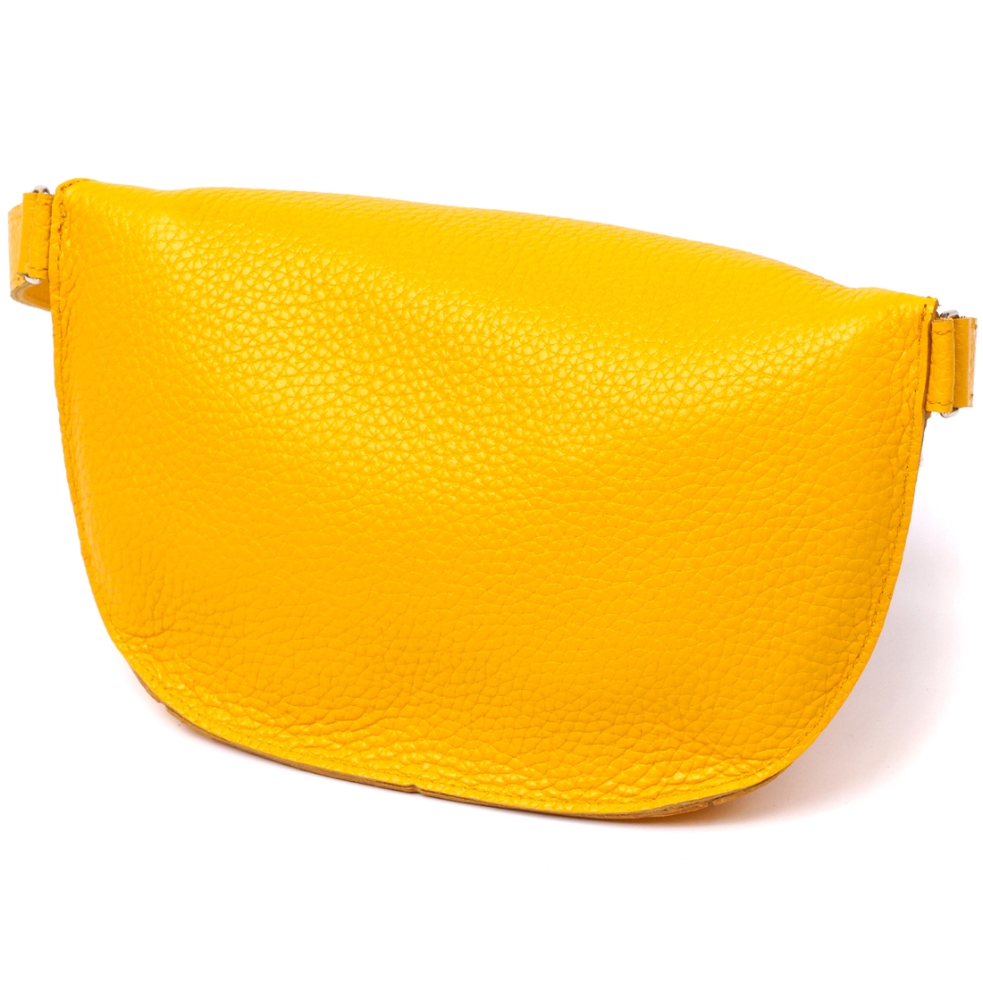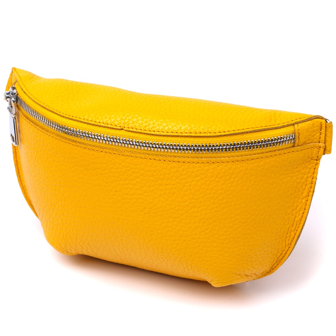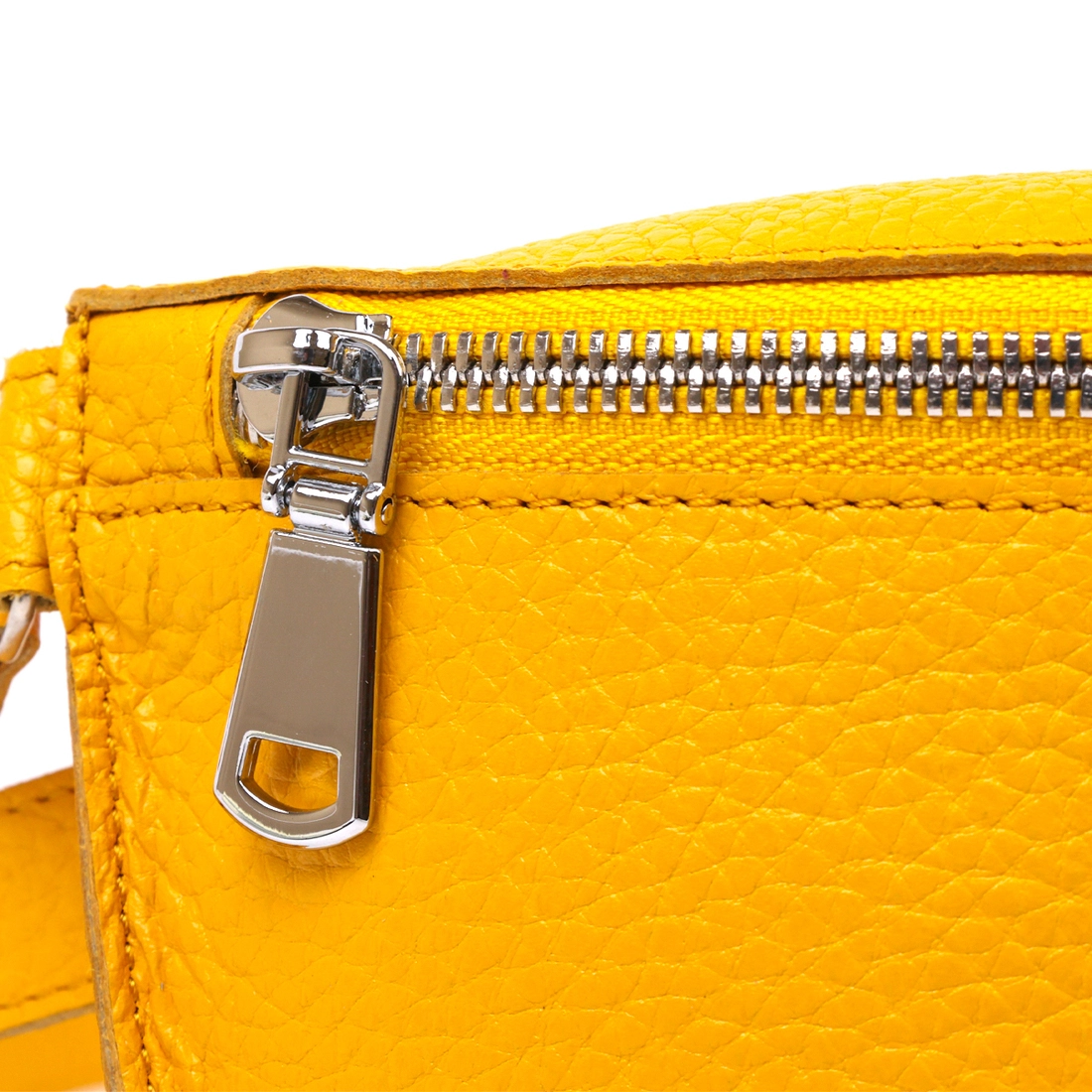 Очень красивая и яркая женская сумка на пояс в сочном желтом цвете, который, несомненно, будет подымать настроение своей хозяйке. Материал – натуральна кожа с высокими показателями стойкости к износу. Внутри одно просторное отделение, в которое с легкостью поместится телефон, кошелек и пр. Фактура изделия – зернистая и очень приятная на ощупь.