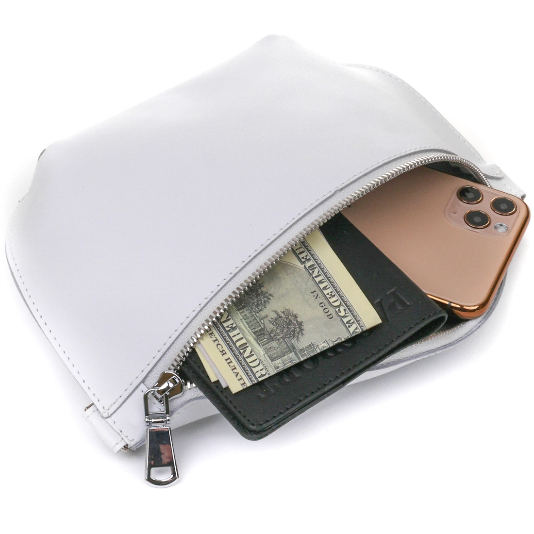 Превосходная женская сумка на пояс для повседневного использования или для путешествий. С такой сумкой Ваши руки будут свободны, а телефон и прочеи ценные вещи всегда при себе. Сделана бананка из натуральной кожи высокого класса и повышенной стойкости к износу. Цвет изделия – универсальный белый, фактура – гладкая и приятная на ощупь.
