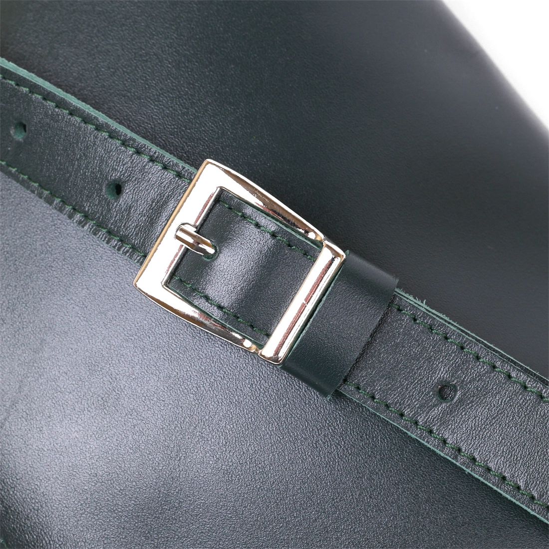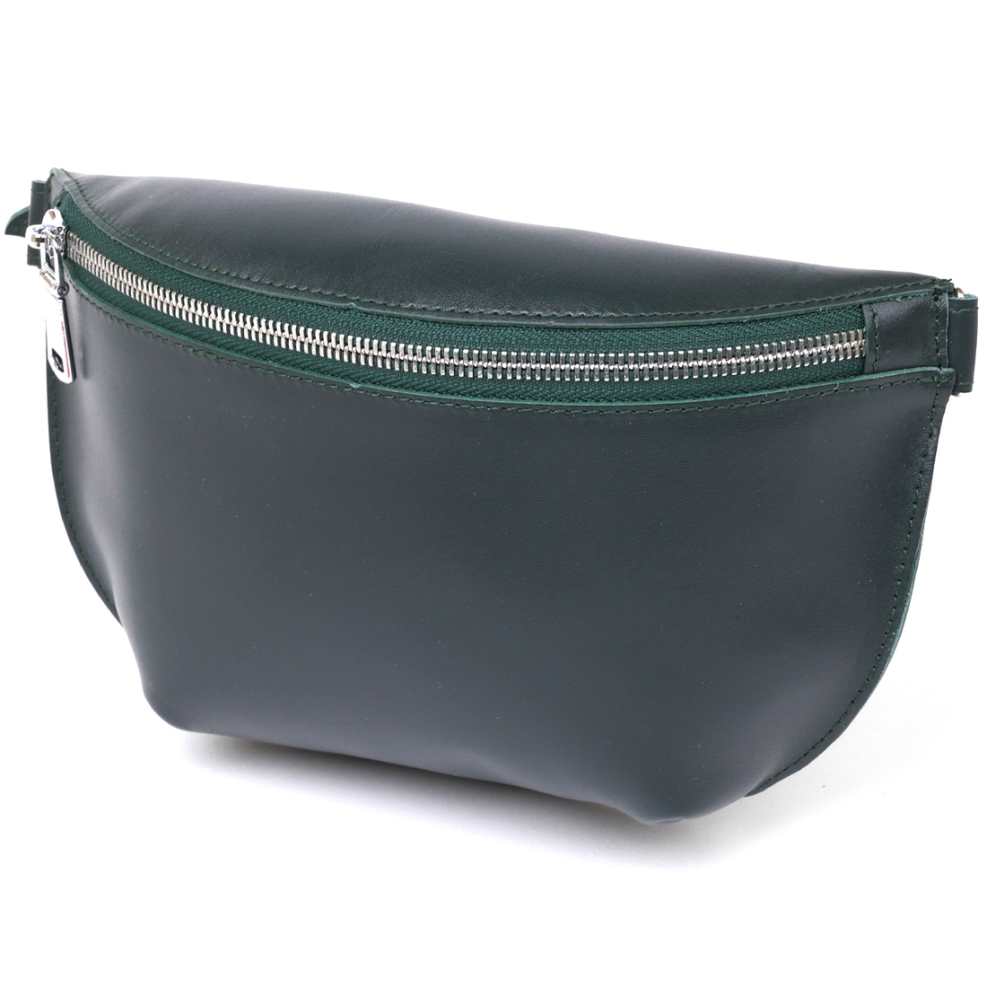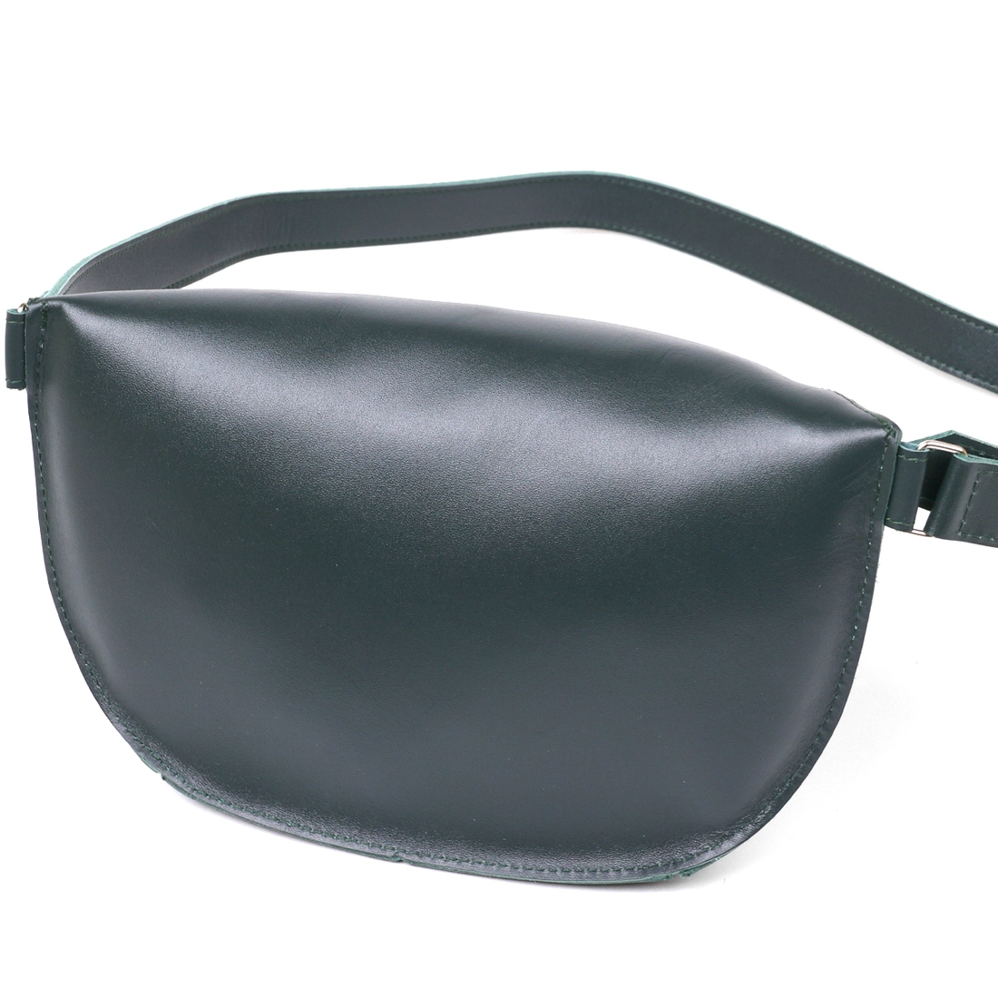 Стильная женская сумка на пояс в трендовом темно-зеленом цвете от украинского производителя. Материал – натуральная кожа высокого качества с отменными характеристиками эксплуатации. Внутри расположено вместительное отделение на молнии. Ремень выполнен также из натуральной кожи и может регулироваться по длине.
