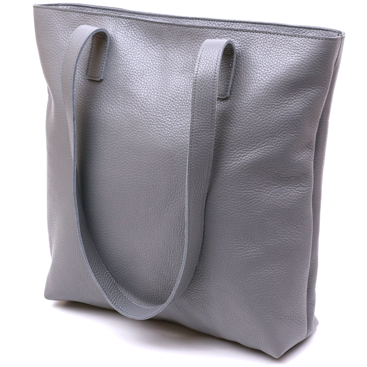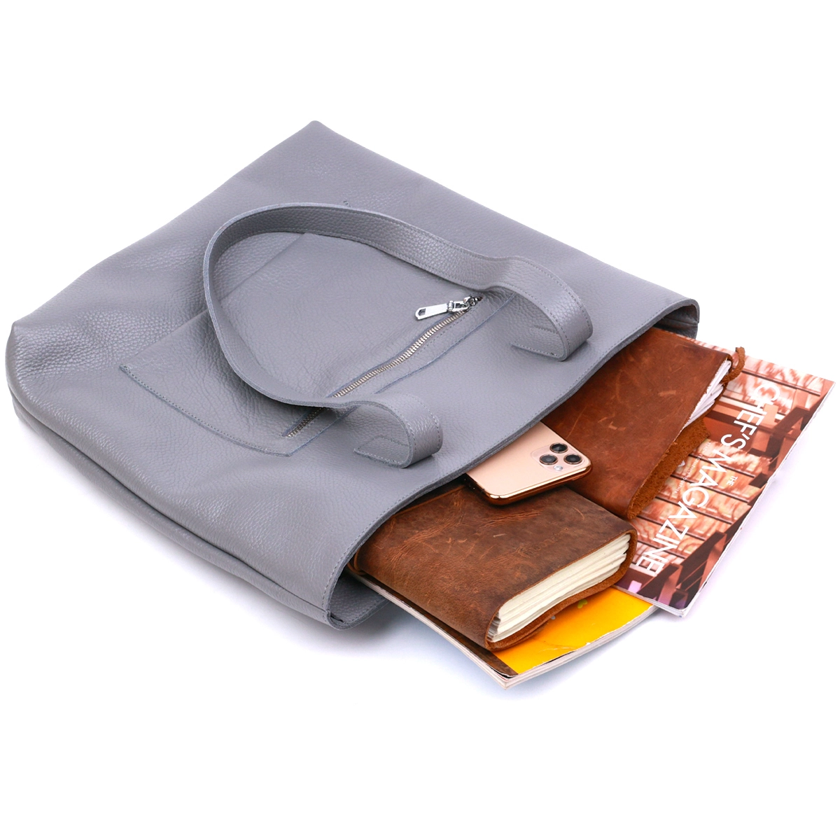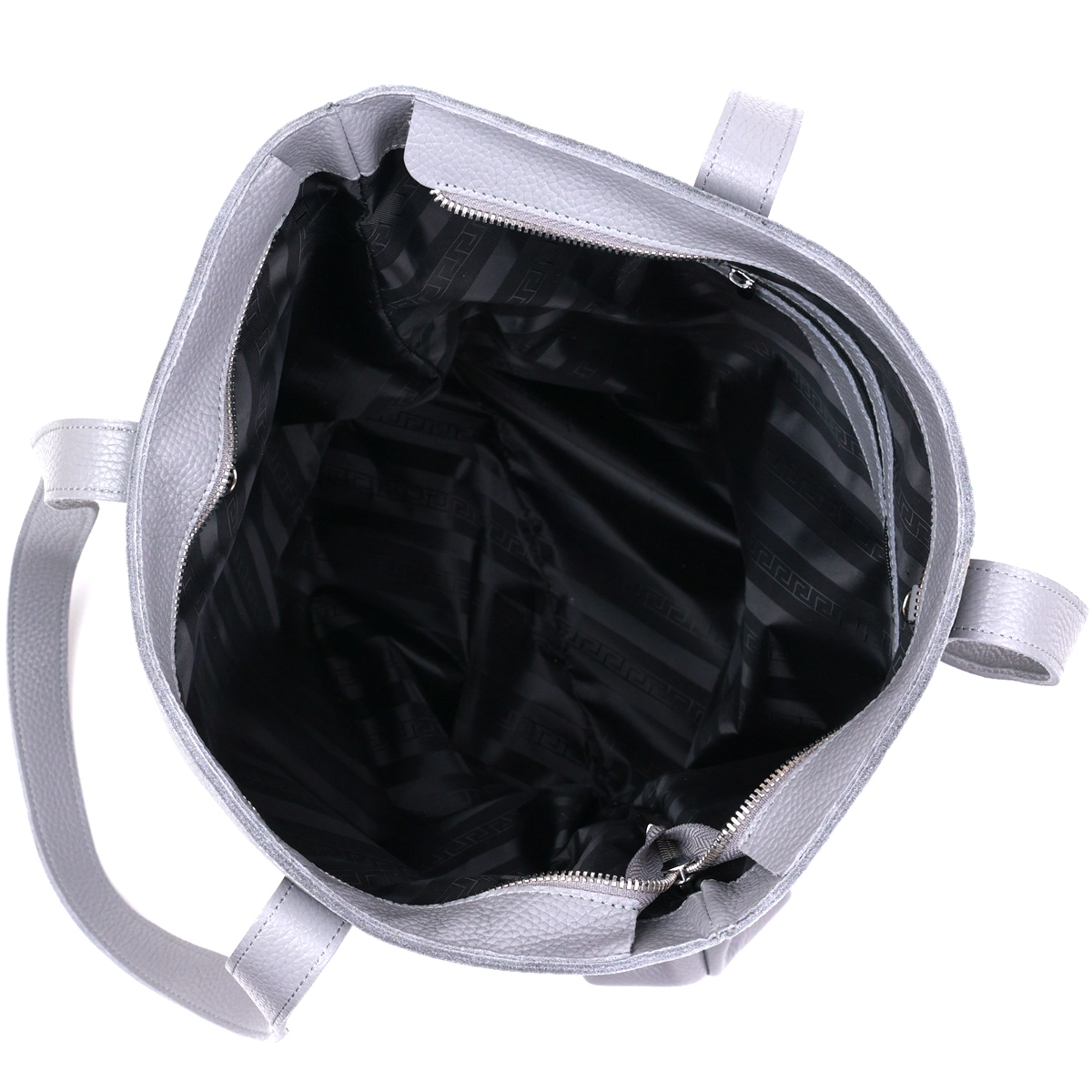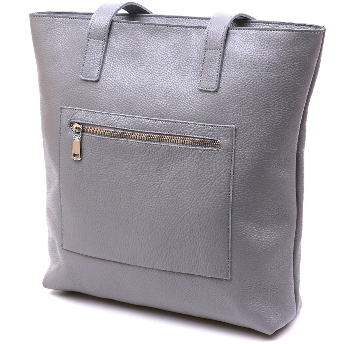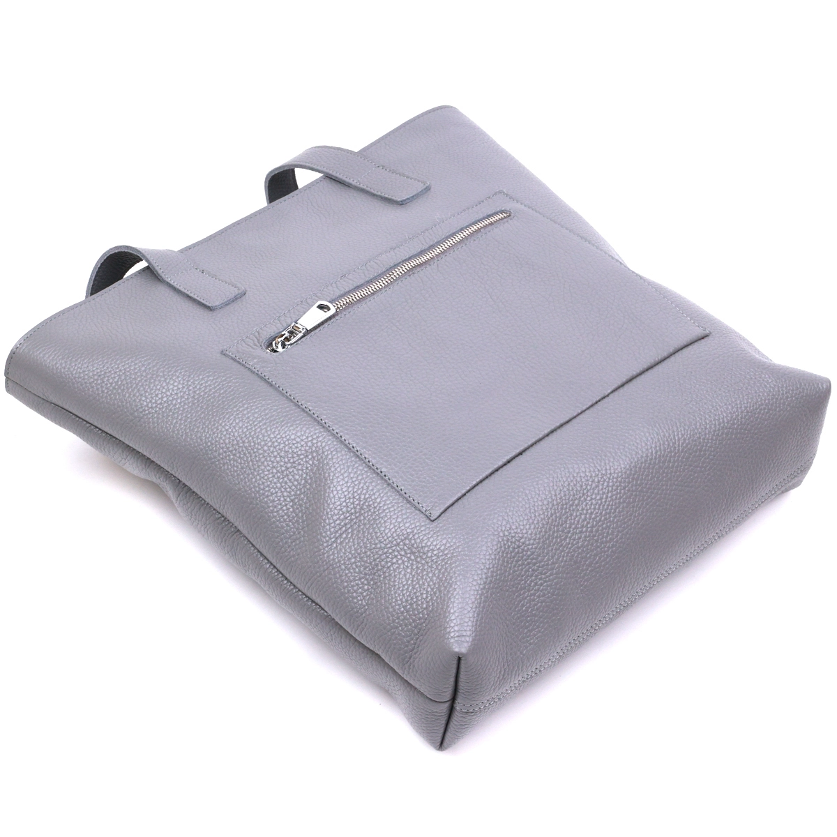 Замечательная женская сумка в модном и современном дизайне. Материал изготовления – натуральная кожа высокого качества с повышенными показателями стойкости к различному износу. Цвет данной сумки – серый, что очень трендово в данном сезоне, фактура – зернистая. Внутри есть просторное отделение и потайной кармашек на молнии, на внешней стороне также присутствует карман на молнии.