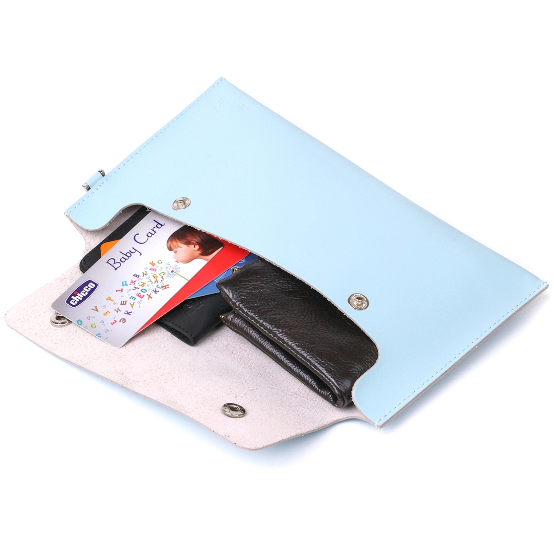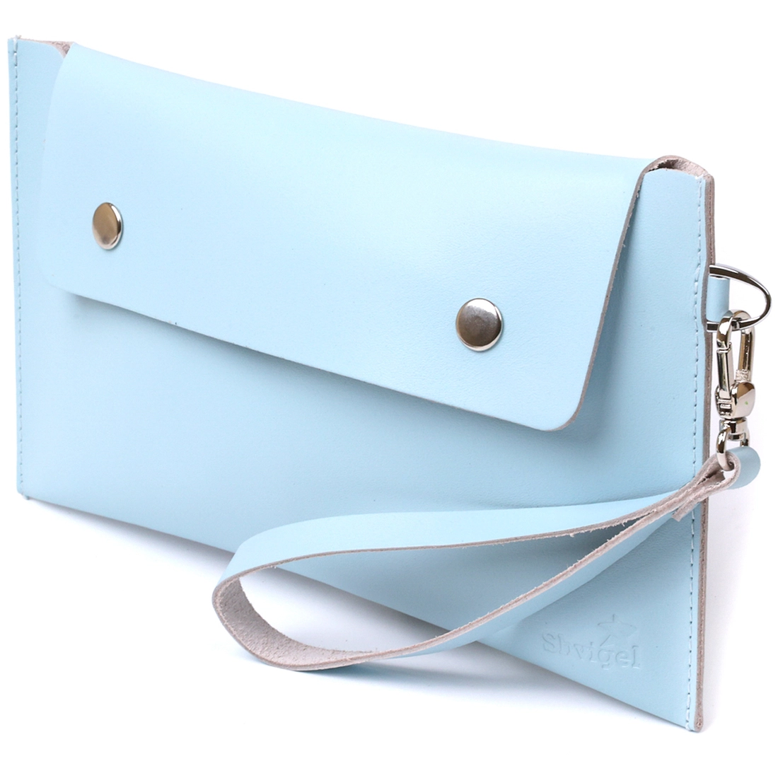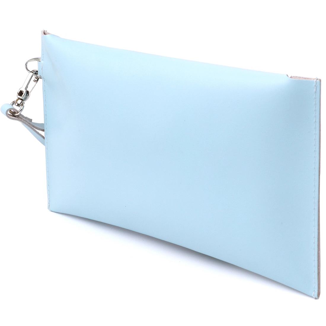 Интересная женская косметичка для путешествий или повседневного использования. Материал изготовления – натуральная высококлассная кожа в гладкой и приятной на ощупь фактуре. Закрывается изделие на клапан с двумя кнопками, также есть ремешок съёмный на запястье. Цвет данной модели – нежно голубой, что смотрится очень красиво. Такая косметичка, несомненно, станет вашим любимым аксессуаром.