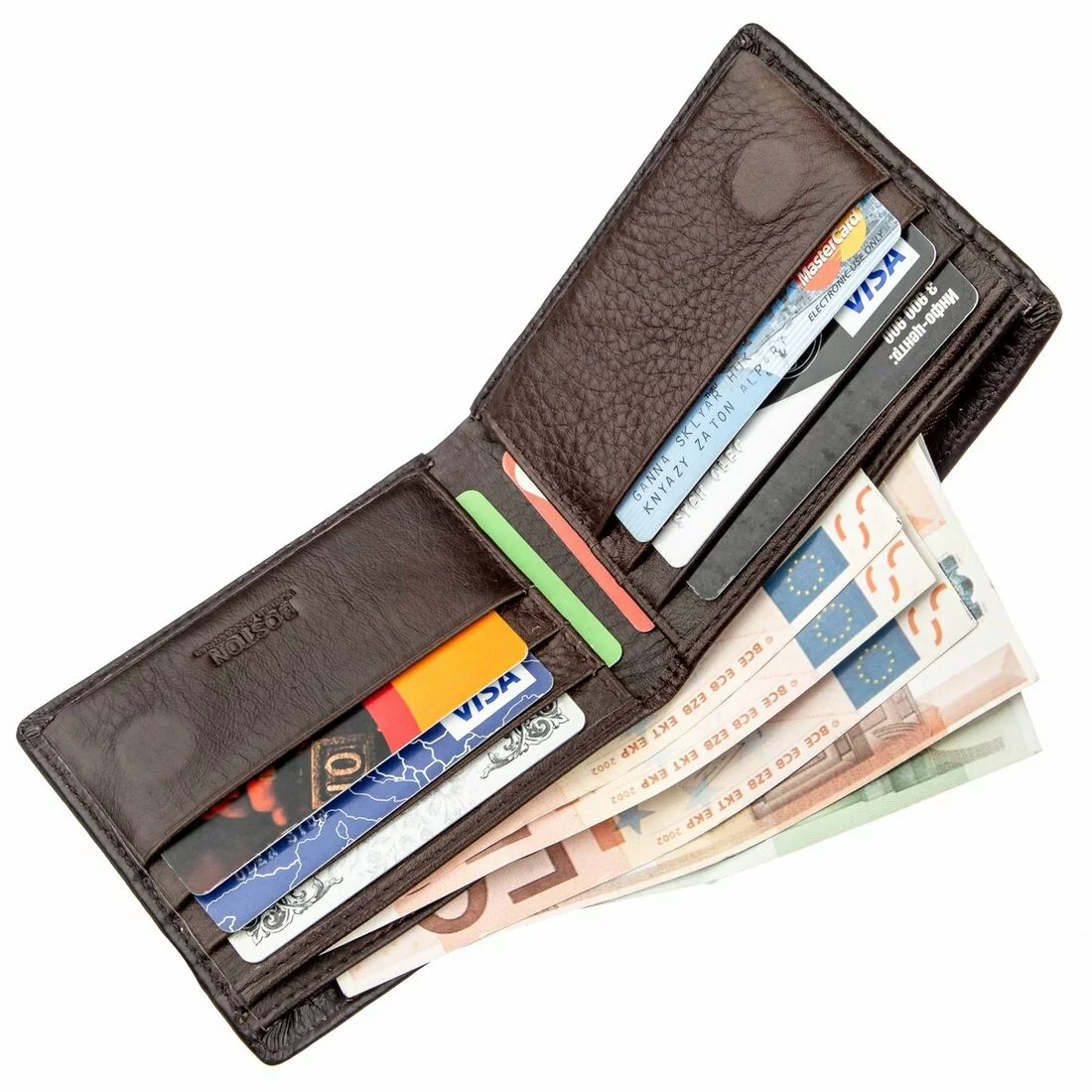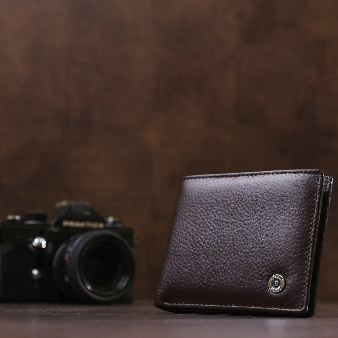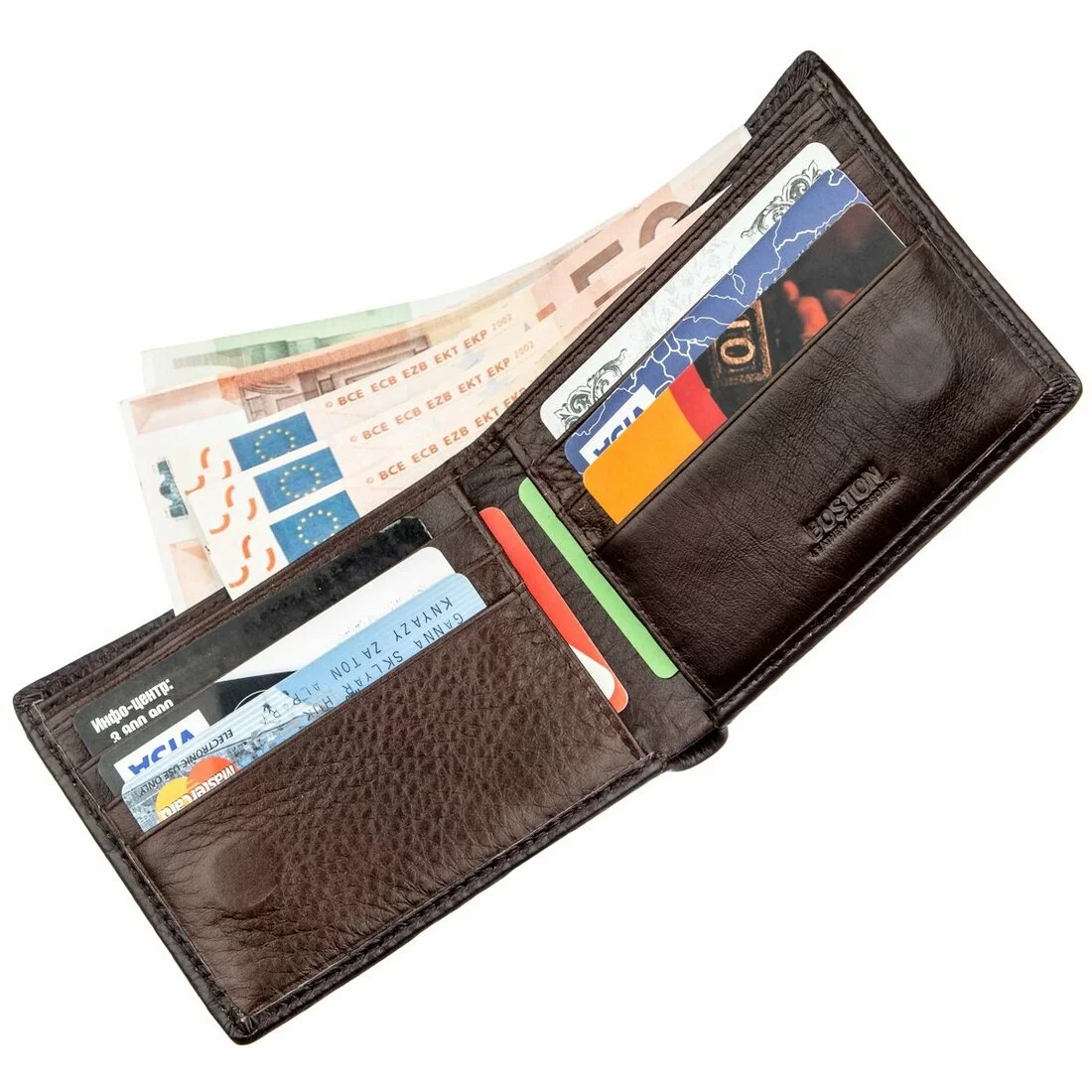 Отличный мужской бумажник из натуральной высококлассной кожи в коричневом цвете, что придает ему особого шарма. Имеет небольшие размеры, но все необходимое Вы вполне сможете в него вместить. Легко помещается в любой карман и даже в совсем миниатюрную сумку. Такой бумажник практичен и очень удобен в использовании, особенно интересный является способ закрывания кошелька, а именно - на магнит. А это довольно таки выигрышная функция данного аксессуара. Упакован кошелек в белую плотную картонную коробку с фирменным логотипом.