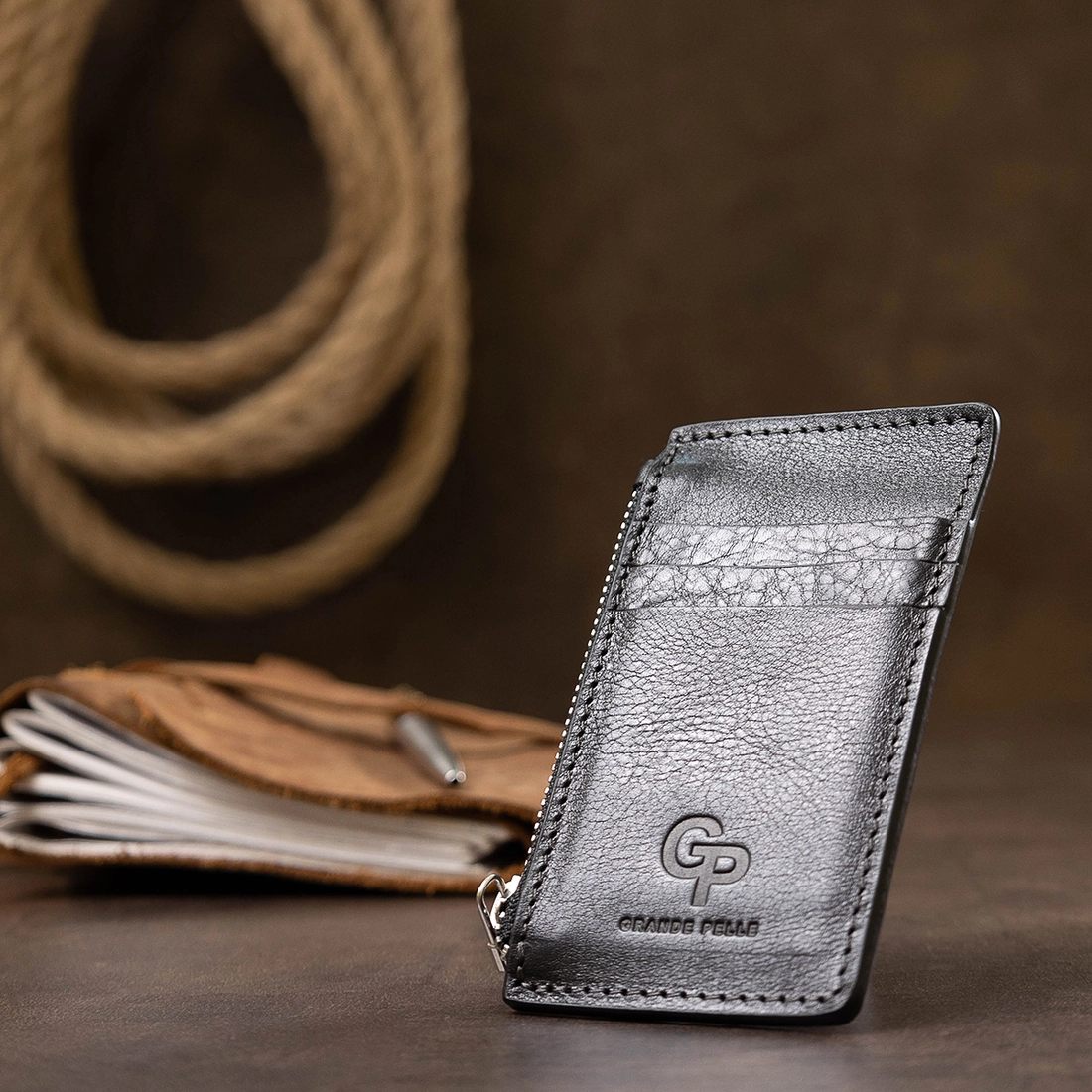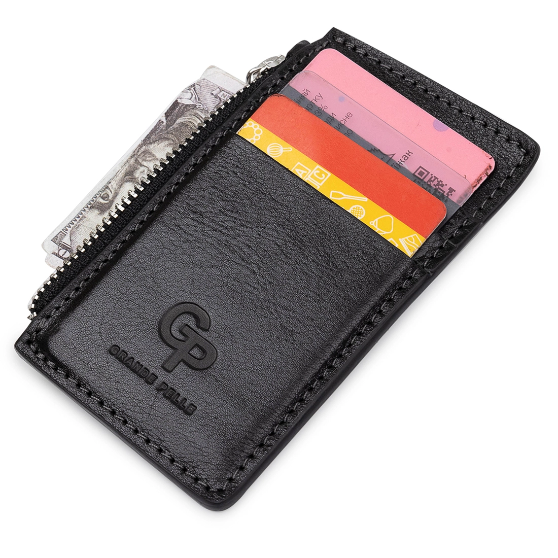 Небольшой кожаный картхолдер от украинского производителя. Выполнен из натуральной кожи высокого качества, которая устойчива к износу и повреждениям. Имеет три открытых кармана для карт и одно отделение на молнии для карт или мелочи. Упакован аксессуар в уплотненный фирменный чехол.