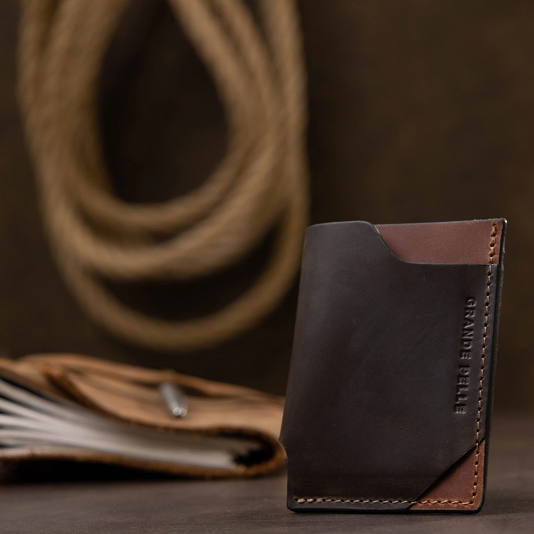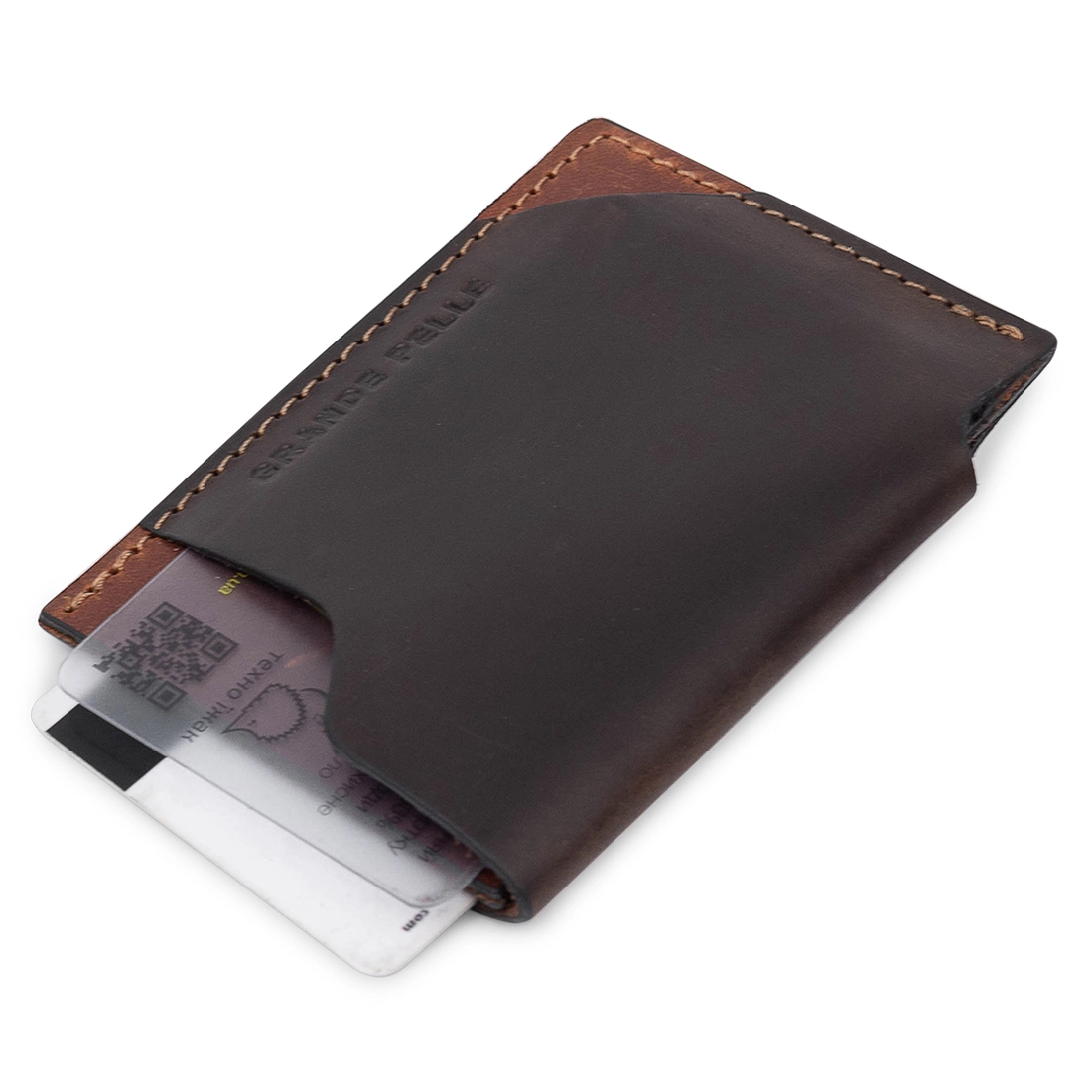 Необычный картхолдер из натуральной кожи высокого качества. Имеет гладкую матовую фактуру и красивое сочетание коричневого цвет разных оттенков. На лицевой стороне есть тиснение логотипа бренда. Упаковано изделие в фирменный чехол, поэтому может стать хорошим презентом для близкого человека.