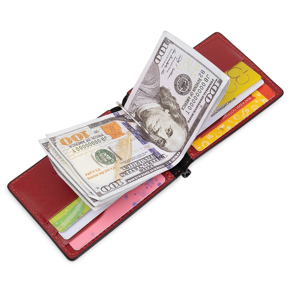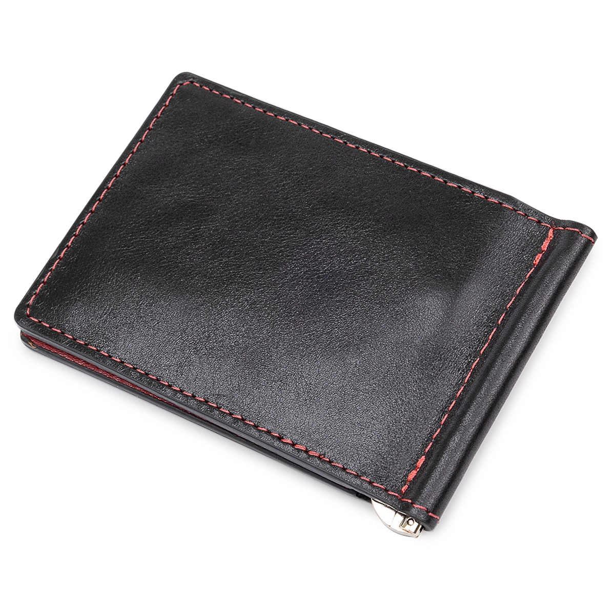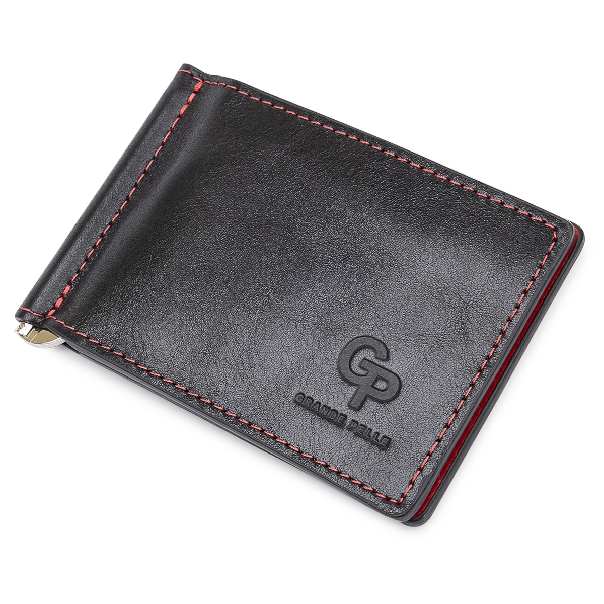 Стильный кожаный зажим для денег с красивым сочетанием черного и красного цвета, по периметру также строчка с красной ниткой. Внутри расположились металлический зажим, слоты для пластиковых и визитных карт и два потайных кармана. Само изделие упаковано в уплотненный фирменный чехол.