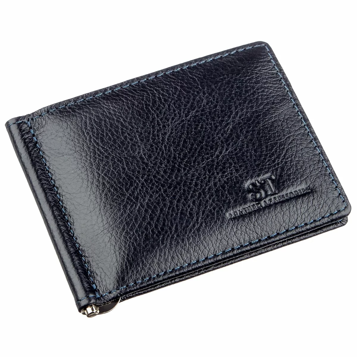Классический мужской зажим для денег в строгом и выдержанном стиле. Материал изготовления – добротная натуральная кожа с высокими показателями износостойкости. Имеет мягкую и зернистую фактуру. Цвет изделия – темно-синий, что смотрится очень модно и современно. Подойдет для мужчин в любом возрасте и положении, особенно если они придерживаются стиль минимализма. Такой аксессуар легко поместится в сумку любых размеров или в карман, что очень удобно и практично. Упакован зажим в плотную картонную коробку белого цвета с фирменным логотипом.