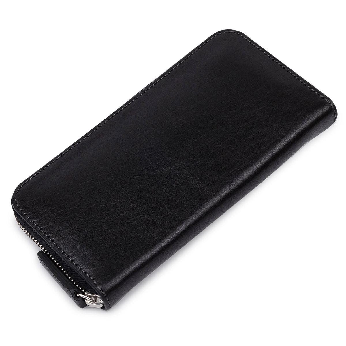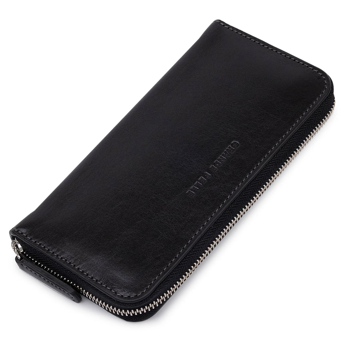 Превосходный вместительный кошелек на молнии из натуральной высококачественной кожи. Имеет красивый черный цвет и гладкую фактуру. Внутреннее наполнение хорошо продуманное и практичное, в нем поместятся купюры, монеты, различные карточки и др. Упакован данный кошелек в фирменную картонную коробку с логотипом бренда.