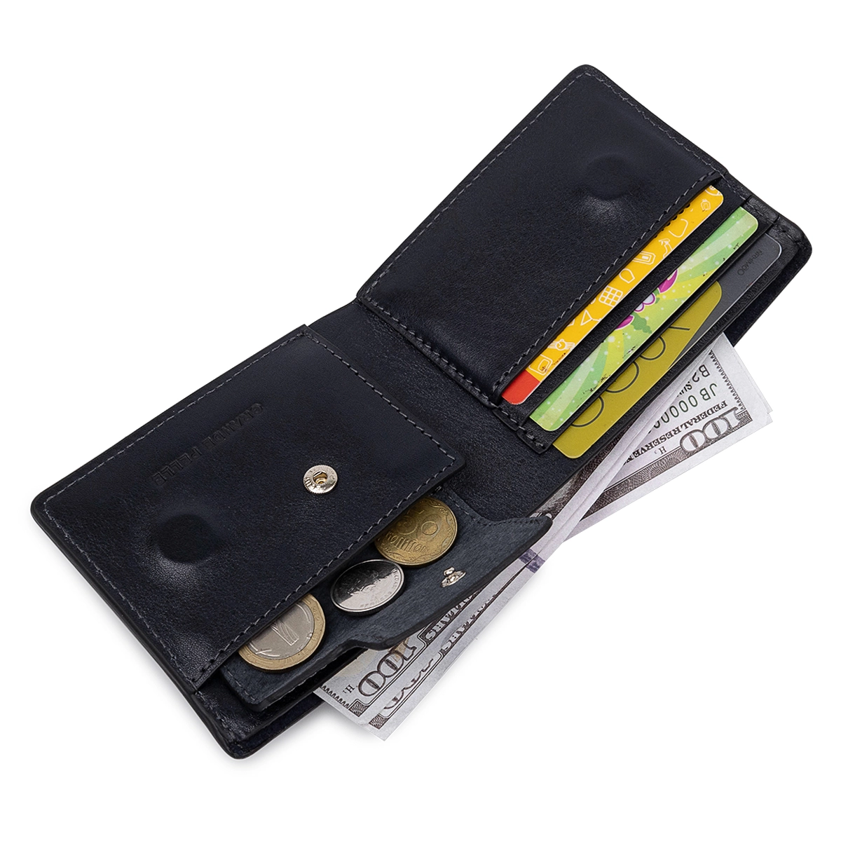 Практичное мужское портмоне в темно-синем цвете от украинского производителя. Материал изготовления - мягкая и приятная на ощупь натуральная кожа высокого класса. Внутреннее наполнение представлено в виде двух просторных отделений для купюр, слотов для пластиковых карт и удобной монетницей на кнопке. Закрывается портмоне на магнит.