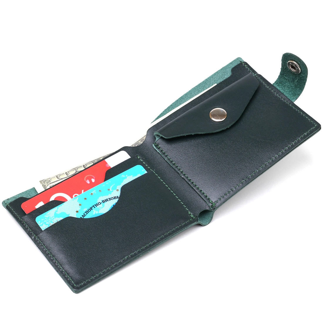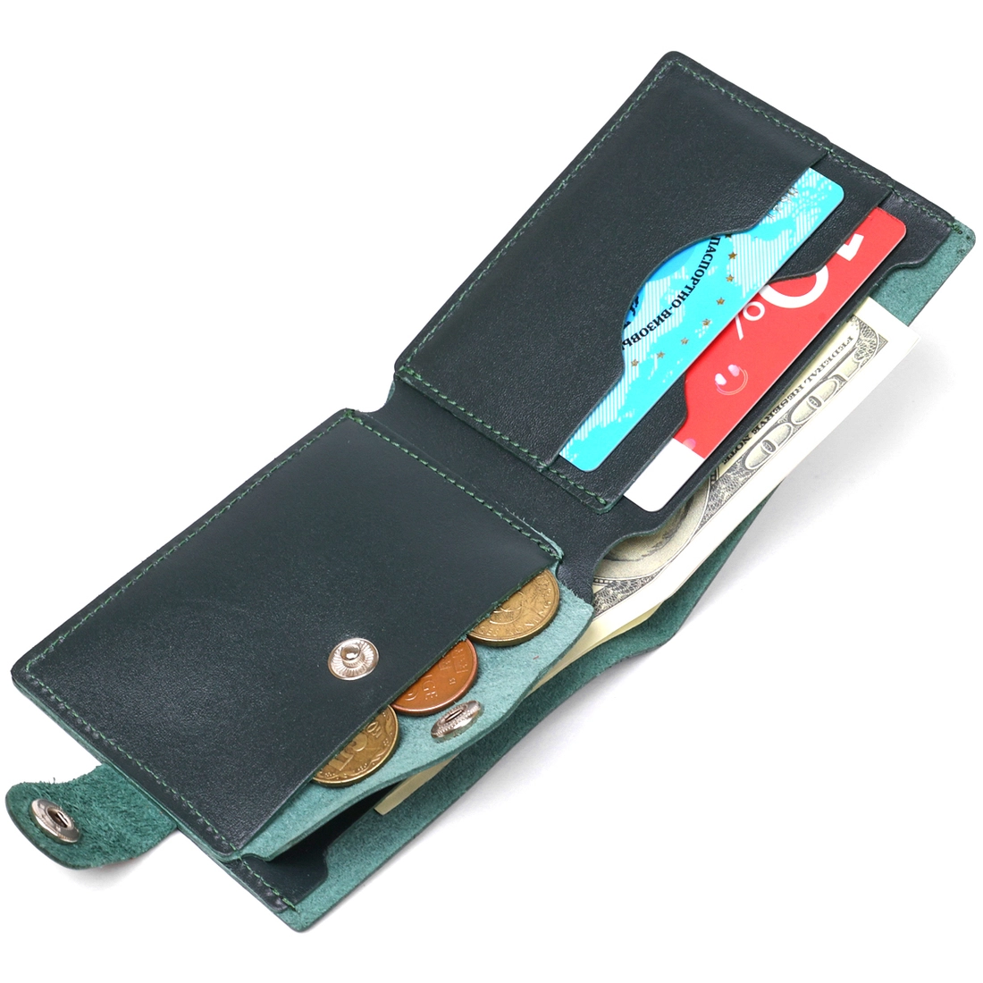 Удобное и практичное портмоне из натуральной кожи высокого качества и сопротивляемости к износу. Его точно высоко оценят почитатели негромоздких, но вместительных аксессуаров. Выполнено изделие в темно-зеленом цвете, фактура – гладкая. Внутри есть место для купюр, монет и пластиковых карточек. Закрывается кошелек с помощью кожаного хлястика на кнопке.