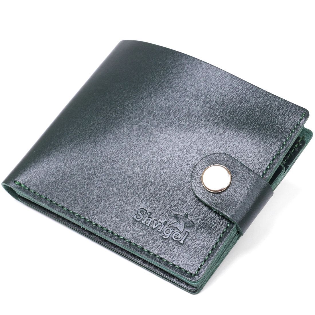 Удобное и практичное портмоне из натуральной кожи высокого качества и сопротивляемости к износу. Его точно высоко оценят почитатели негромоздких, но вместительных аксессуаров. Выполнено изделие в темно-зеленом цвете, фактура – гладкая. Внутри есть место для купюр, монет и пластиковых карточек. Закрывается кошелек с помощью кожаного хлястика на кнопке.