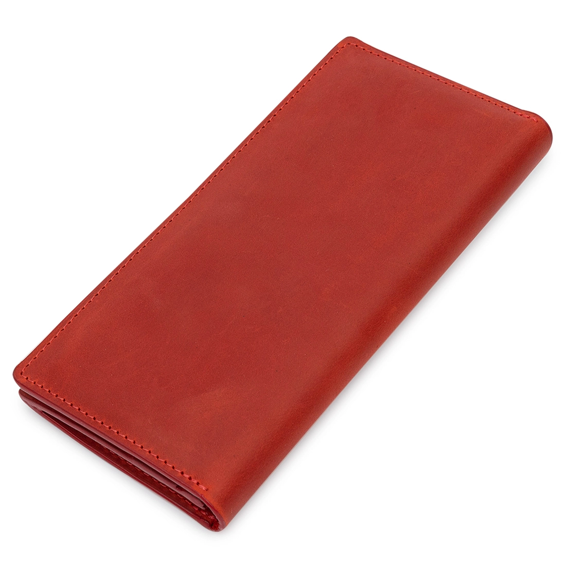 Женское кожаное портмоне с гладкой матовой фактурой, что очень приятно на ощупь. Выполнено изделие в насыщенном красном цвете с аналогичными строчками по периметру. Внутри есть три вместительных отделения на всю длину для купюр и прочих бумаг, монетница на молнии, а также шесть удобных слотов для пластиковых карт. Упаковано портмоне в картонную коробку.