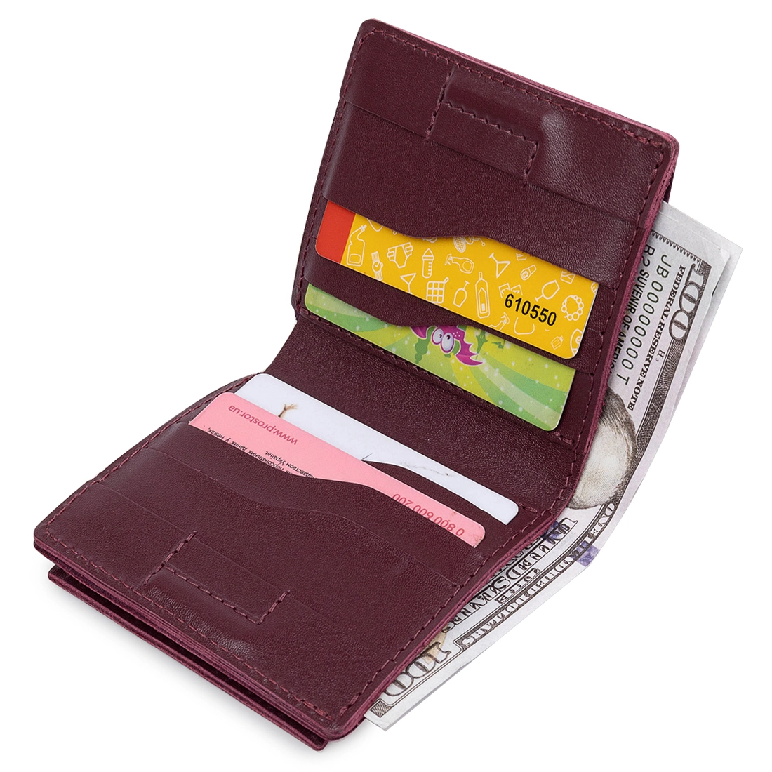Удобное и практичное женское портмоне высокого класса исполнения от украинского производителя. Материал изготовления – натуральная износоустойчивая кожа. Имеет гладкую и приятную на ощупь фактуру, цвет изделия – бордовый. Внутри есть просторное отделение для купюр, слоты для кредитных карточек. На внешней стороне разместилась небольшая монетница на молнии.