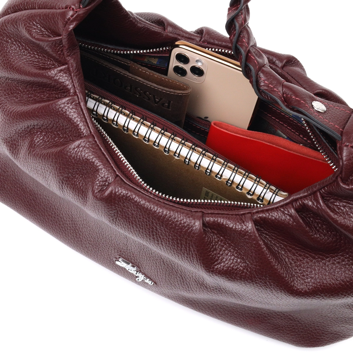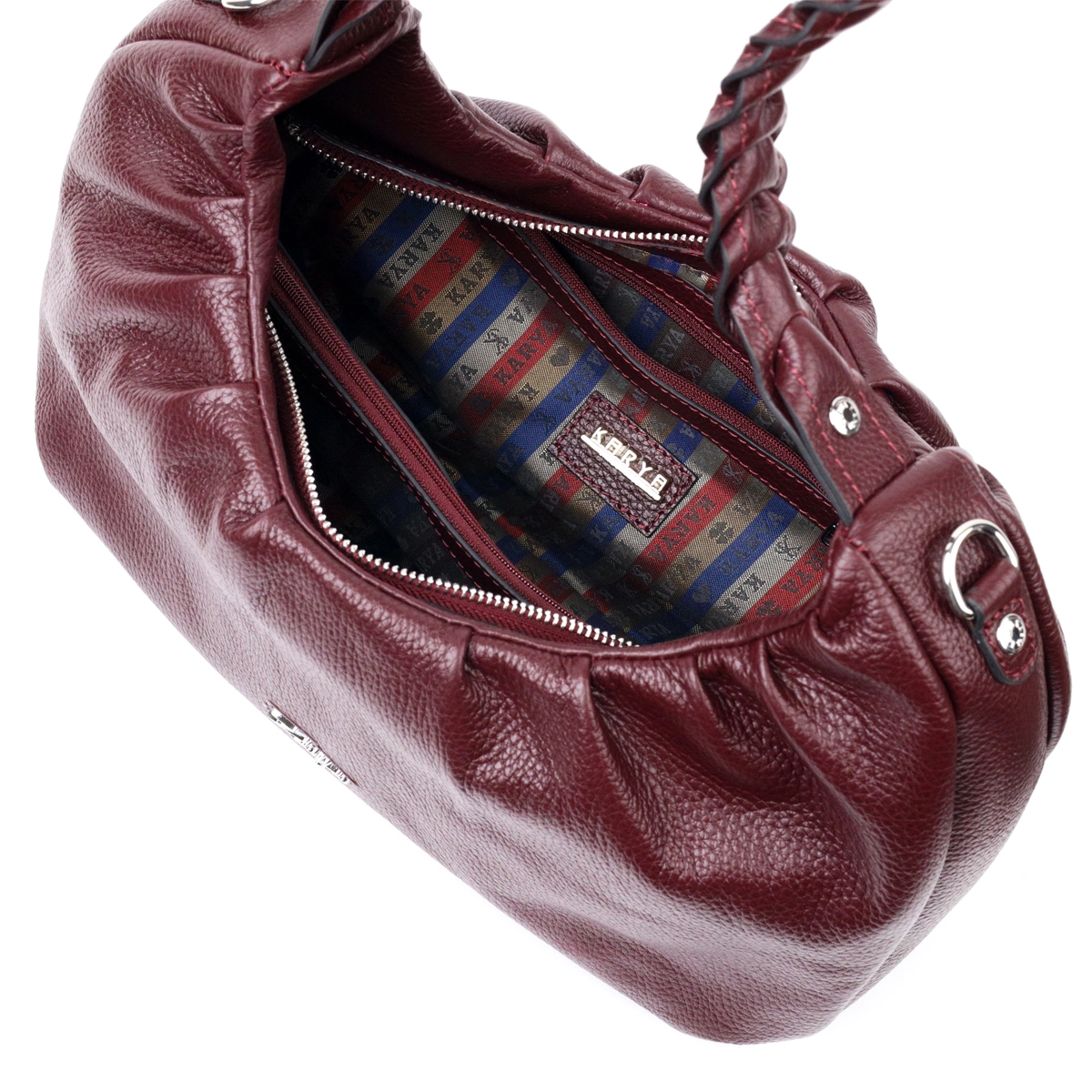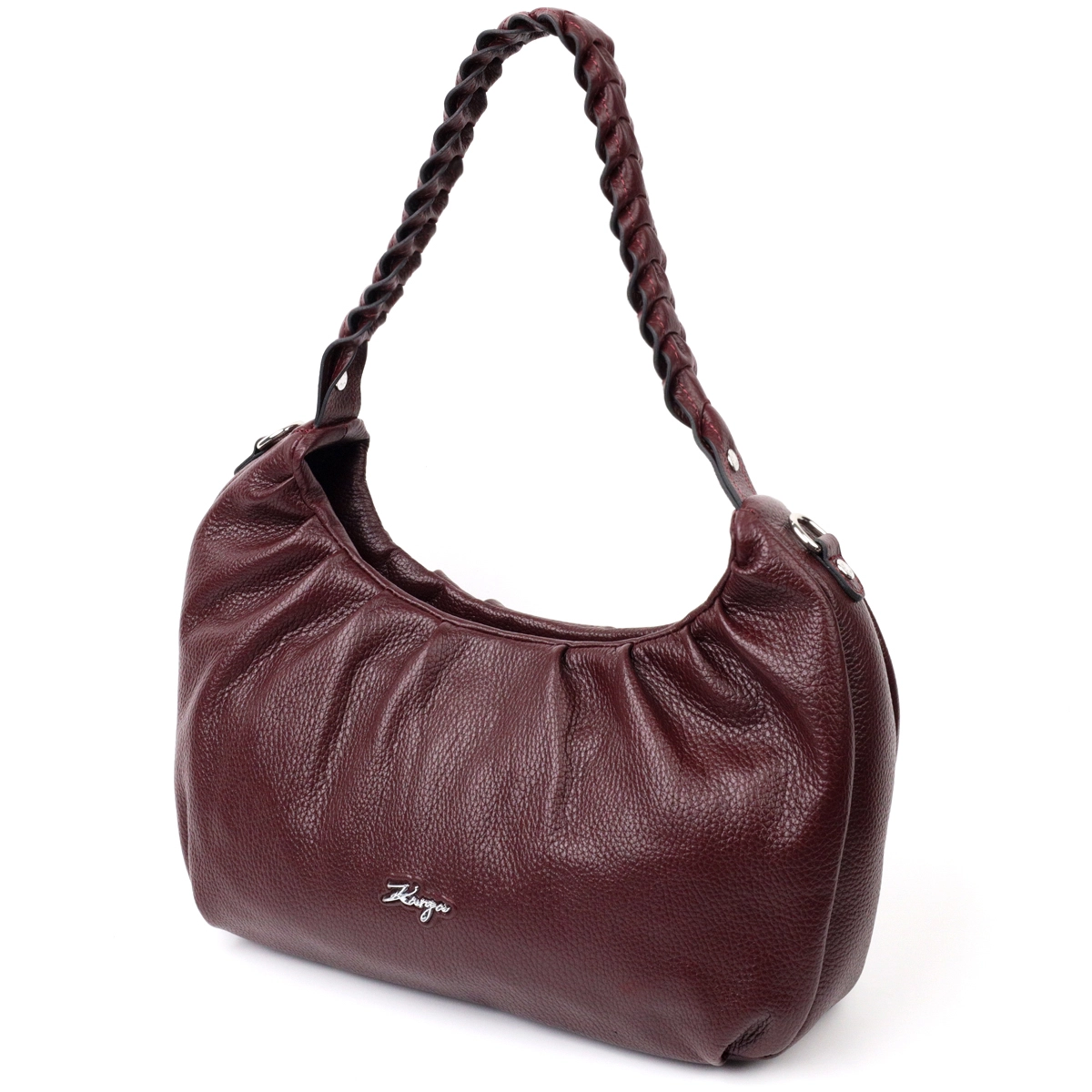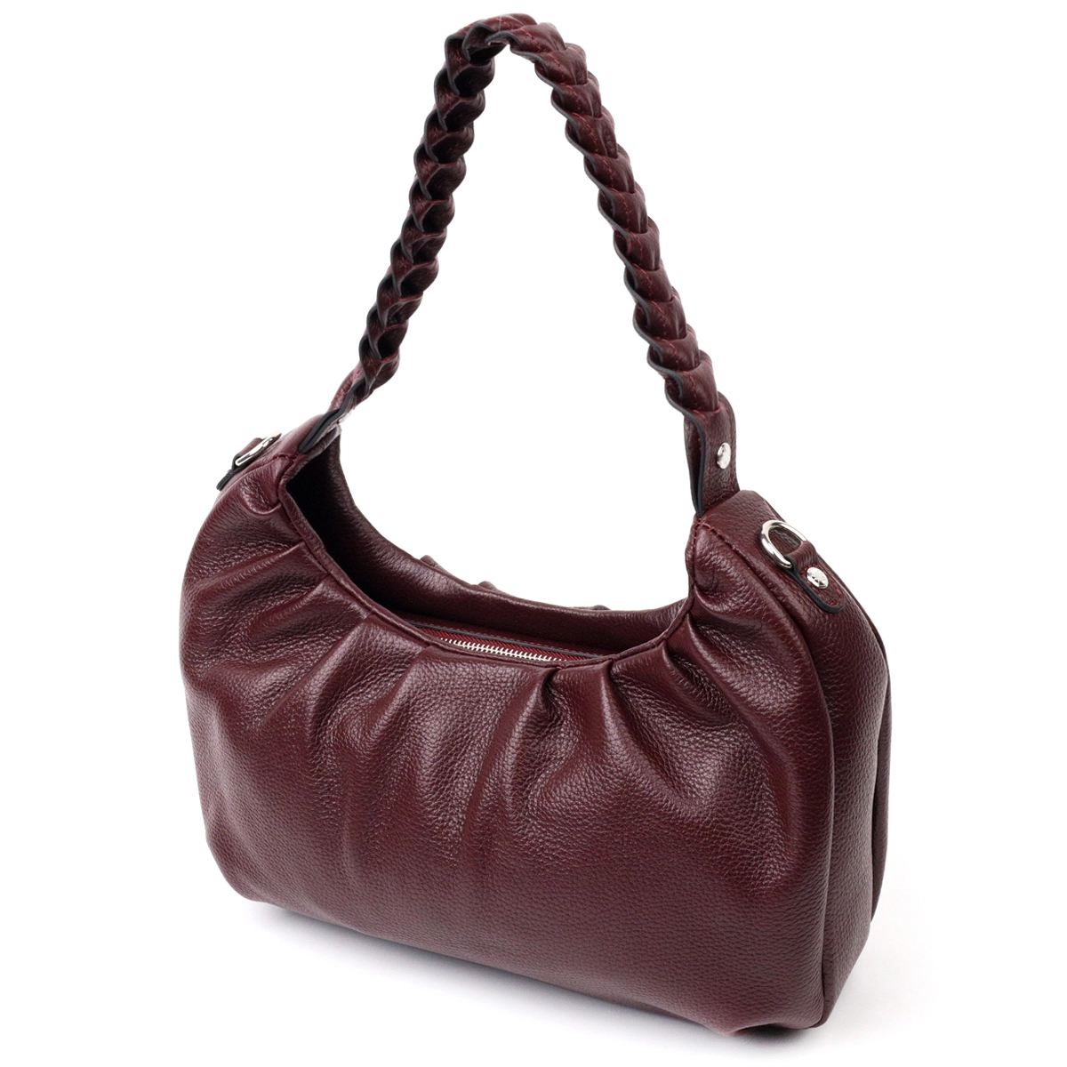 Отличная сумка-багет среднего размера из натуральной крупнозернистой кожи, в красивом бордовом цвете. Изделие имеет надежную плетенную ручку для переноса в руке, а также кожаный съемный и регулируемый по длине, плечевой ремень. Сумка функциональна и удобна в эксплуатации, изделие имеет качественную фурнитуру серебристого цвета и прочную подкладку. Аксессуар упакован в фирменный текстильный мешок Karya. Сумка из натуральной кожи всегда будет отличным подарком любой женщине.