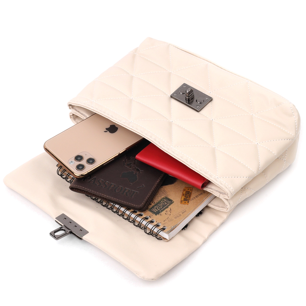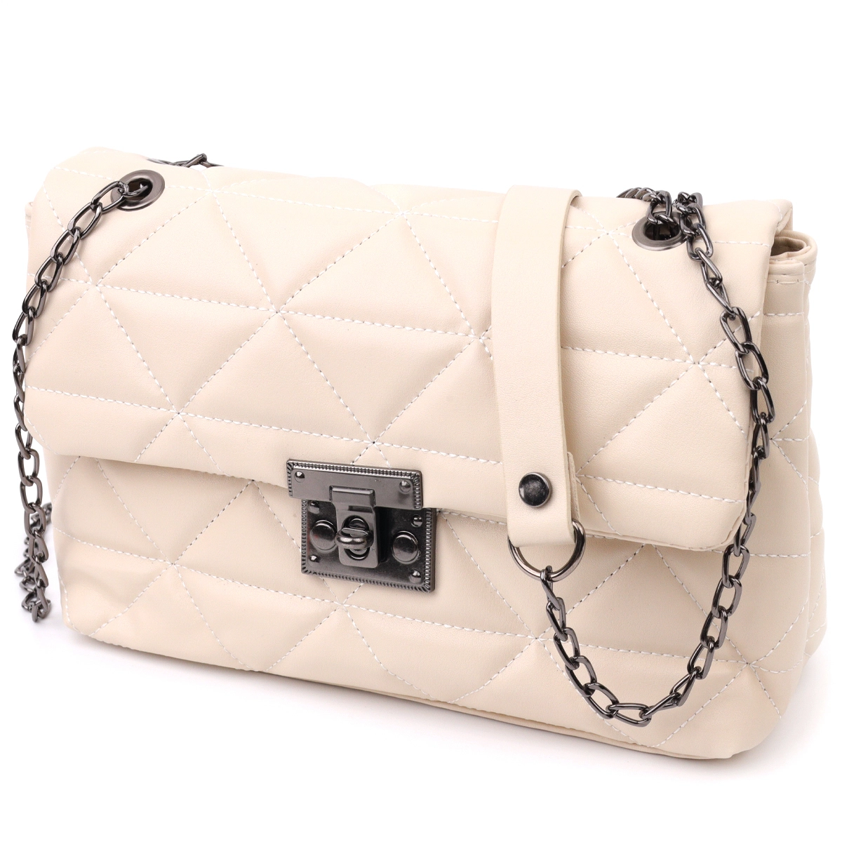 Чудесная сумка горизонтального типа в красивом бежевом цвете из мягкой и приятной на ощупь стеганной эко-кожи. Сумка имеет стильный дизайн. Аксессуар выглядит презентабельно и подойдет как под вечерний, так и повседневный образ. Фурнитура в сумке темное серебро, ремень на плече – сочетание цепочки и эко-кожи. Модель долгое время остается в идеальном состоянии, такую сумку приятно носить. Может быть отличным вариантом для подарка близкому человеку.
