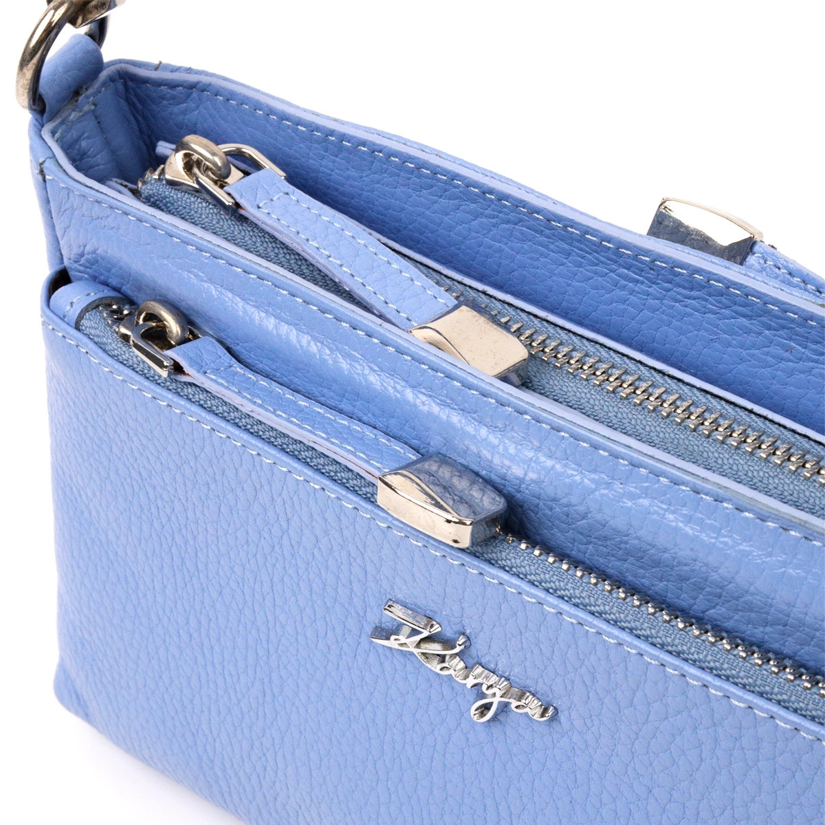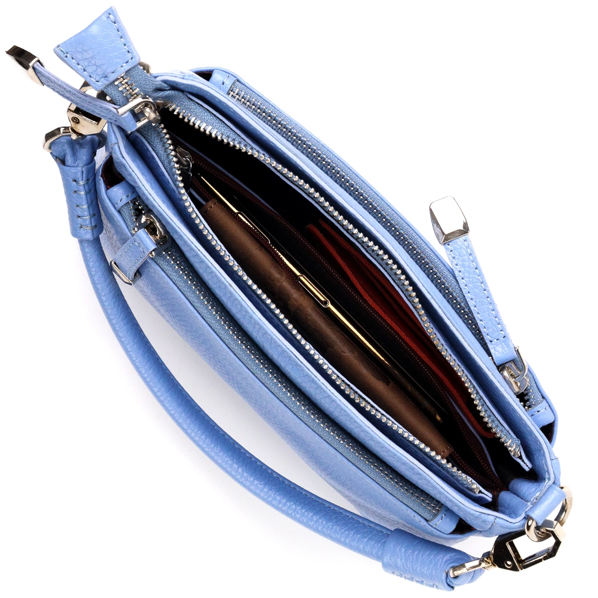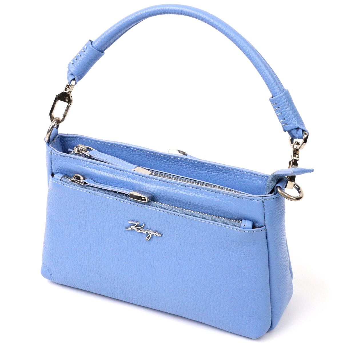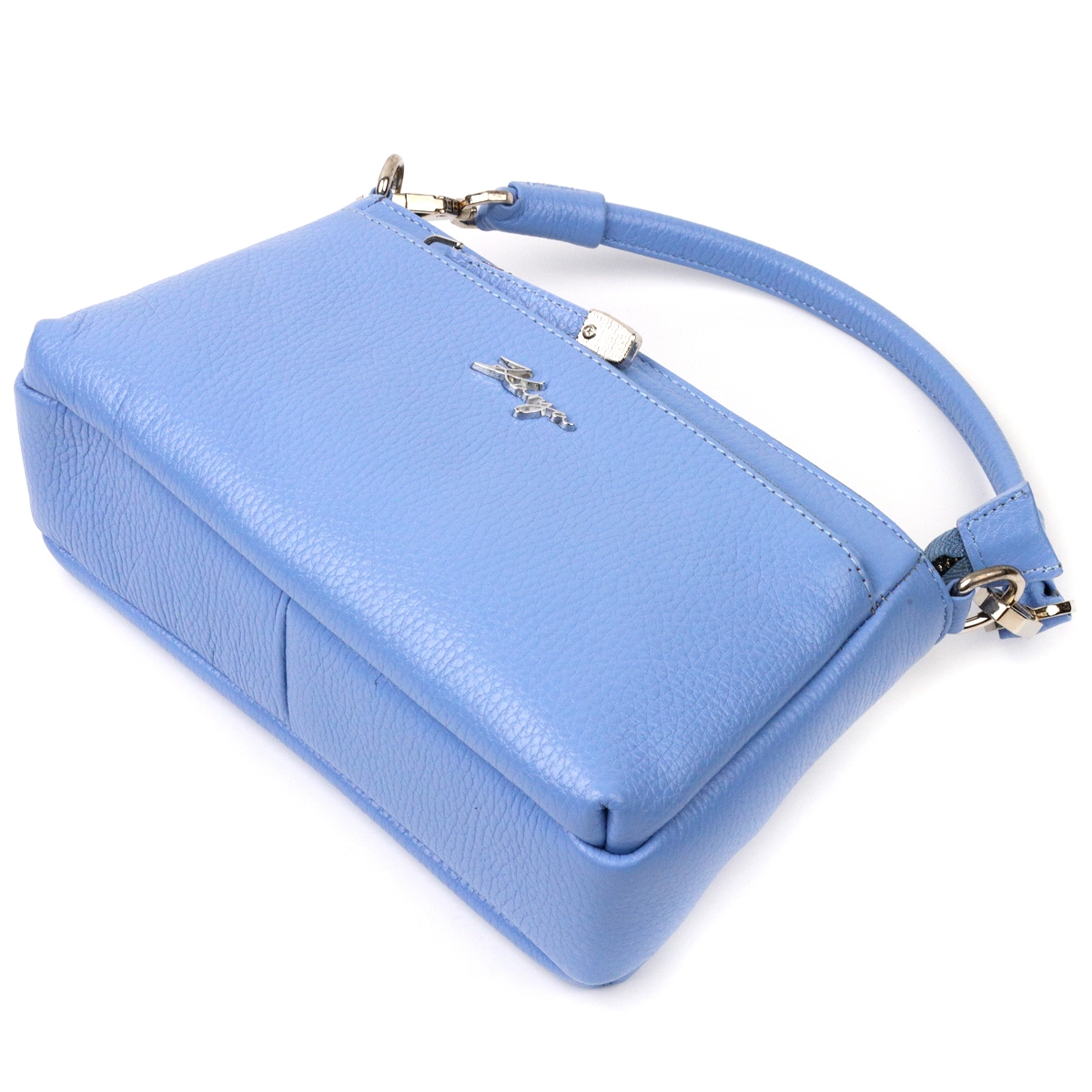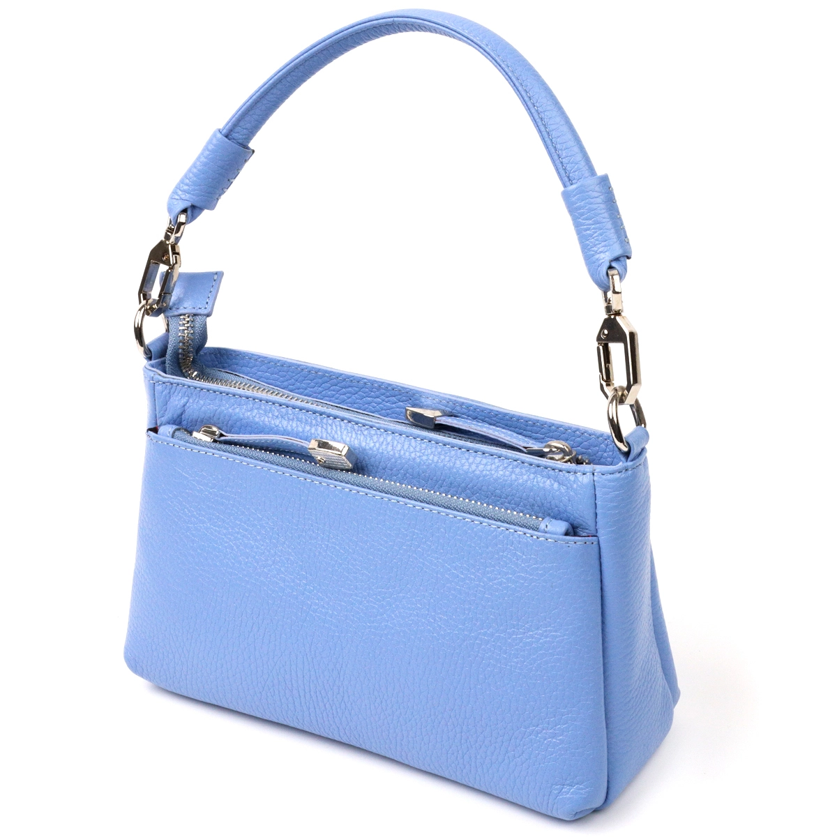 Вместительная женская сумка- клатч из натуральной зернистой кожи, красивого голубого цвета. Сумка функциональна и удобна в эксплуатации, качественная фурнитура серебристого цвета отлично дополняет стильный и незаурядный дизайн сумки. Сумка из натуральной кожи всегда будет отличным подарком любой женщине.