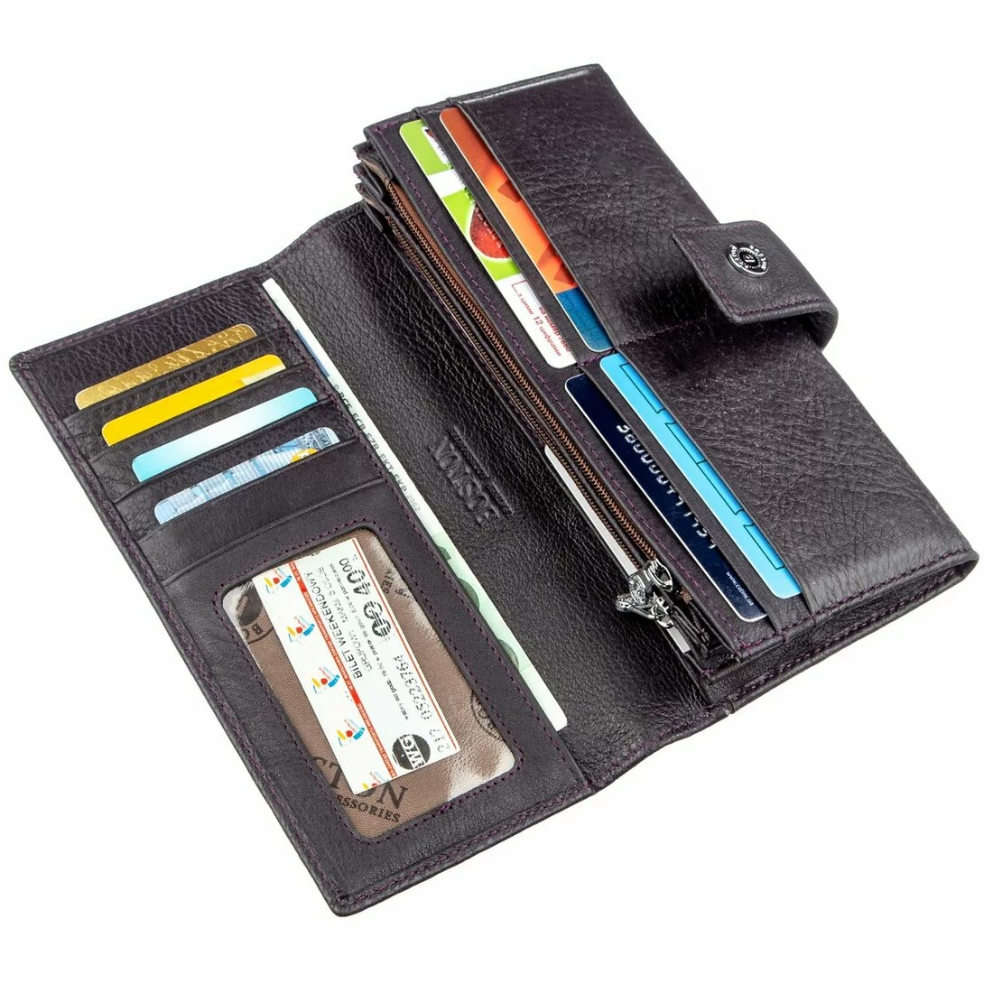 Красивый женский кошелек неординарного цвета, который сочетает в себе нотки фиолетового и темно-серого. Сделан данный аксессуар из натуральной кожи с гладкой и приятной на ощупь фактуры. Внутреннее наполнение кошелька можно охарактеризовать как практичное и очень функциональное. Есть достаточное количество отделений и карманов, а также отдел для мелочи на тыльной стороне бумажника. Таким кошельком Вы будете всегда довольны. Изделие прекрасно подойдет как для себя, так и на подарок дорогому человеку. При покупке кошелька, он будет упакован в фирменную картонную коробку белого цвета.