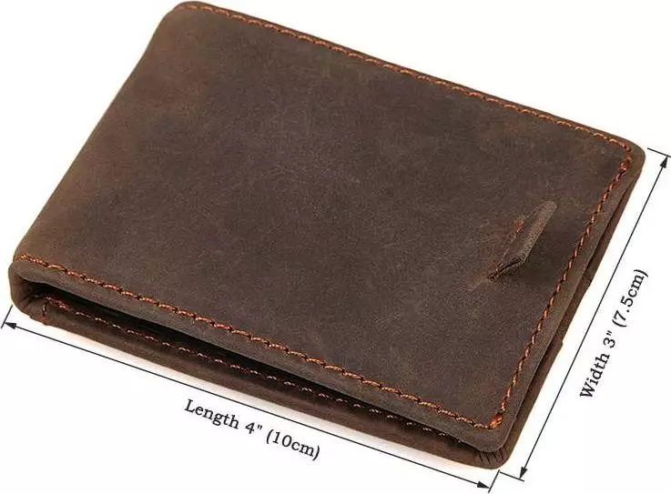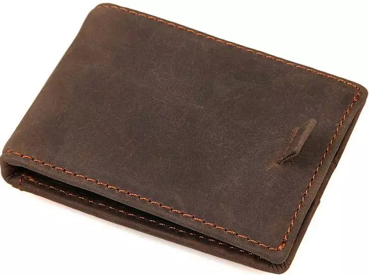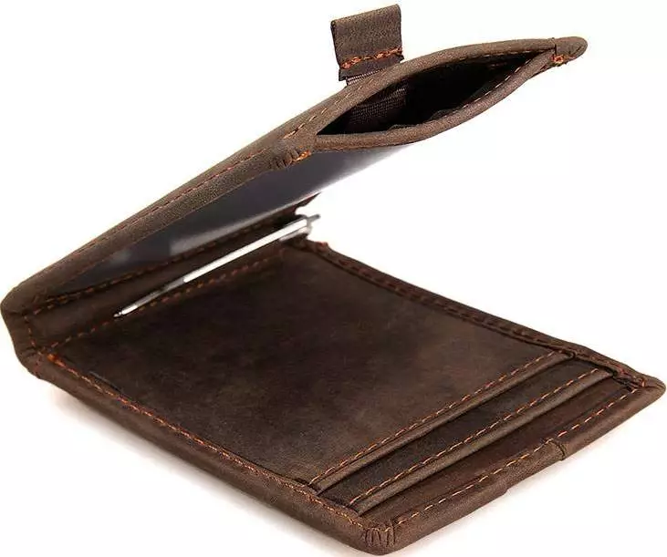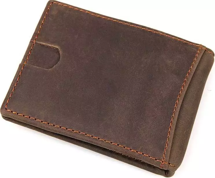 Интересный зажим для банкнот коричневого цвета. Аксессуар выполнен из высококачественной винтажной кожи. Цвет фурнитуры: серебро. Изделие аккуратно прошито коричневой сверхпрочной нитью. На задней внешней стороне аксессуара расположен карман для пластиковых карточек. Изделие упаковано в белый пылезащитный чехол.