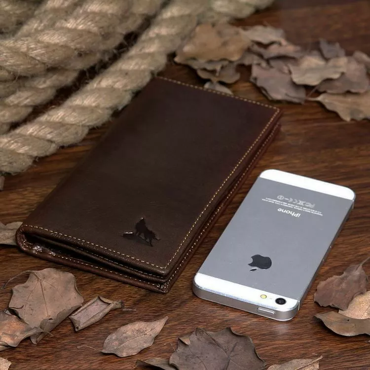 Эксклюзивный мужской бумажник. Аксессуар выполнен из толстой, натуральной коже. Купюры любых размеров помещаются с легкостью. Кошелек обладает благородным коричневым цветом, на лицевой стороне в правом нижнем углу находится тиснение в виде «волка».