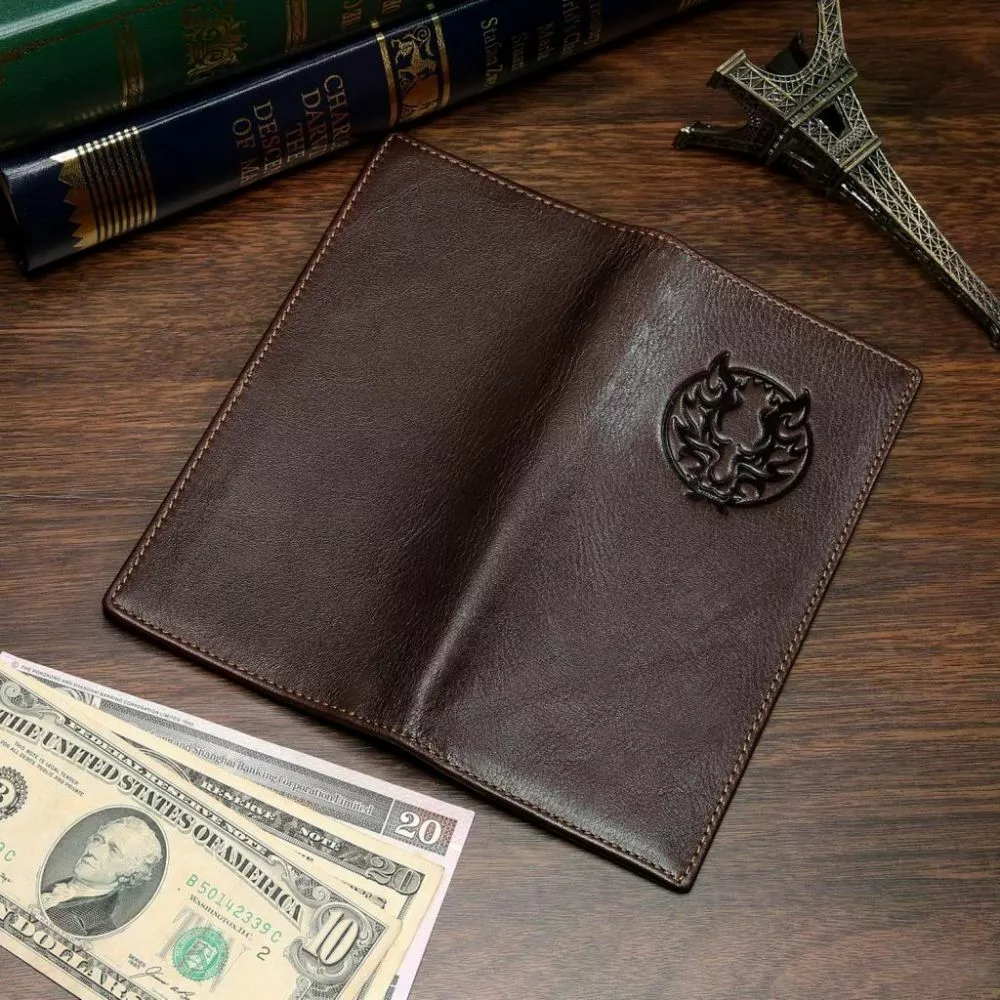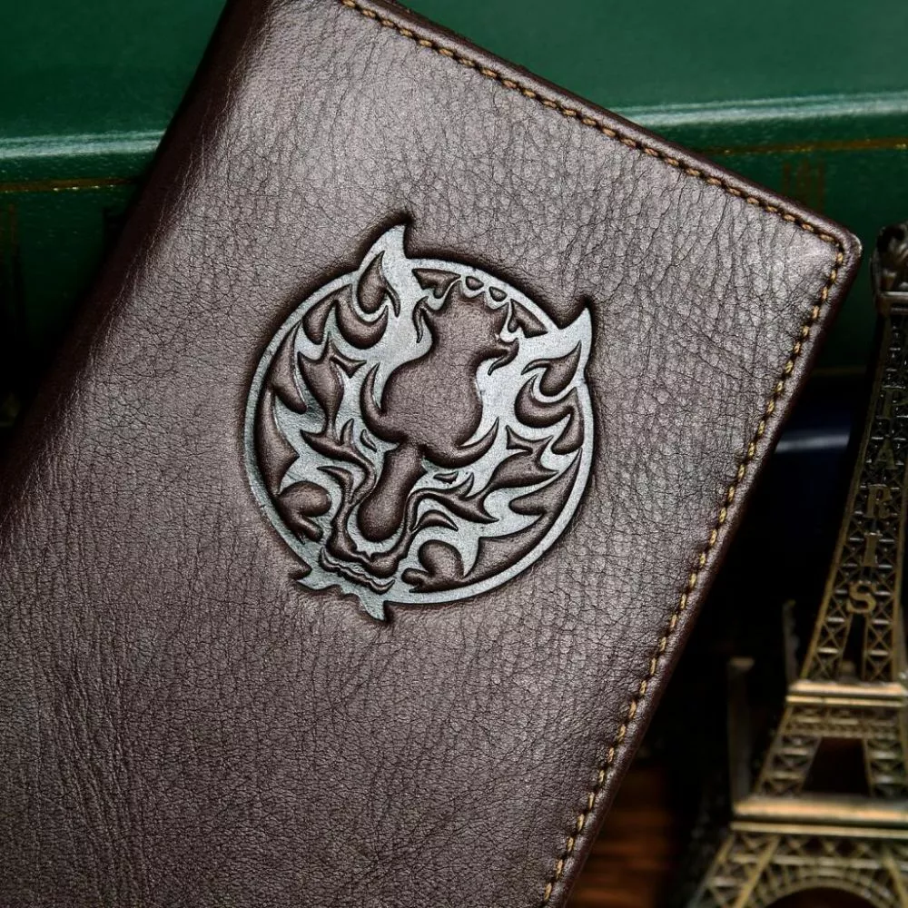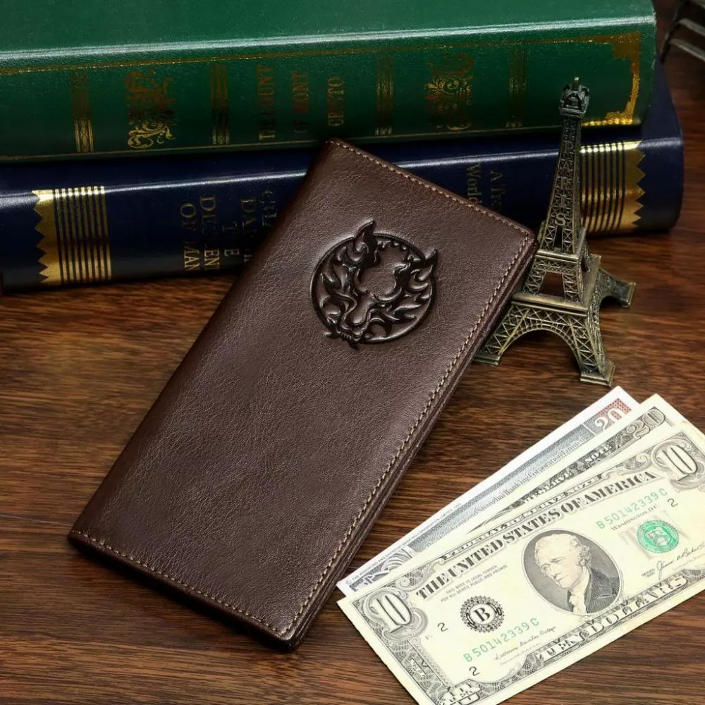Стильный мужской кошелек из натуральной кожи приятной на ощупь. Лицевая сторона изделия украшена тесненным декором в виде «тигра». Аксессуар прошит прочной надежной нитью светло-коричневого цвета. Кошелек может стать превосходным подарком ко Дню Рождения или к Новому Году.
