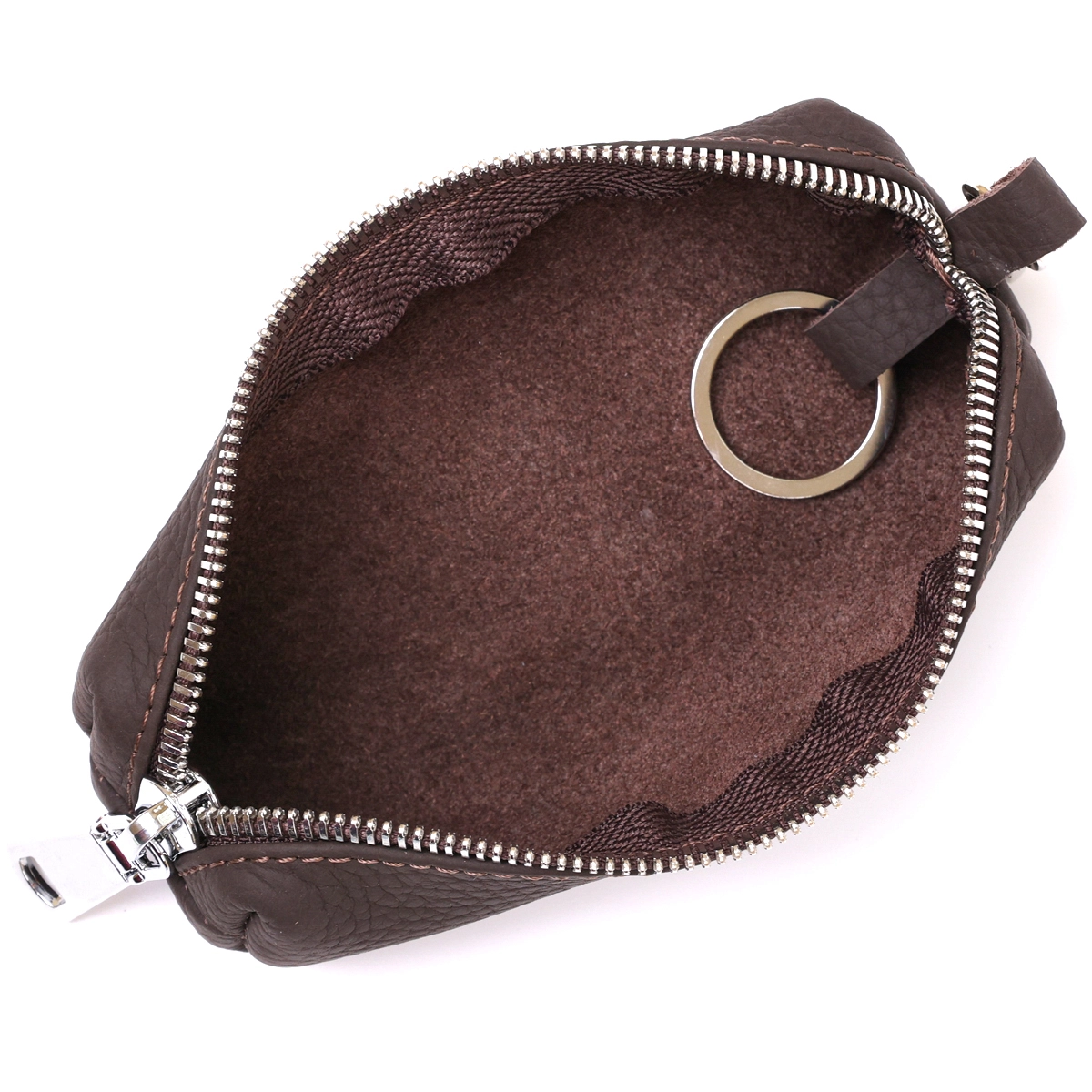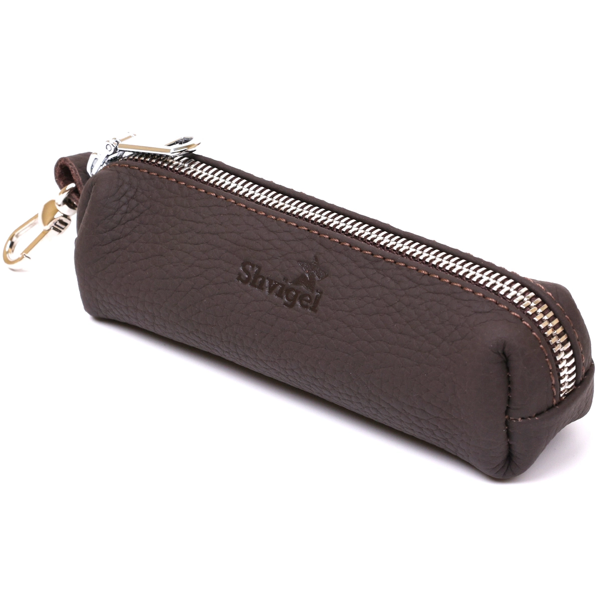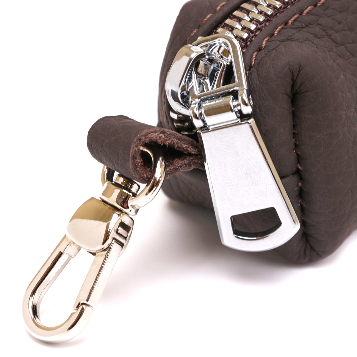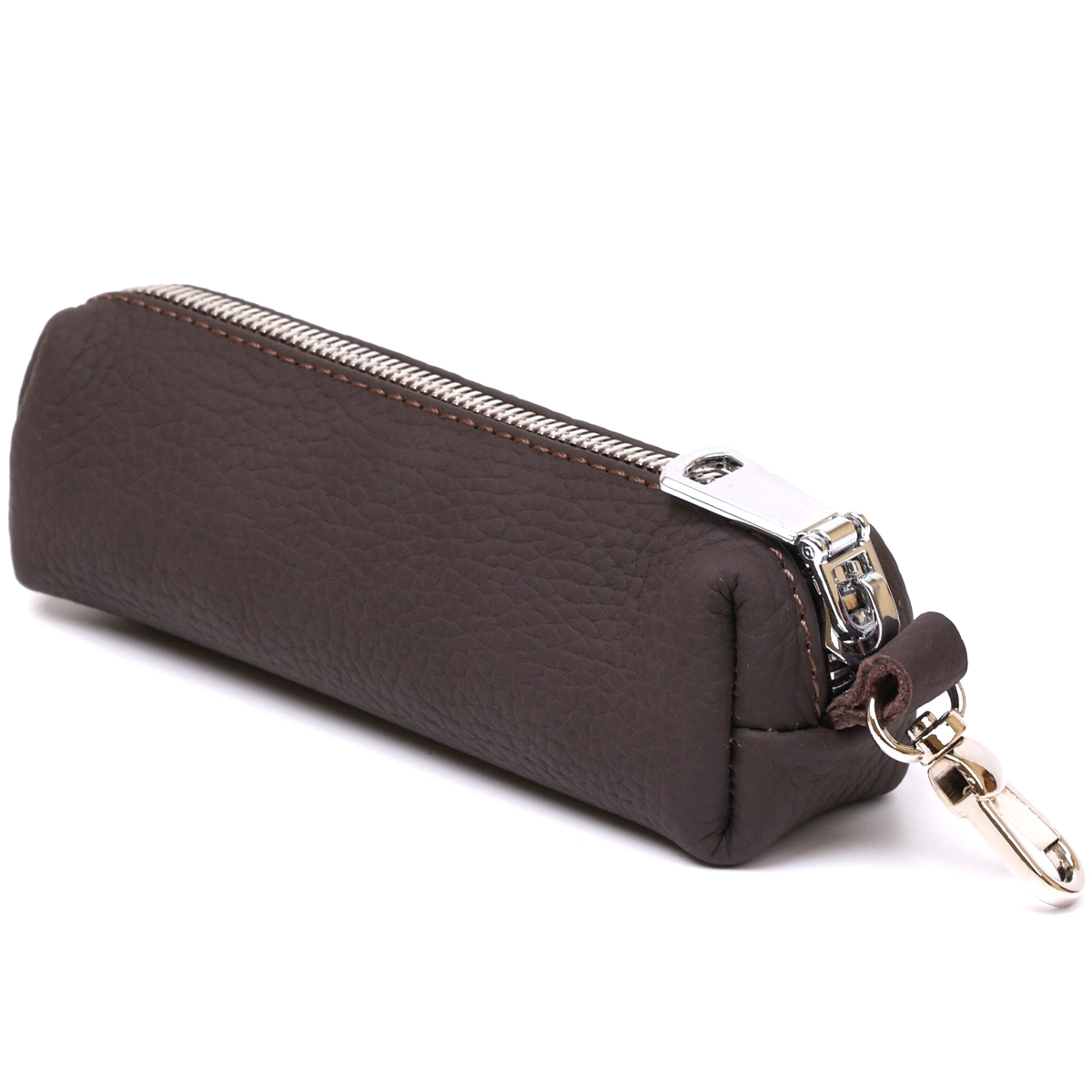 Очень красивая и стильная ключница в матовом коричневом цвете, что смотрится очень необычно и современно. Материал изготовления – натуральная кожа высокого качества, которая на ощупь очень мягкая и приятная. Фактура изделия – зернистая, фурнитура сделана в цвете под серебро, закрывается аксессуар на удобную молнию.