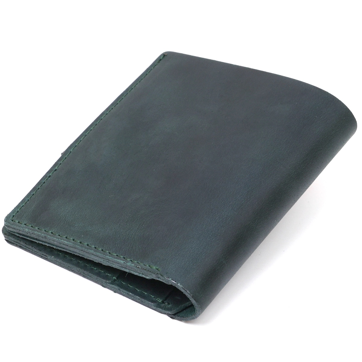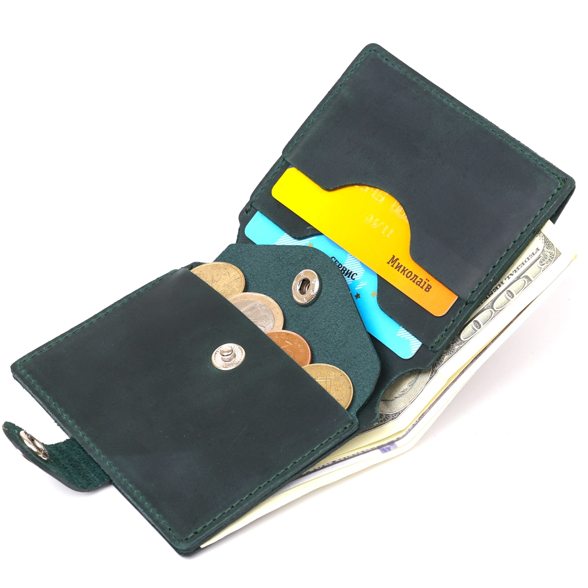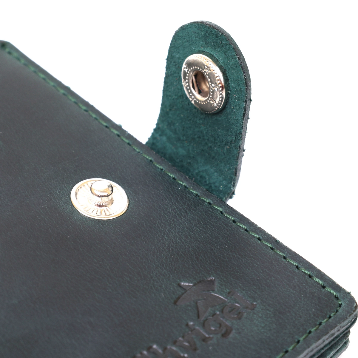 Прекрасное стильное портмоне в винтажном стиле и современном дизайне. Изготовлено изделие из натуральной кожи высокого класса, качество которой видно невооруженным глазом. Внутри есть вместительное основное отделение для купюр, слоты для пластиковых карточек и небольшая монетница на кнопке. Цвет изделия – темно-зеленый, фактура – матовая гладкая.