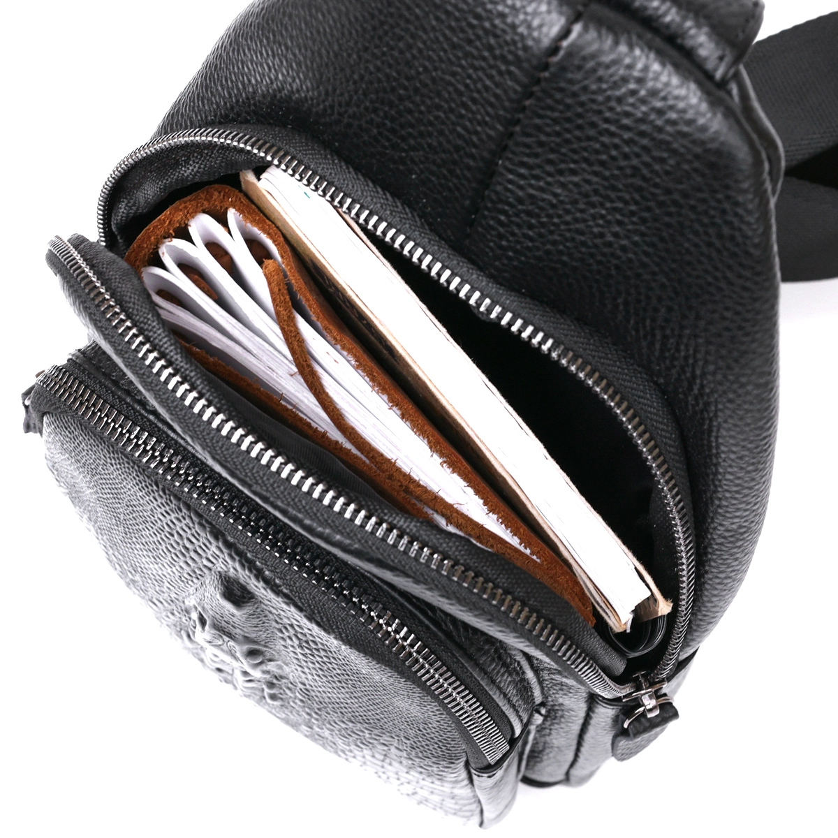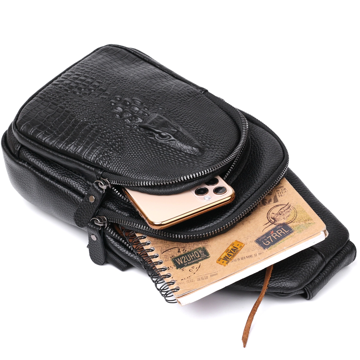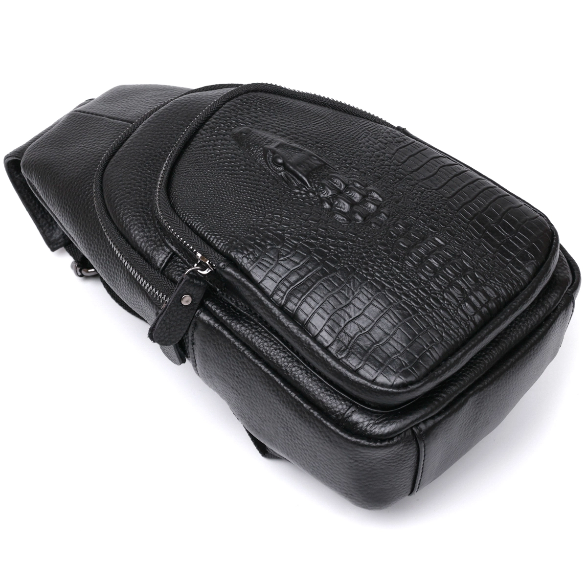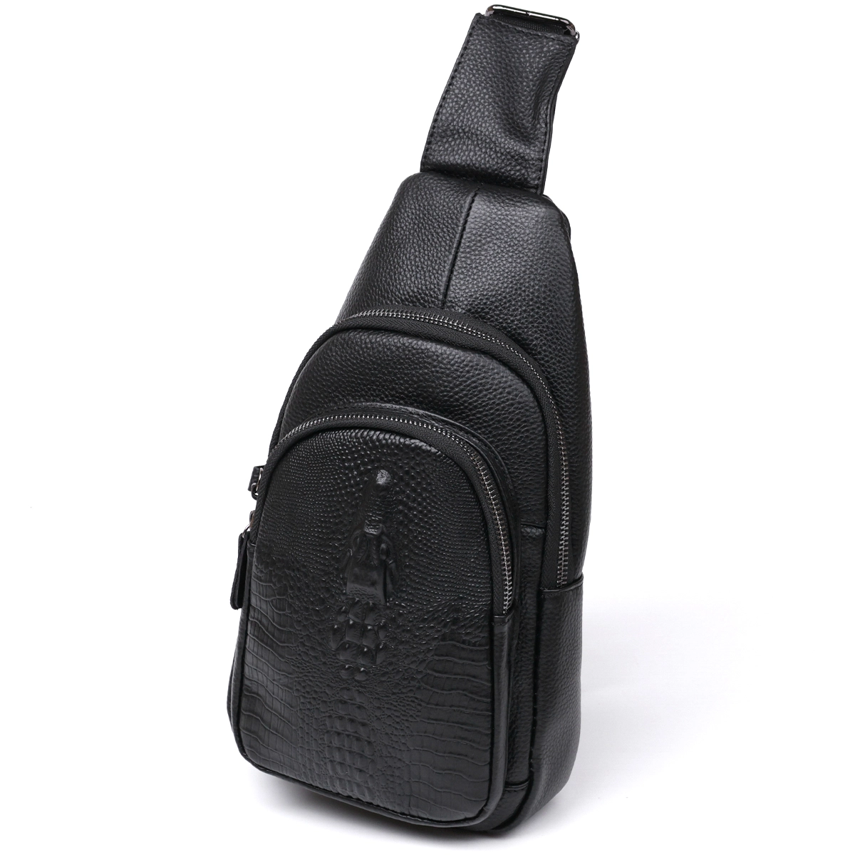 Современная молодежная сумка через плечо для активных и продвинутых людей. Выполнена модель из натуральной кожи высокого класса с повышенной износоустойчивостью. Имеет просторное основное отделение и дополнительные карманы на внешней стороне, что очень удобно и практично. Цвет изделия – черный, фактура – зернистая, внешний карман сделан под кожу крокодила.