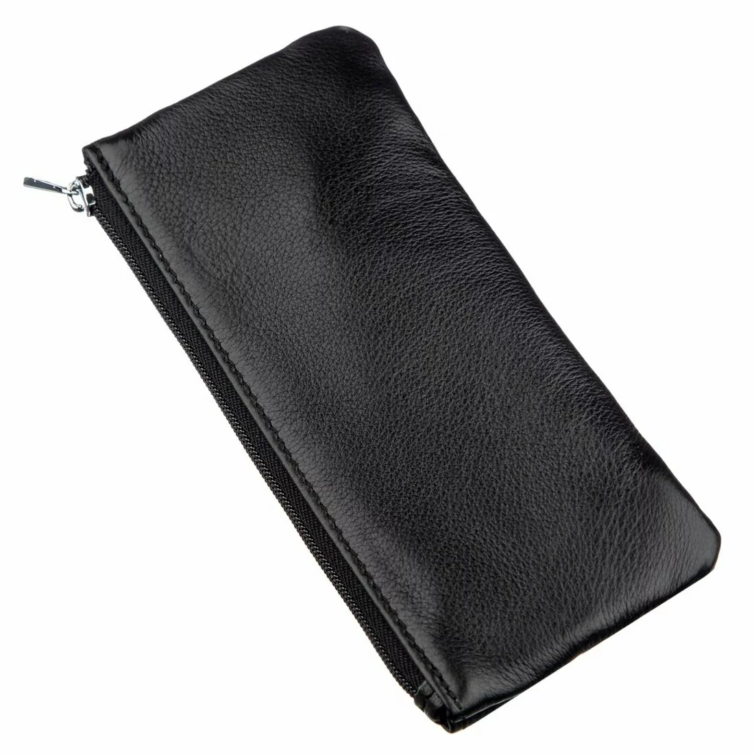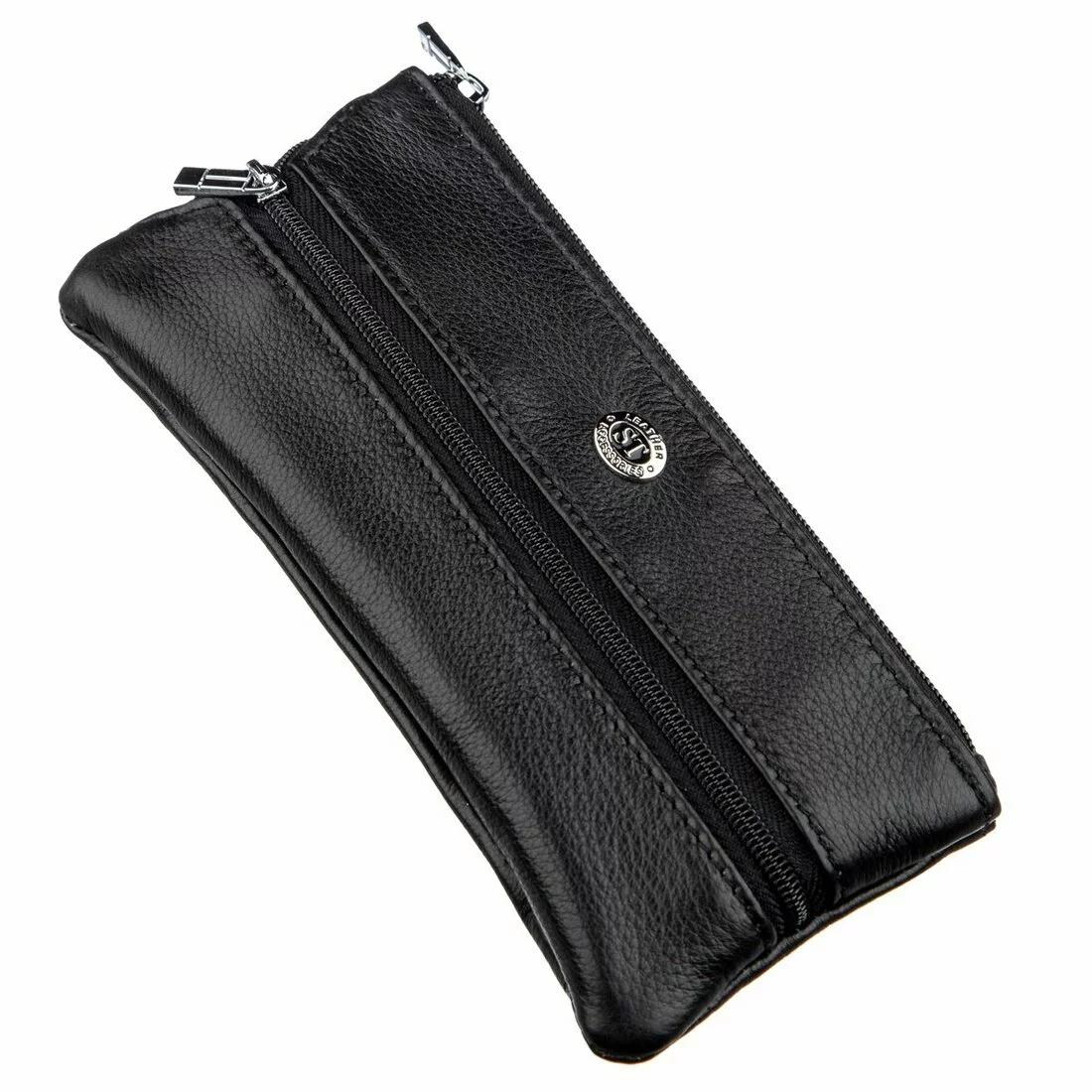 Современная и практичная ключница из натуральной кожи, мягкой и приятной на ощупь. Цвет – черный, что очень практично. Подойдет как мужчинам, так и женщинам. Имеет два отделения на молниях. В одном из них находятся два металлических кольца для ключей, которые фиксируются по принципу брелока. Кольца надежно держатся на металлических цепях. Во втором отделении Вы найдет еще четыре крючка для стандартных ключиков. Упакована ключница в плотную картонную коробку белого цвета.