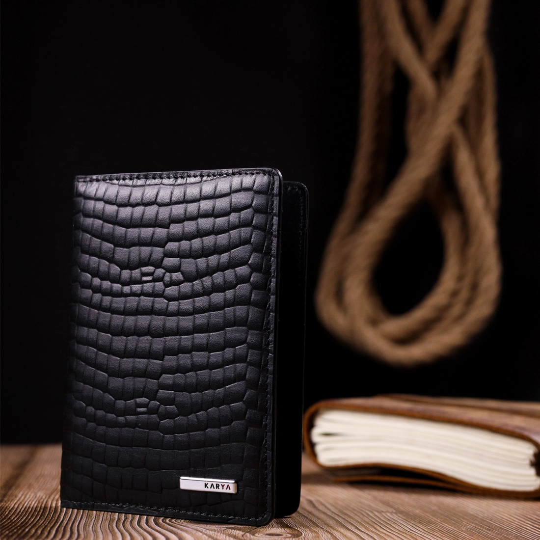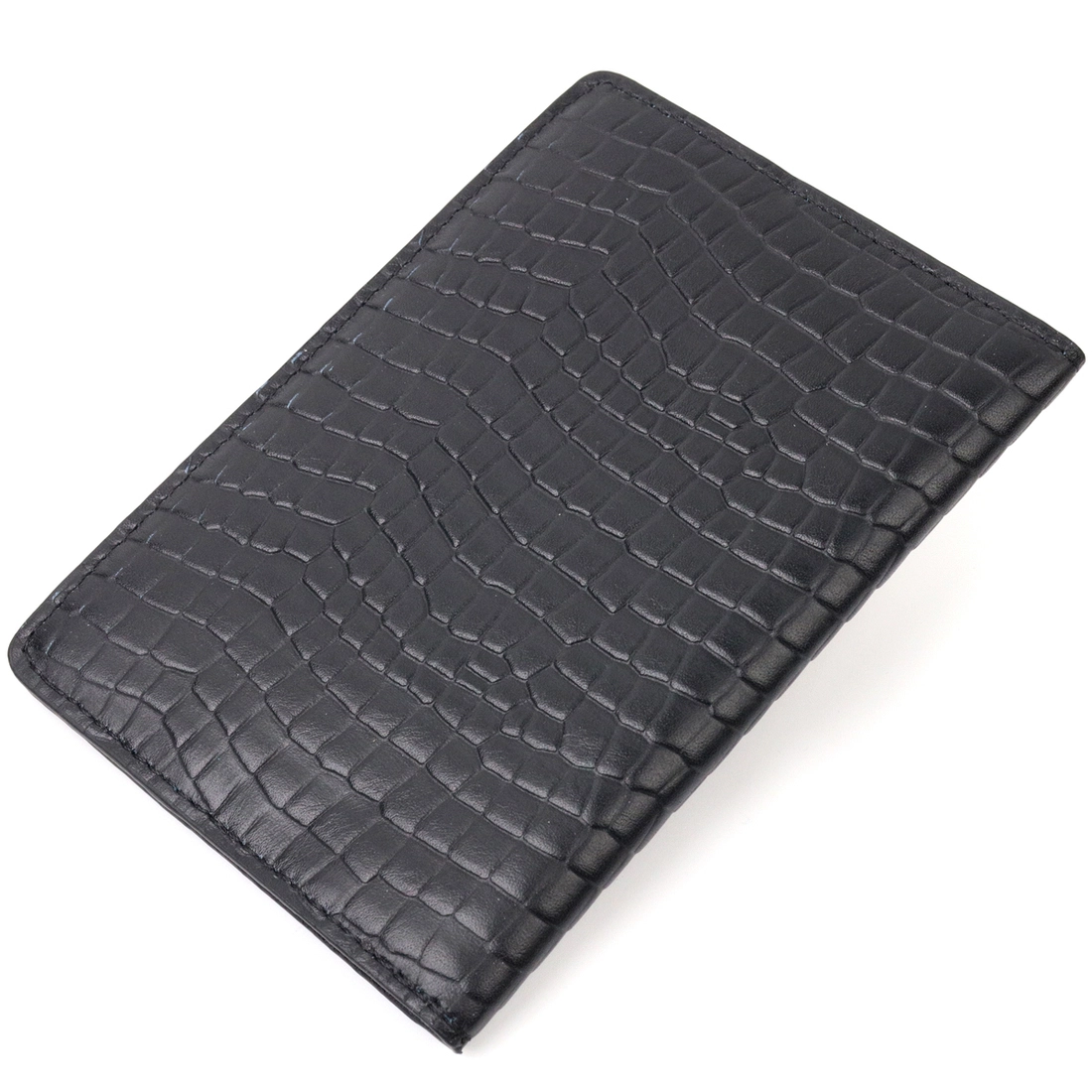 Классическая обложка на паспорт, черного цвета из высококачественной кожи с тиснением под рептилию. Современный высококлассный аксессуар, который станет идеальным подарком для близкого человека по любому поводу. Обложка упакована в фирменную коробочку.