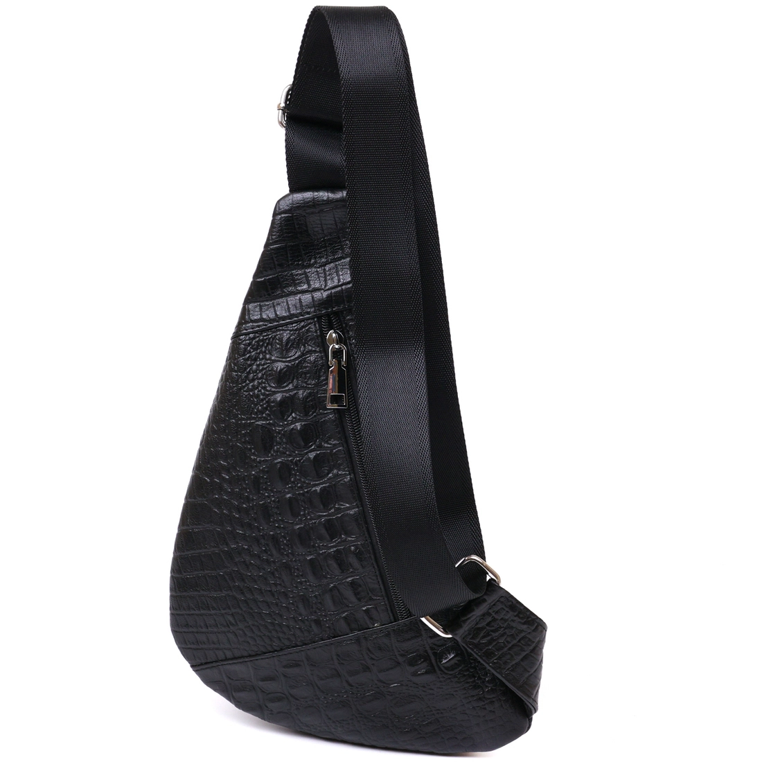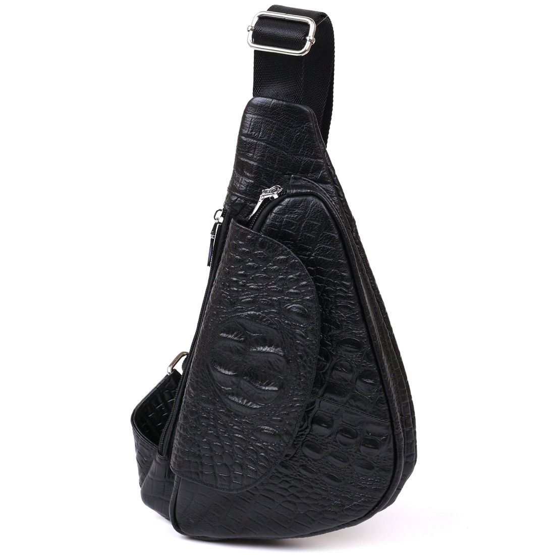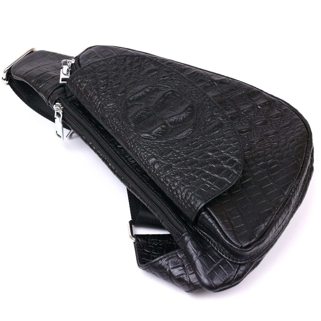 Небольшая сумка через плечо из натуральной высококачественной кожи с тиснением под рептилию. Имеет два вместительных отделения на молнии и дополнительный карман на тыльной стороне. Ремень выполнен из высокопрочного текстиля и может регулироваться по длине. Цвет данной модели – универсальный черный, а значит подойдет под любой цвет одежды.